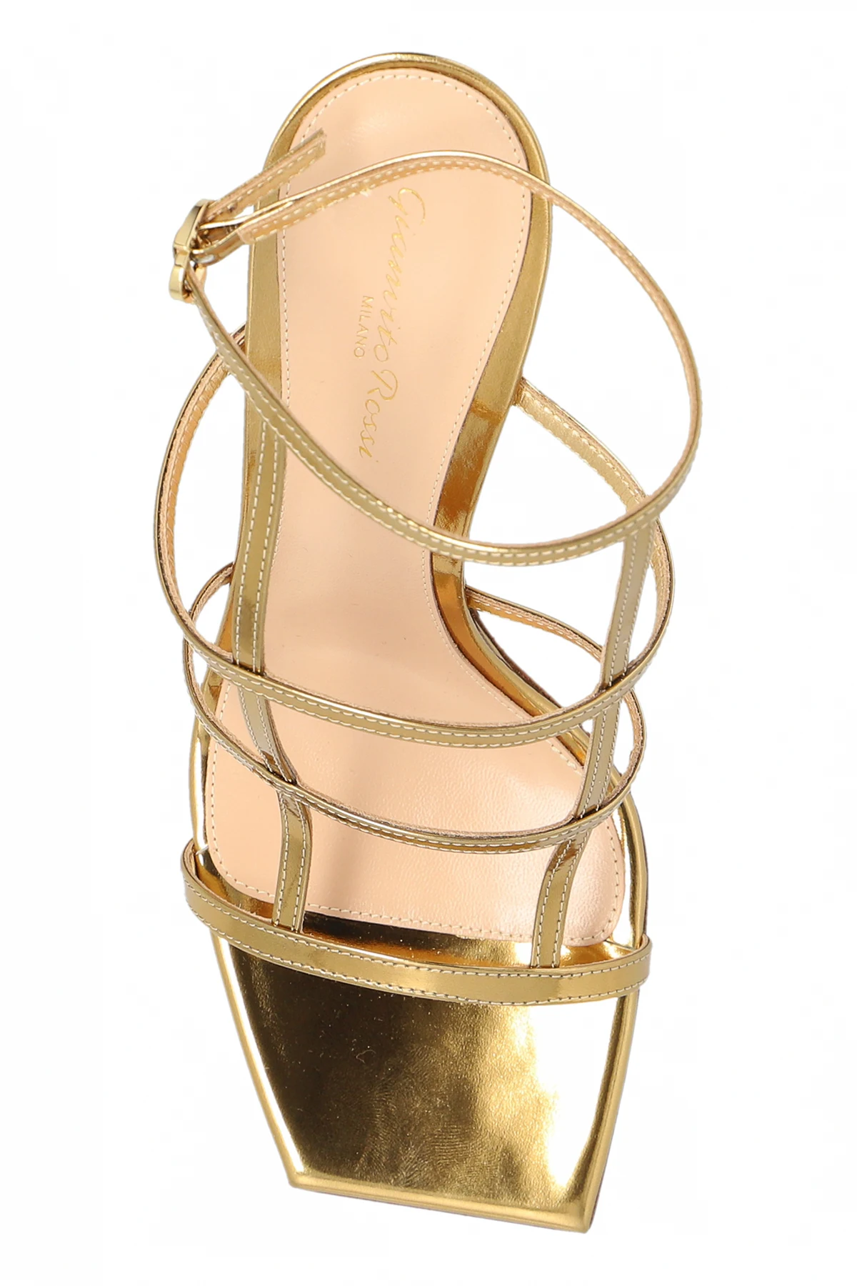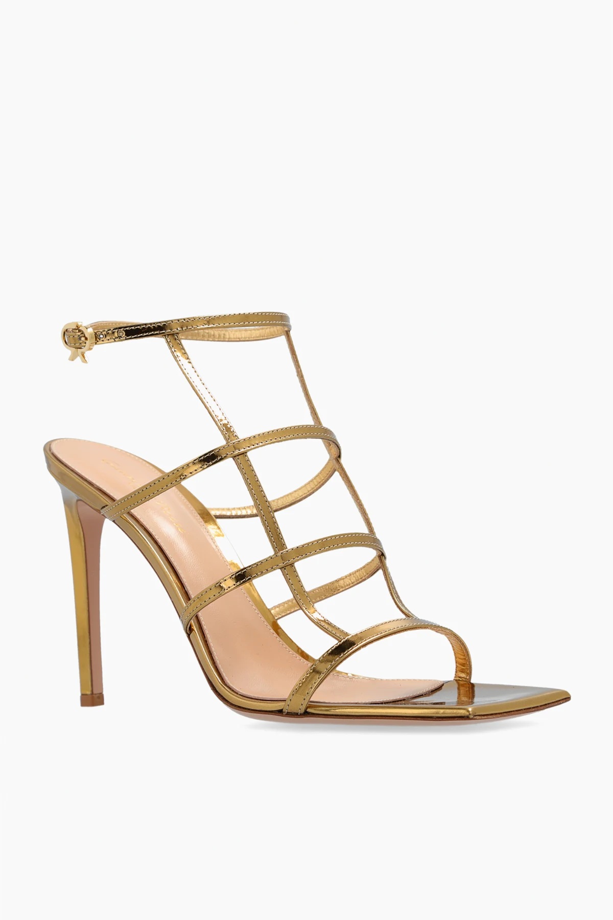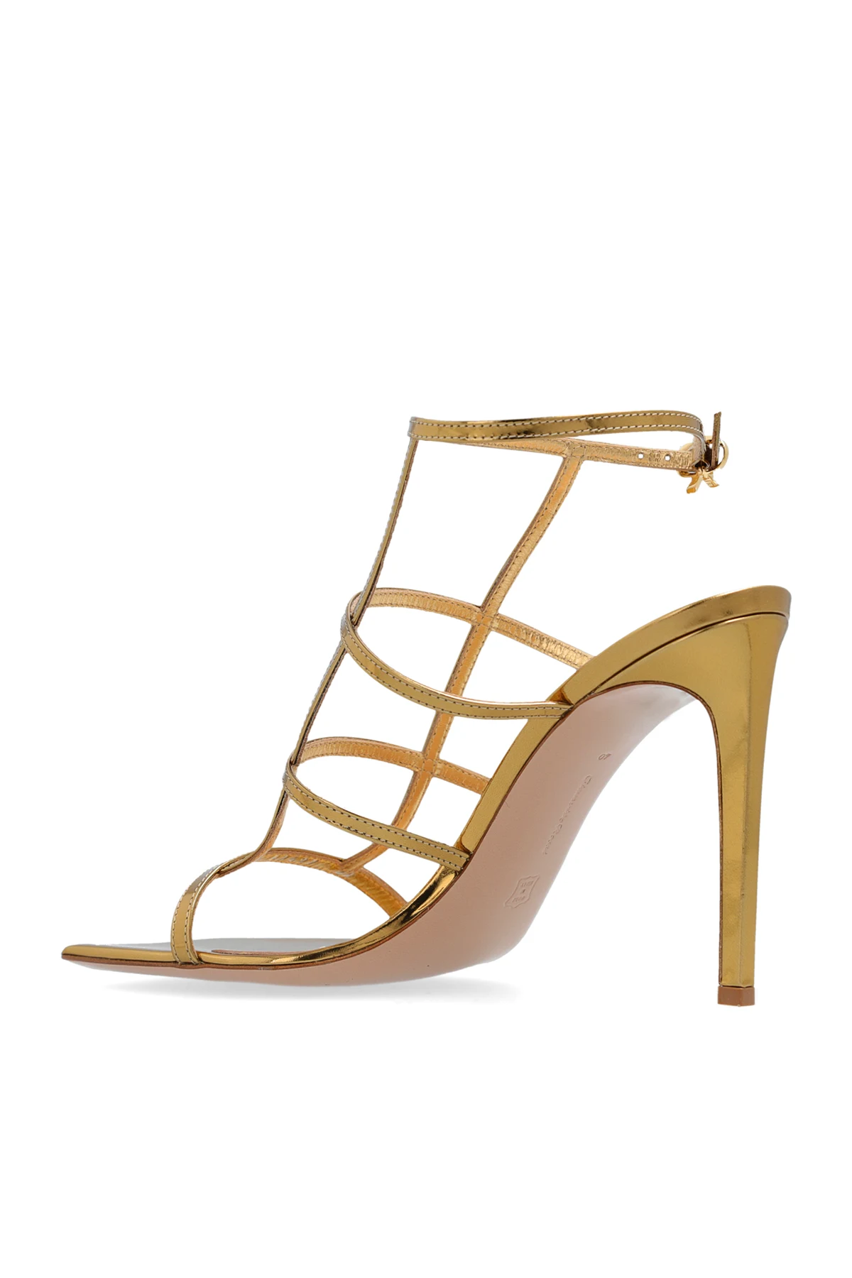 Material: Das glänzende, goldene Material verleiht ihnen einen herausragenden Charakter, und die dünnen, aber stabilen Riemen sowie der klassische Stiletto-Absatz verlängern die Silhouette und fügen Eleganz hinzu.
