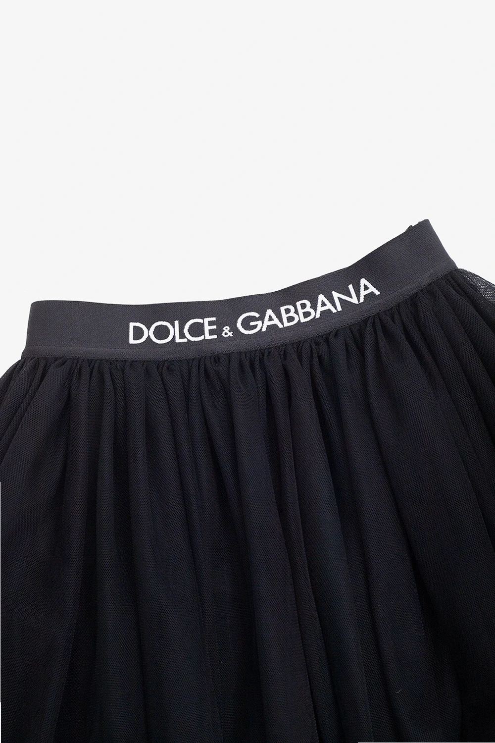 Black skirt from Dolce & Gabbana Kids. Rendered in tulle, this style features a flared hem and an elasticated waistband accentuated with a white logo.