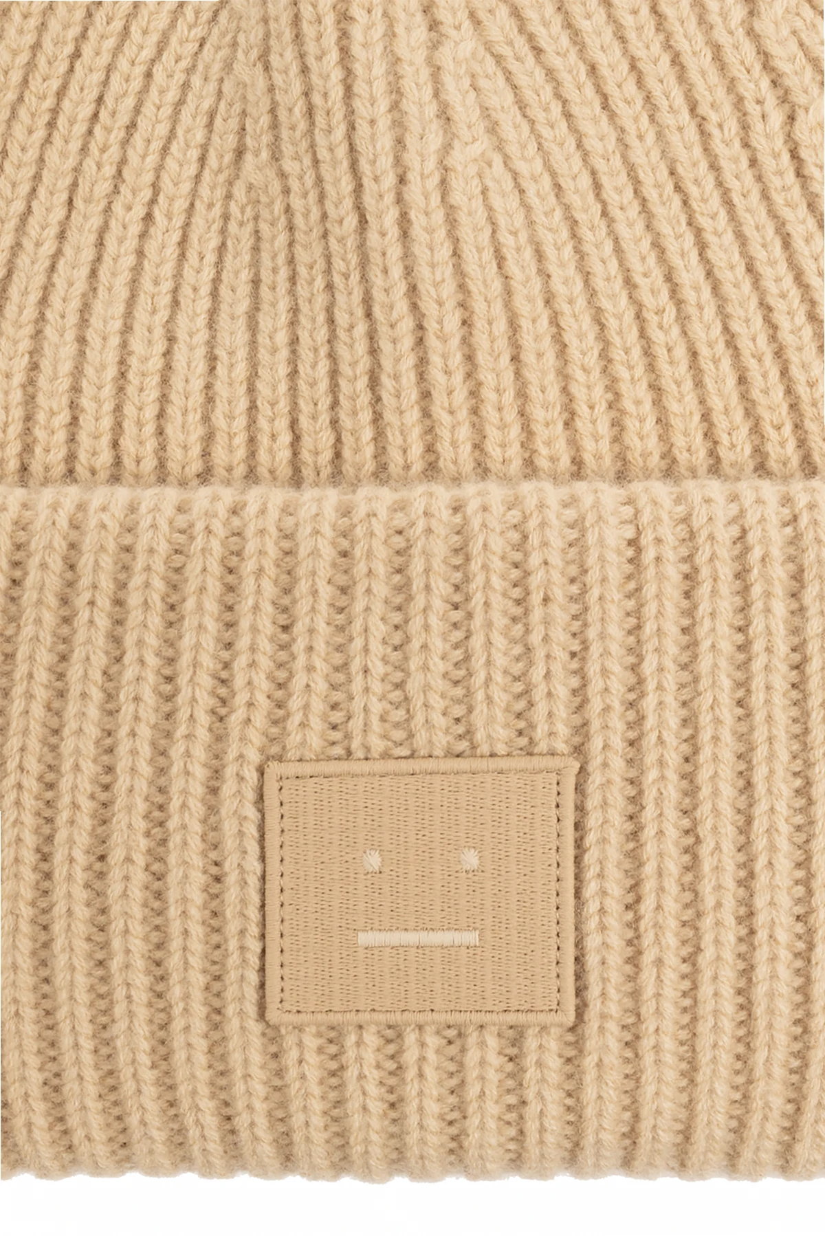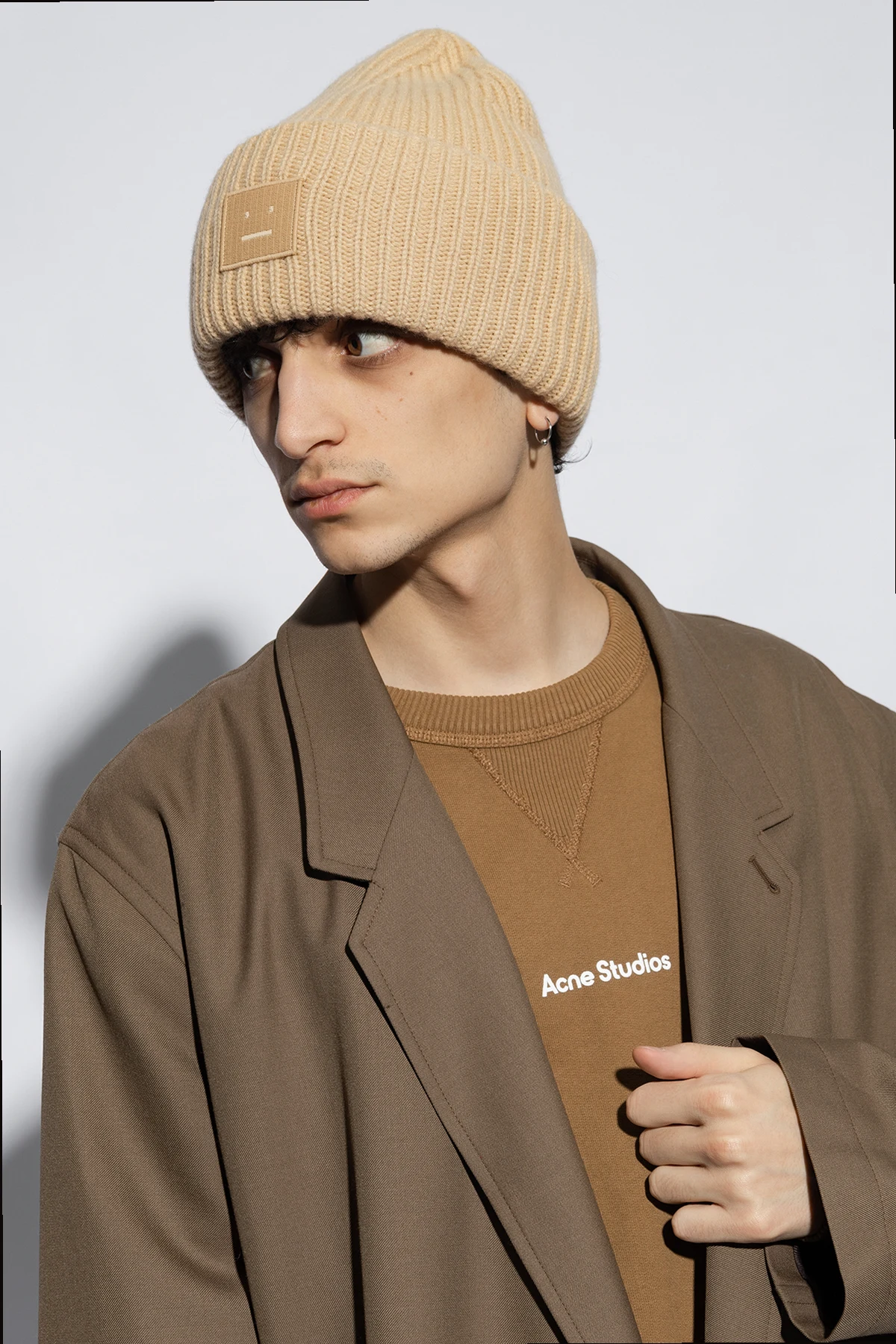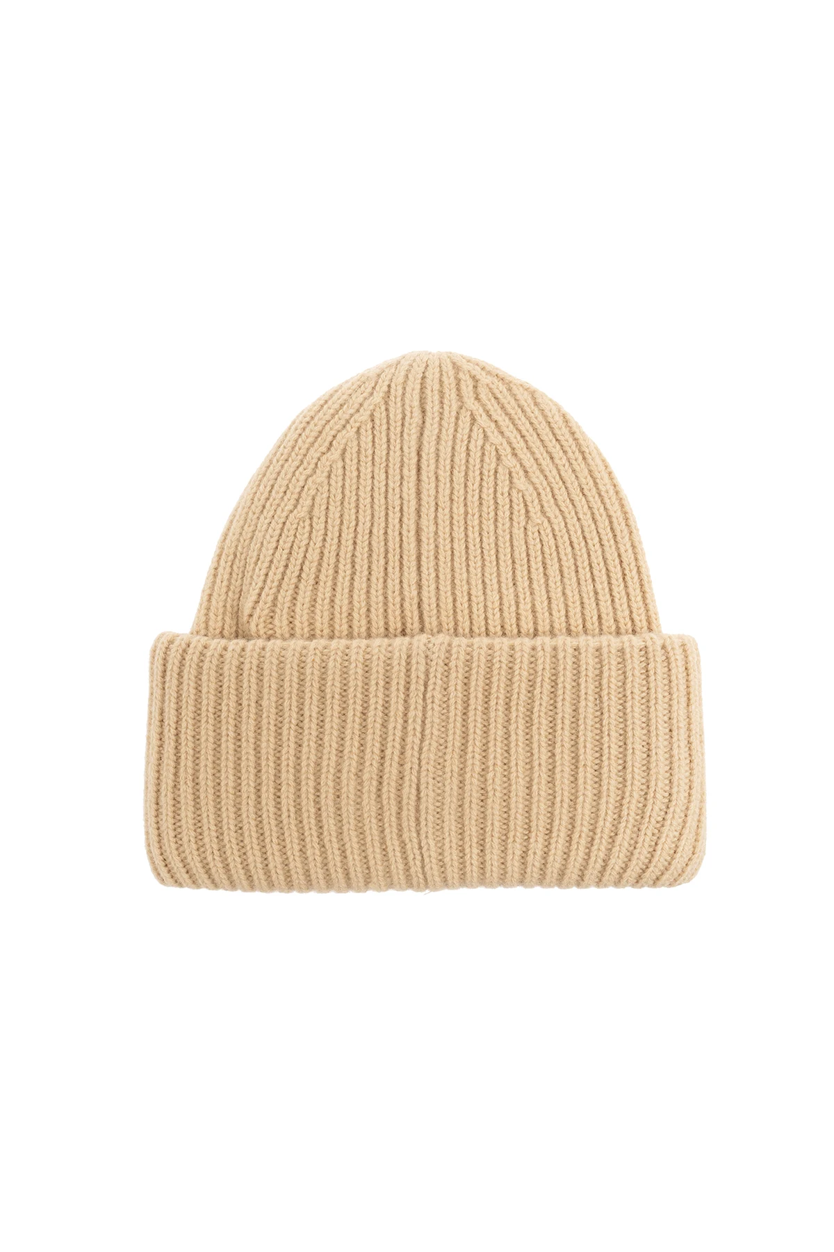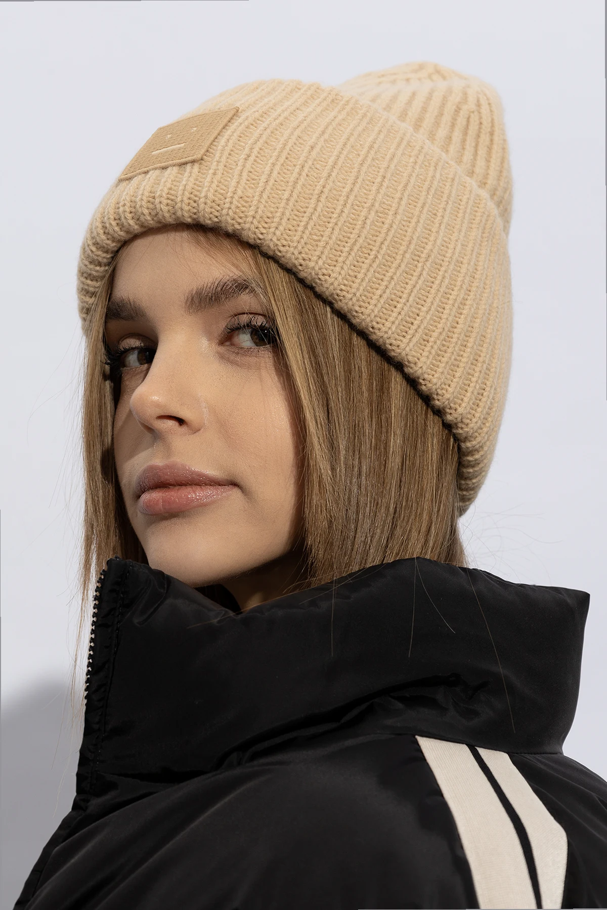 Beige beanie from Acne Studios. Made from wool with a ribbed knit, this item features a logo patch on the front and a turn-up hem.