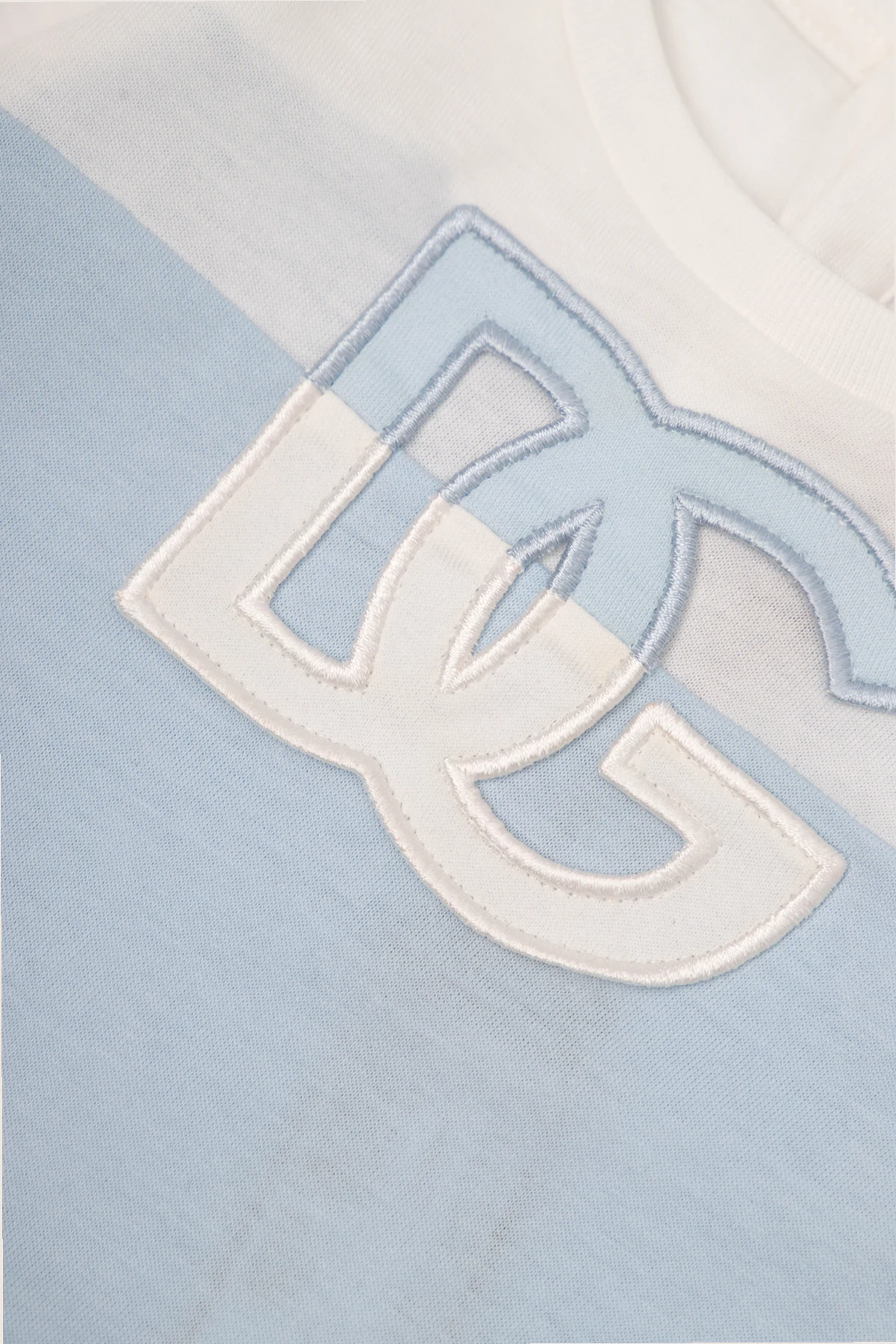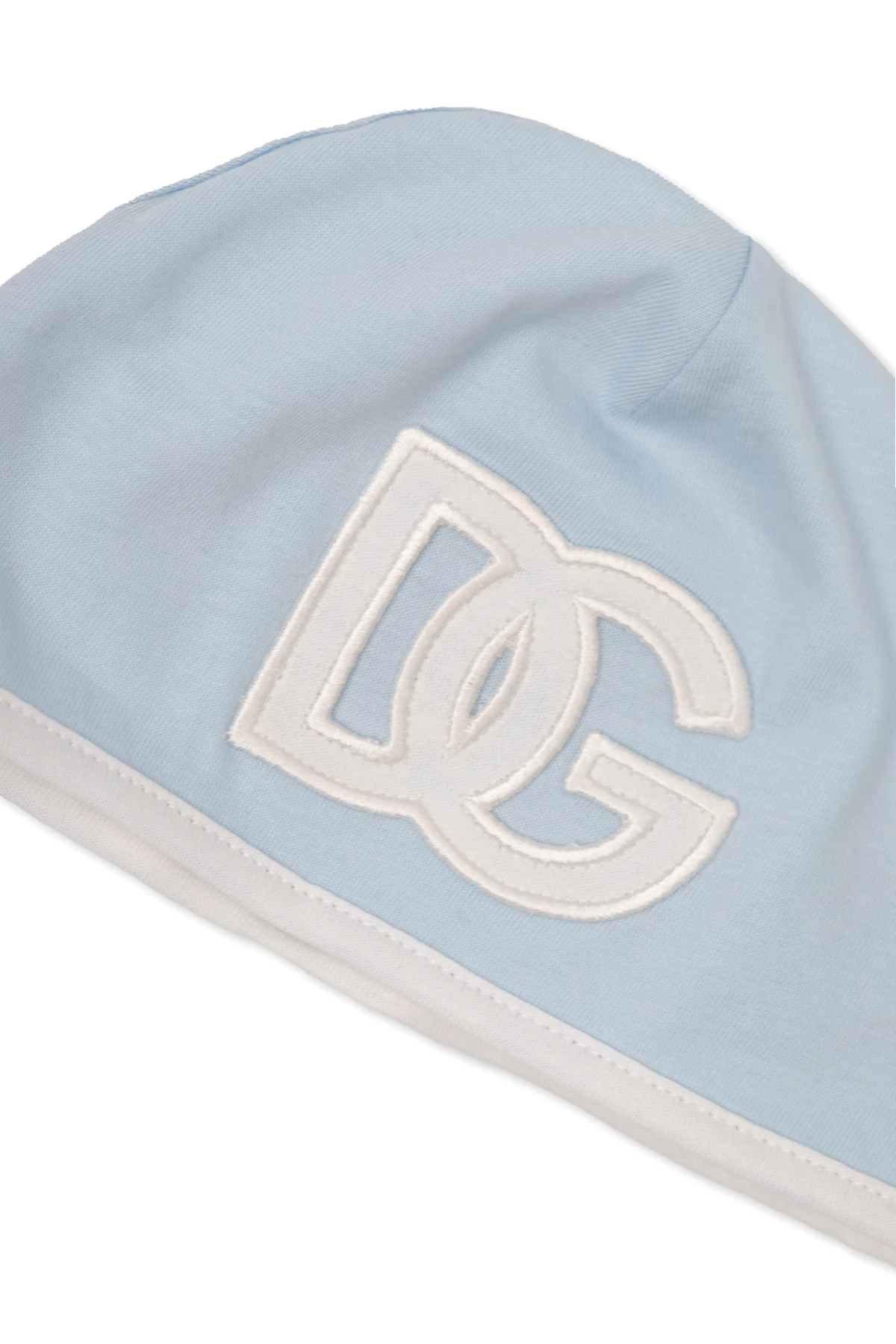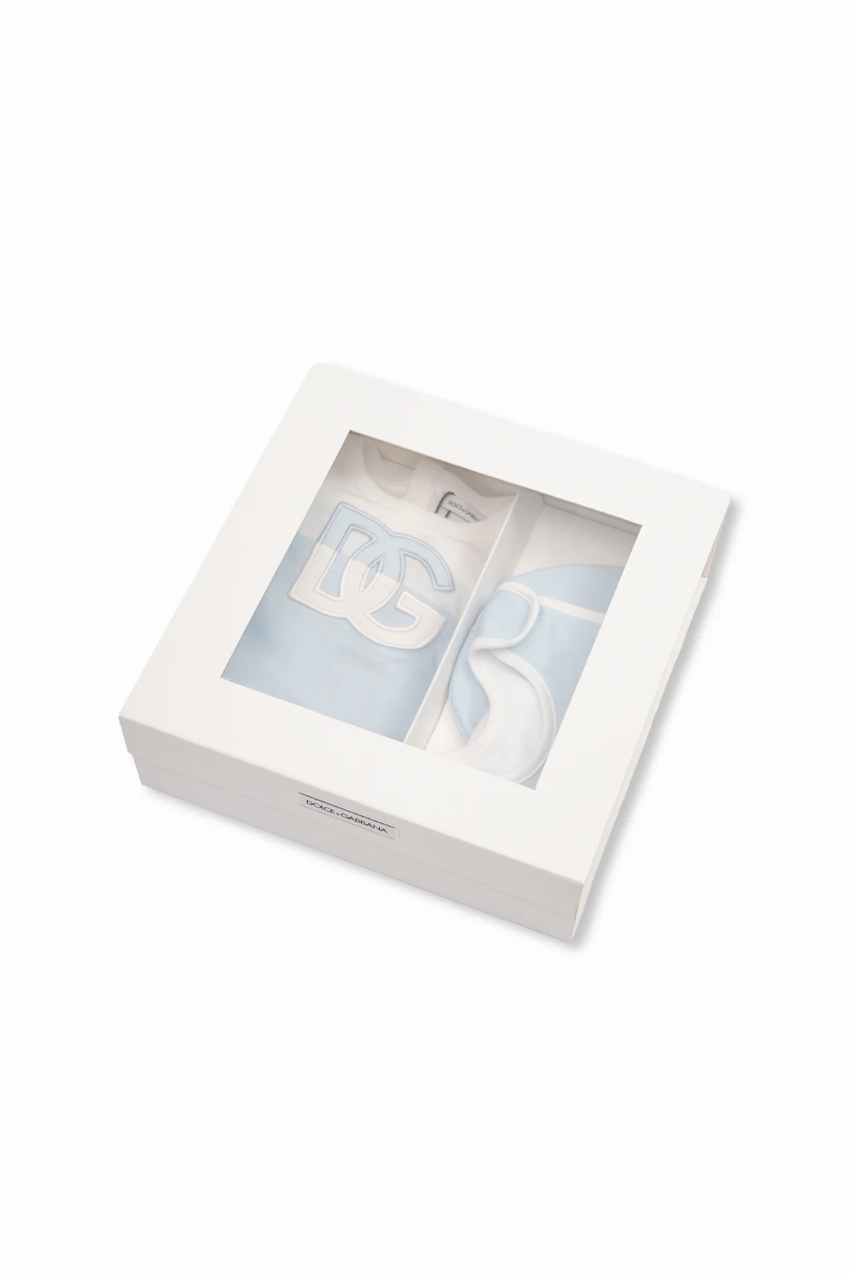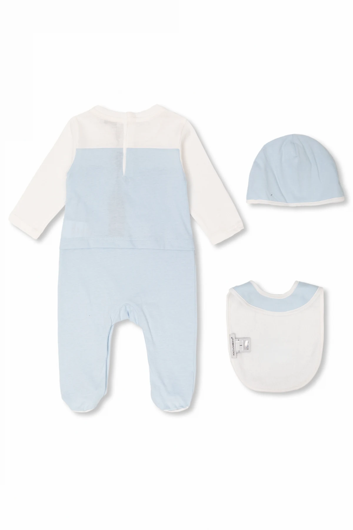 White and light blue baby gift set from Dolce & Gabbana Kids. Made of cotton and embellished with logo patches, it includes a babygrow with a collared neckline, long sleeves and snap closures on the back and bottom, a hat and a bib with a snap closure.