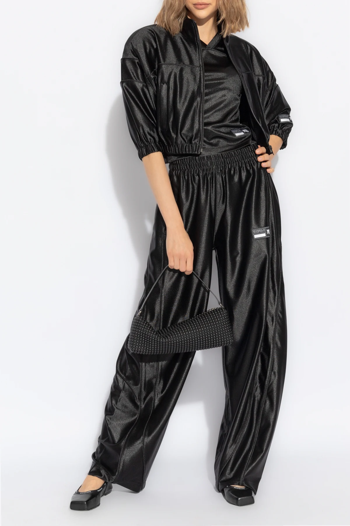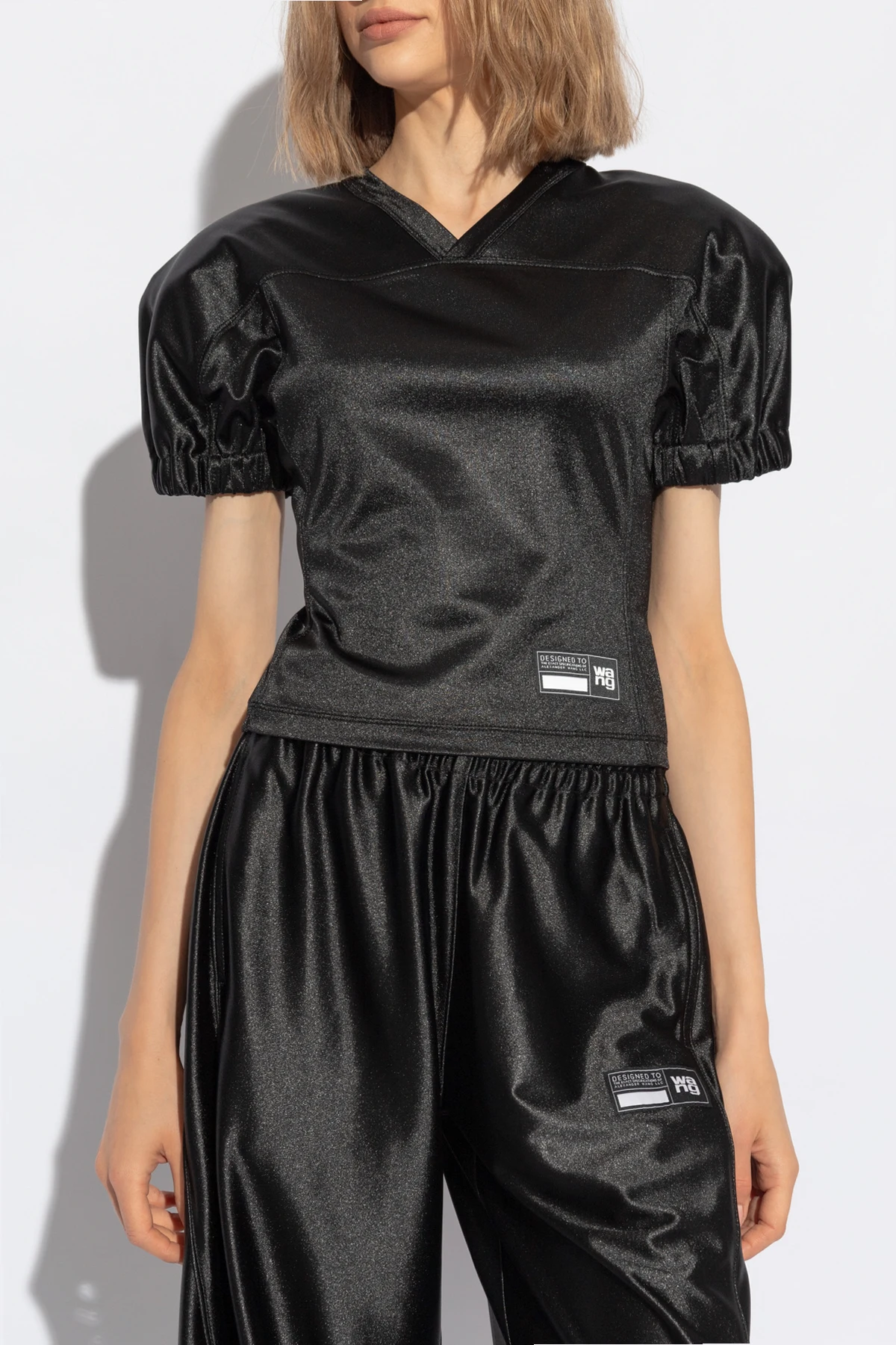 T-Shirt mit V-Ausschnitt von T by Alexander Wang ist die Quintessenz des ausgefeilten Stils, kombiniert mit einem außergewöhnlichen Design. Charakterisiert durch ein tiefes Schwarz, wurde dieses elegante Modell aus ausgewählten Materialien gefertigt, die ihm ein glänzendes Finish verleihen. Der subtile Schimmer des Stoffes kann an Satin oder hochwertige synthetische Seide erinnern und verleiht dem Produkt einen luxuriösen Charakter.