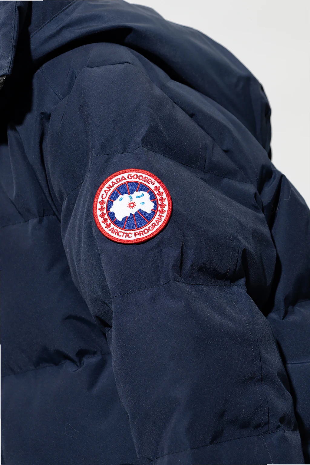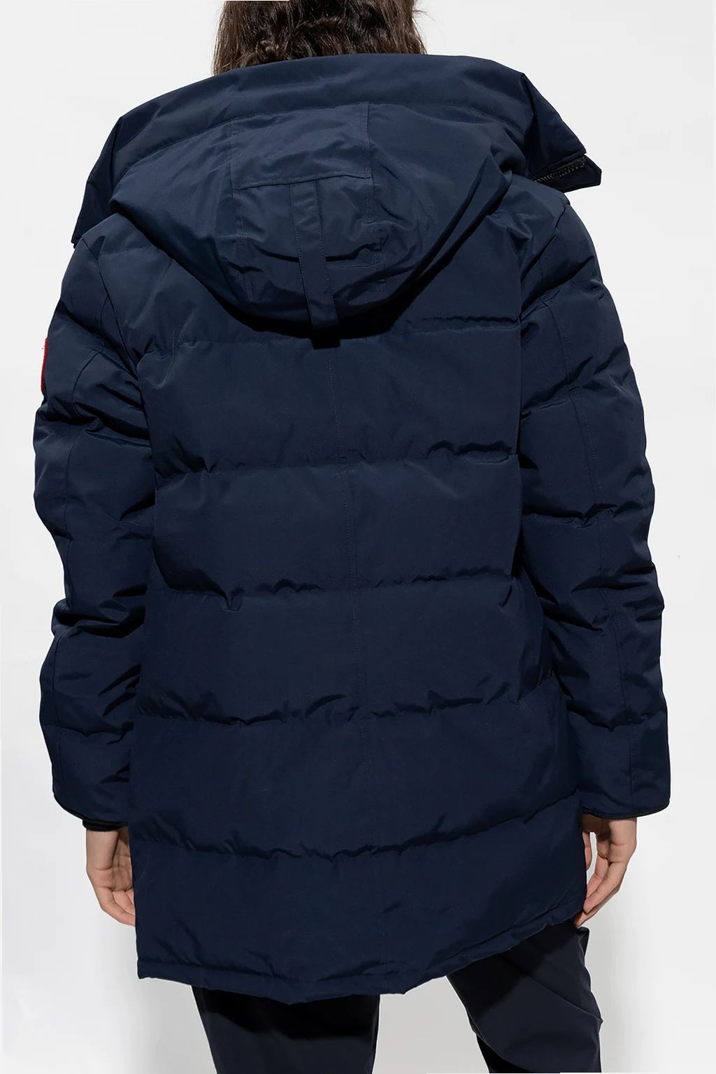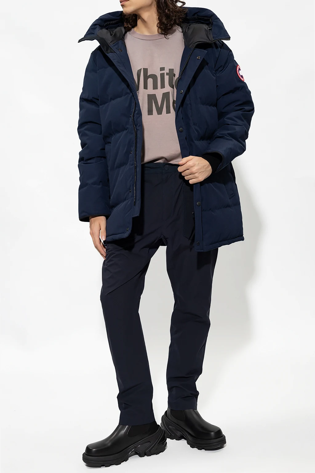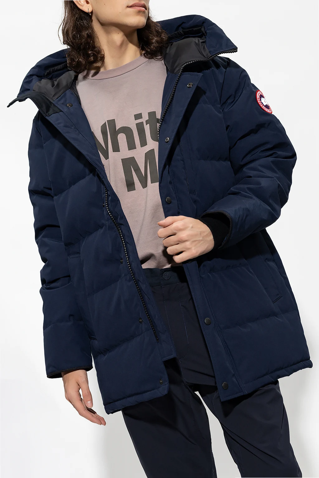 Navy blue ‘Carson’ down jacket from Canada Goose. Emblazoned with a logo patch, this style features a two-way zip fastening, three zip pockets, internal suspenders and long sleeves with elasticated cuffs. Temperature range: -15°C / -25°C.