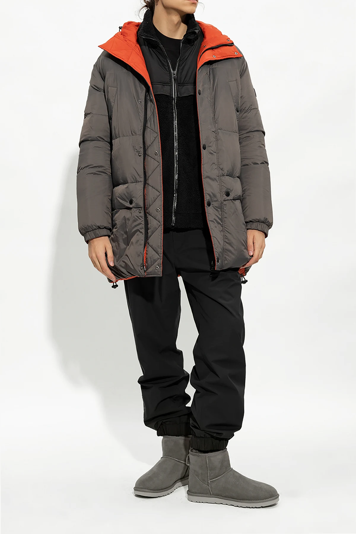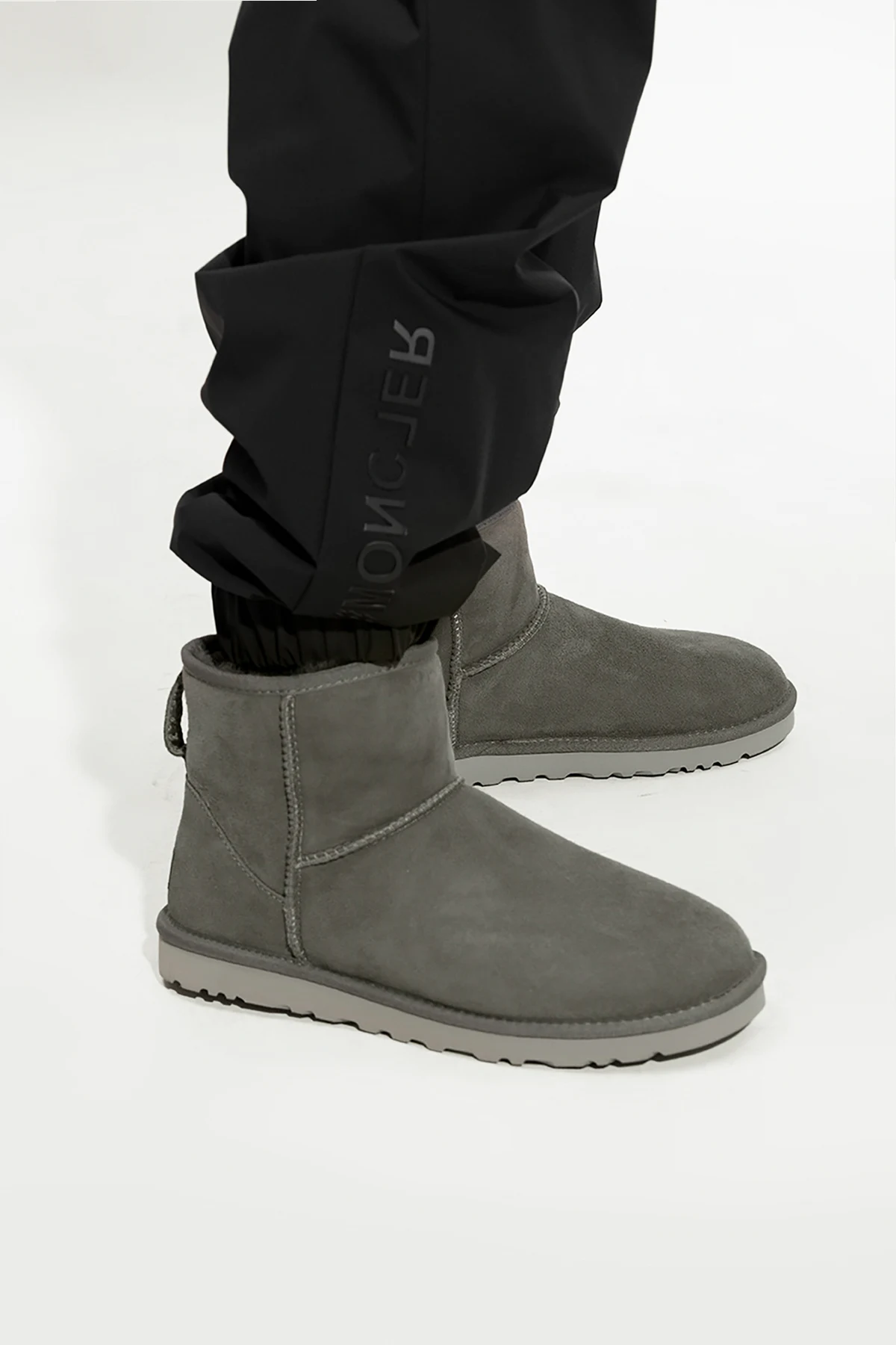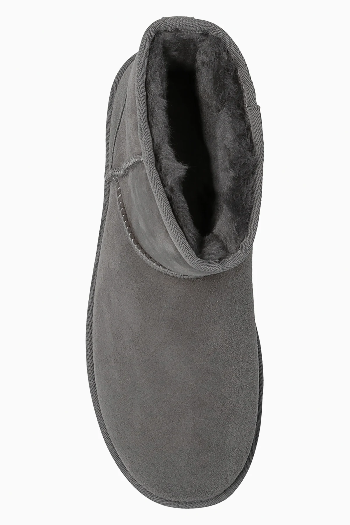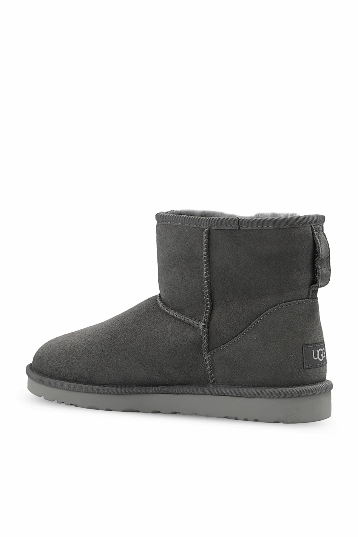 Grey ‘Classic Mini’ snow boots from UGG. Crafted from Twinface sheep leather, this model features a back logo patch, textile binding made from 100% recycled polyester fibers, an UGGplush™ insole and a grey Treadlite by UGG™ EVA foam outsole.