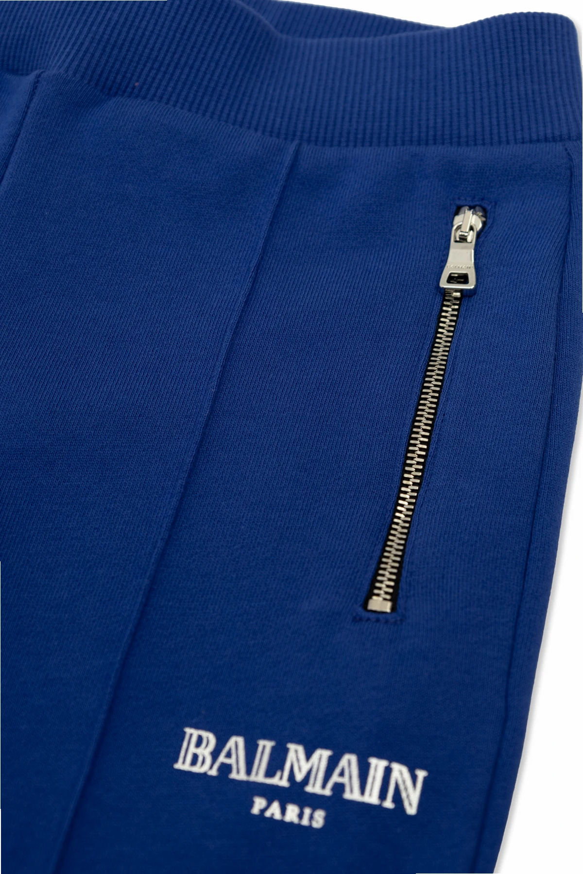 Ein hervorstechendes Merkmal sind die seitlichen Taschen mit dekorativen, metallischen Reißverschlüssen , die sportliche Eleganz hinzufügen. Darüber hinaus unterstreicht der diskret platzierte Schriftzug „BALMAIN PARIS“ über einer der Taschen, ausgeführt in kontrastierendem Weiß, das Prestige der Marke und den exklusiven Charakter des Produkts.