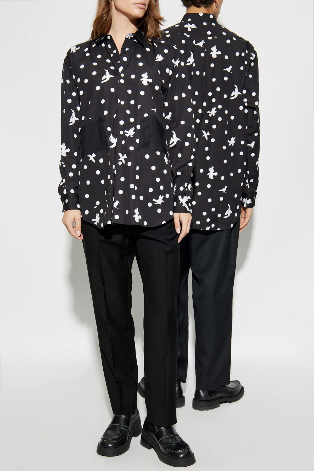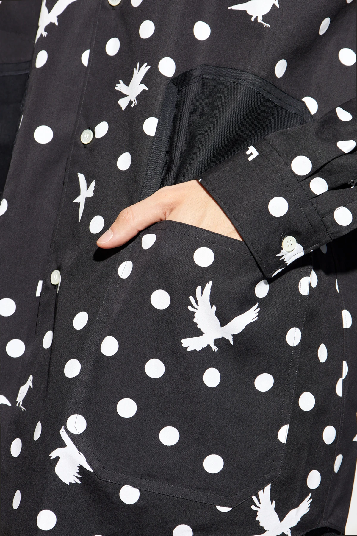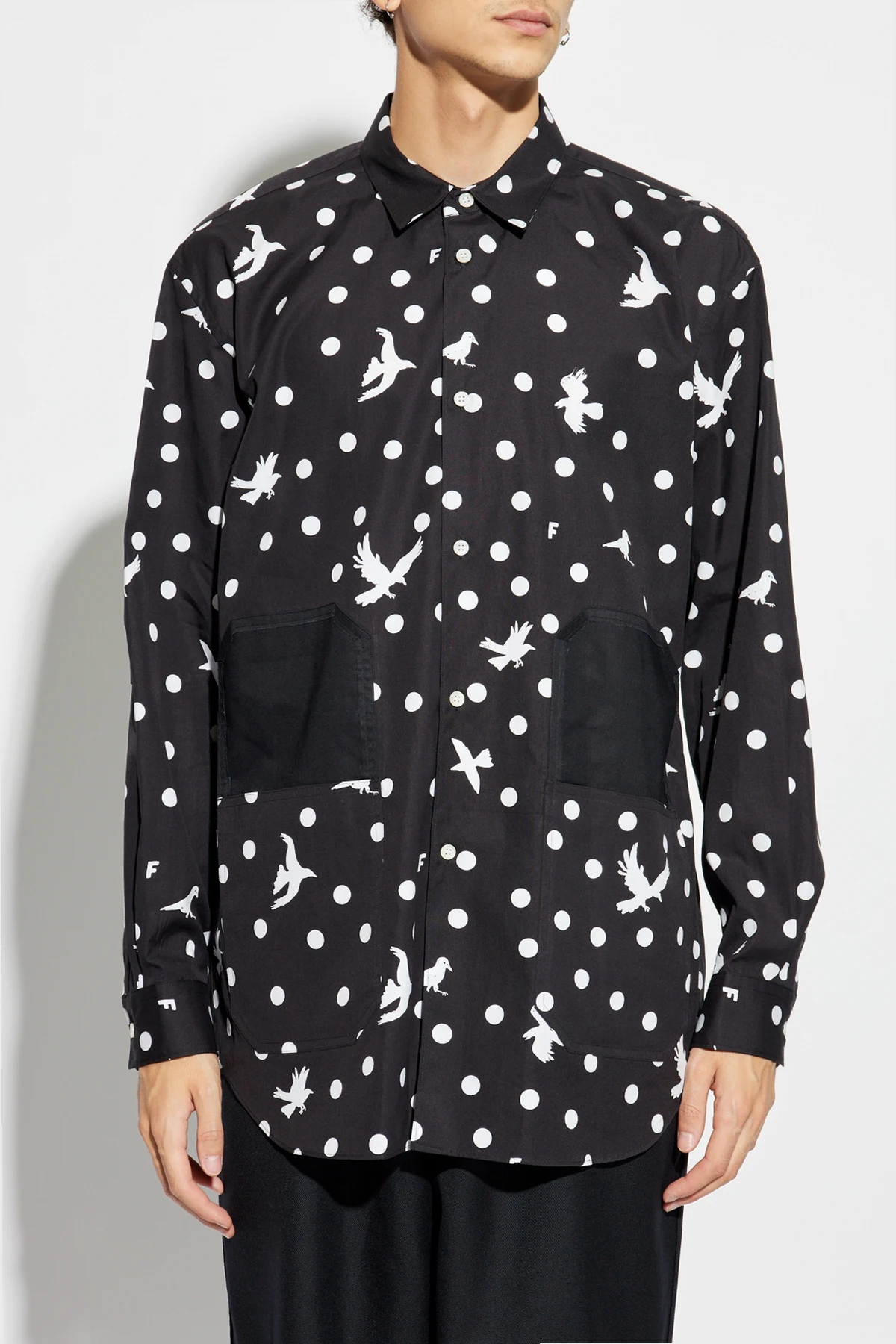 Das einzigartige Muster, bestehend aus weißen Punkten und Silhouetten von Vögeln in verschiedenen Positionen, verleiht dem Hemd ein einzigartiges und künstlerisches Aussehen. Die dominante schwarze Farbe mit kontrastierenden weißen Mustern macht das Hemd elegant und modisch. Auf der Vorderseite befinden sich zwei große, rechteckige Taschen in Schwarz, die auf Taillenhöhe platziert sind.
