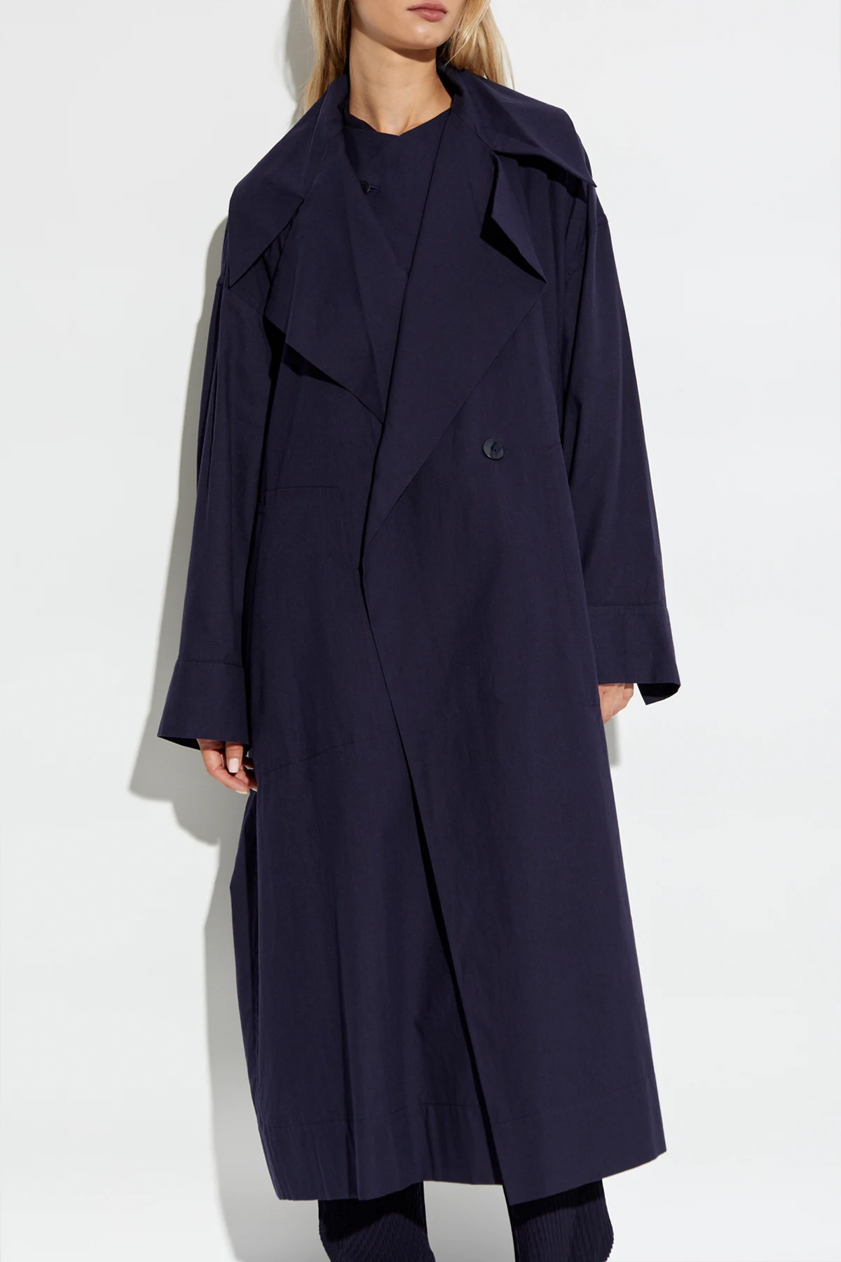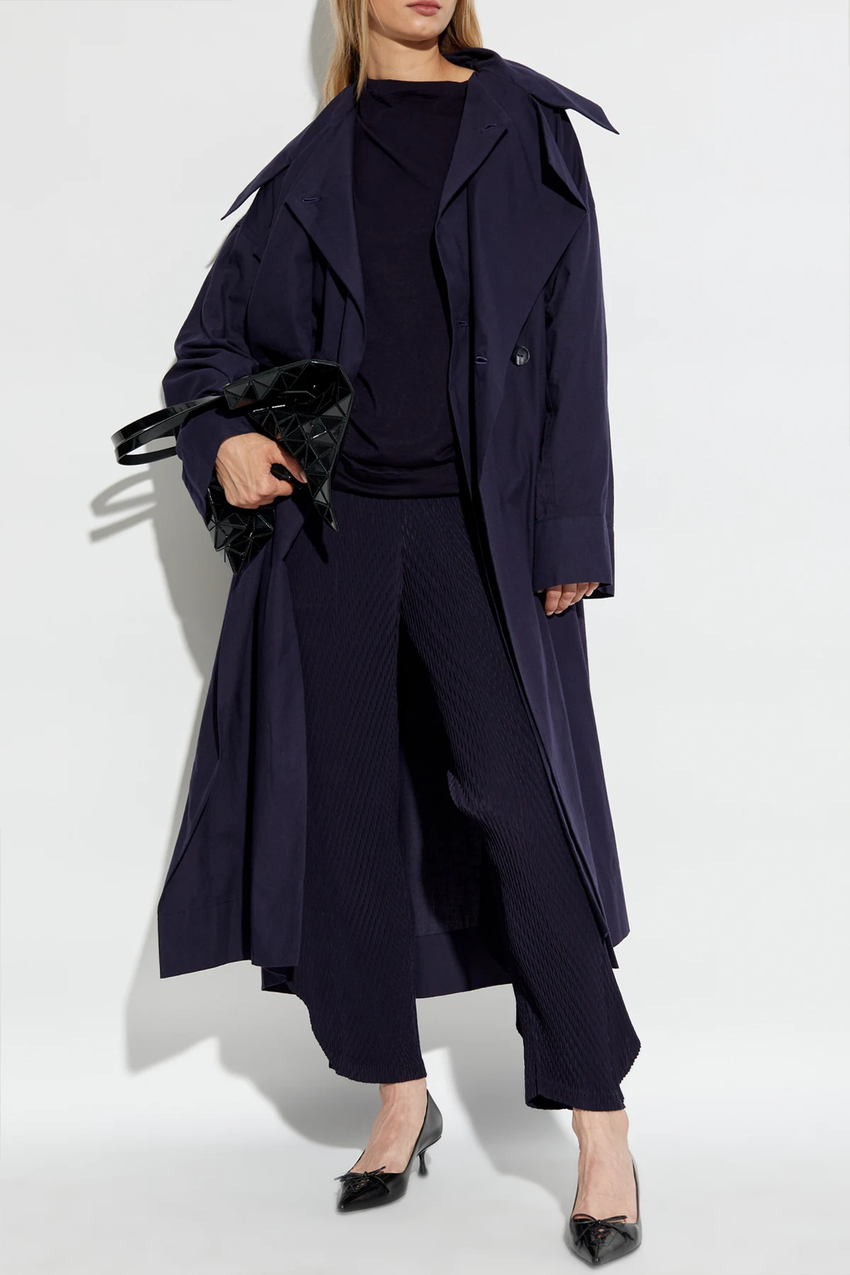 Wir präsentieren einen exklusiven, doppelreihigen Trenchcoat für Damen, entworfen vom renommierten japanischen Designer Issey Miyake . Weltweit bekannt für seine wegweisenden Plissee-Techniken, hat Miyake diesen Trenchcoat für Frauen entworfen, die Eleganz und Funktionalität schätzen.