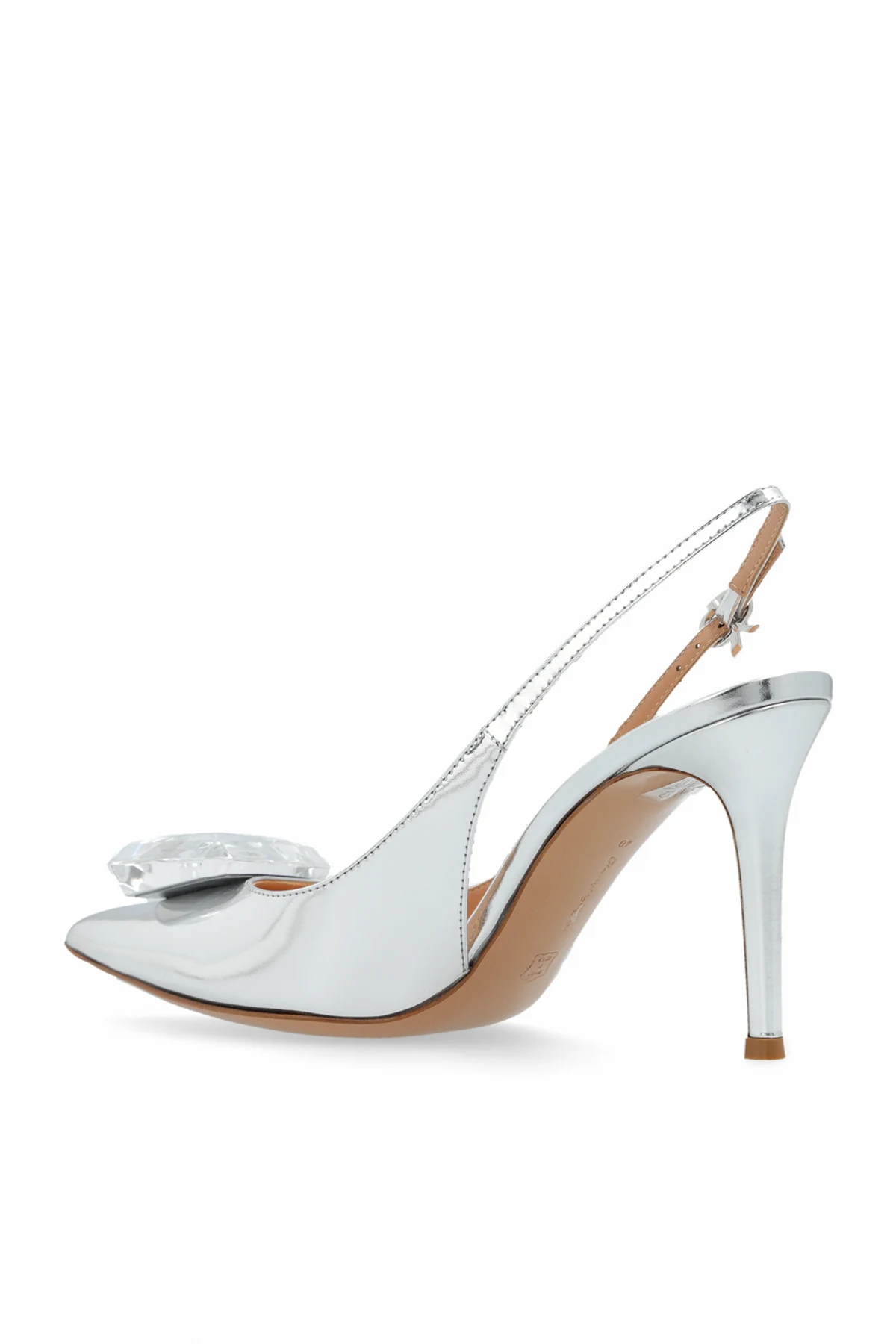 Ein charakteristisches Merkmal dieser Schuhe ist die große, transparente Verzierung in Kristalloptik auf der Vorderseite, die die Blicke auf sich zieht und einen einzigartigen, exklusiven Charakter verleiht. Zudem sorgt die offene Ferse mit verstellbarem Riemen und Metallschnalle für eine perfekte Passform.
