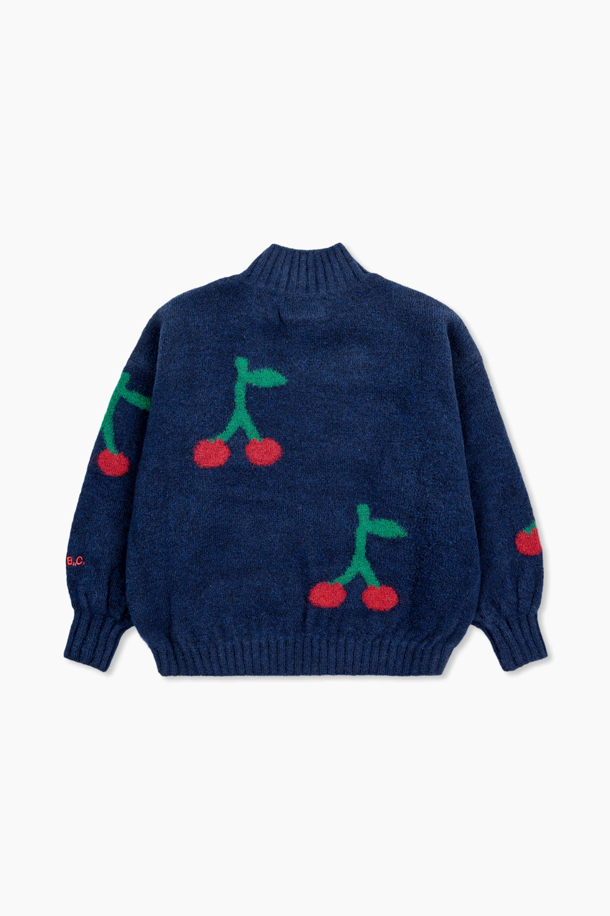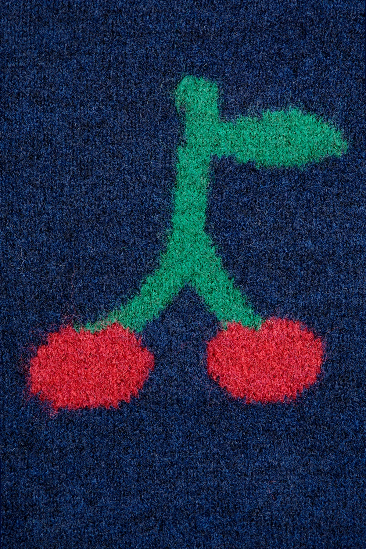 Wir präsentieren den Kirsch-Motiv-Pullover aus der exklusiven Mädchenkollektion der renommierten Marke Bobo Choses . Dieser einzigartige Pullover, gehalten in elegantem Marineblau, ist mit charmanten roten Kirschen mit grünen Stielen und Blättern verziert, die über die gesamte Oberfläche des Pullovers und seine Ärmel verteilt sind.