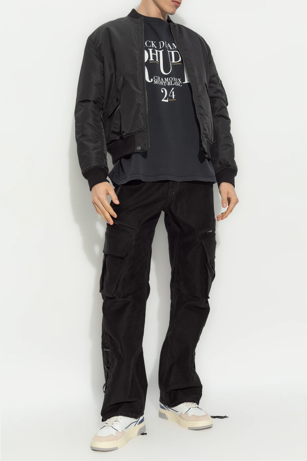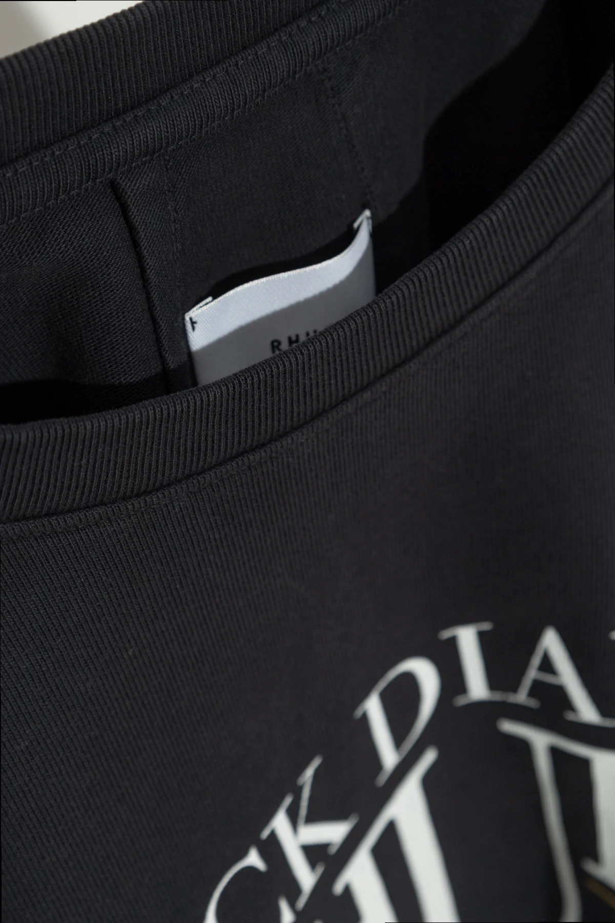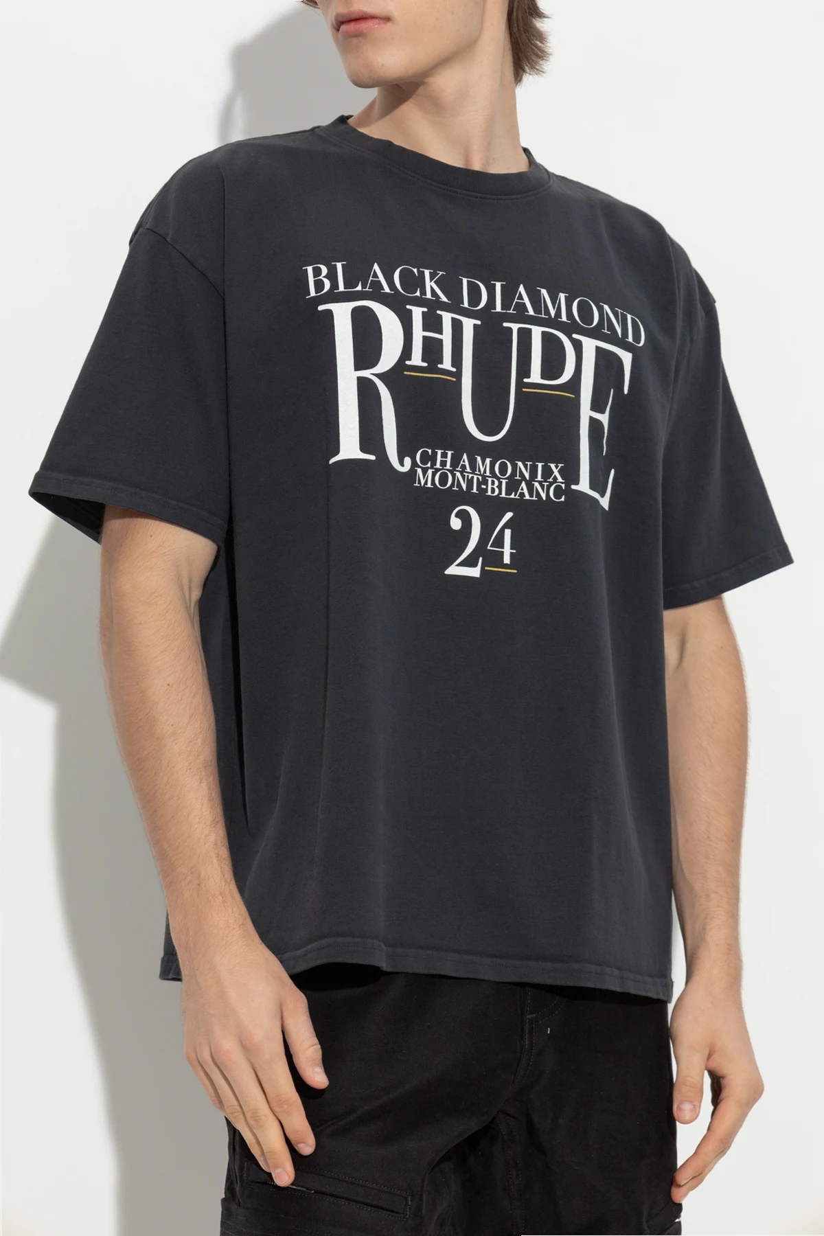 Ein charakteristisches Element dieses Produktes ist der beeindruckende Druck auf der Vorderseite, der den Text " BLACK DIAMOND RHUDE CHAMONIX MONTBLANC 24 " in einem kontrastierenden Weiß zeigt. Seine dominante Präsenz auf dem Stoff zieht die Blicke auf sich und macht das T-Shirt nicht nur zu einem Kleidungsstück, sondern zu einem ausdrucksstarken Statement Piece.