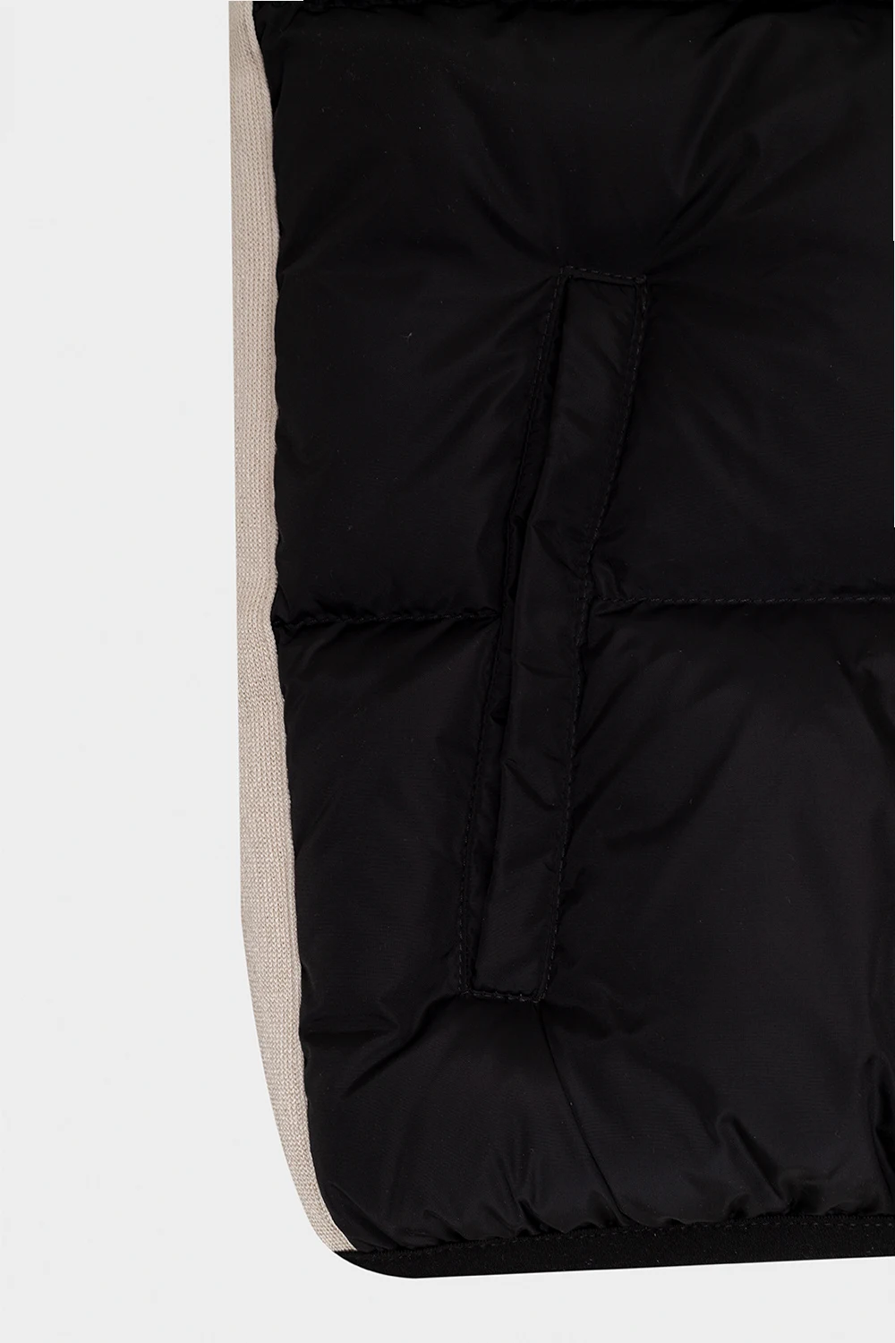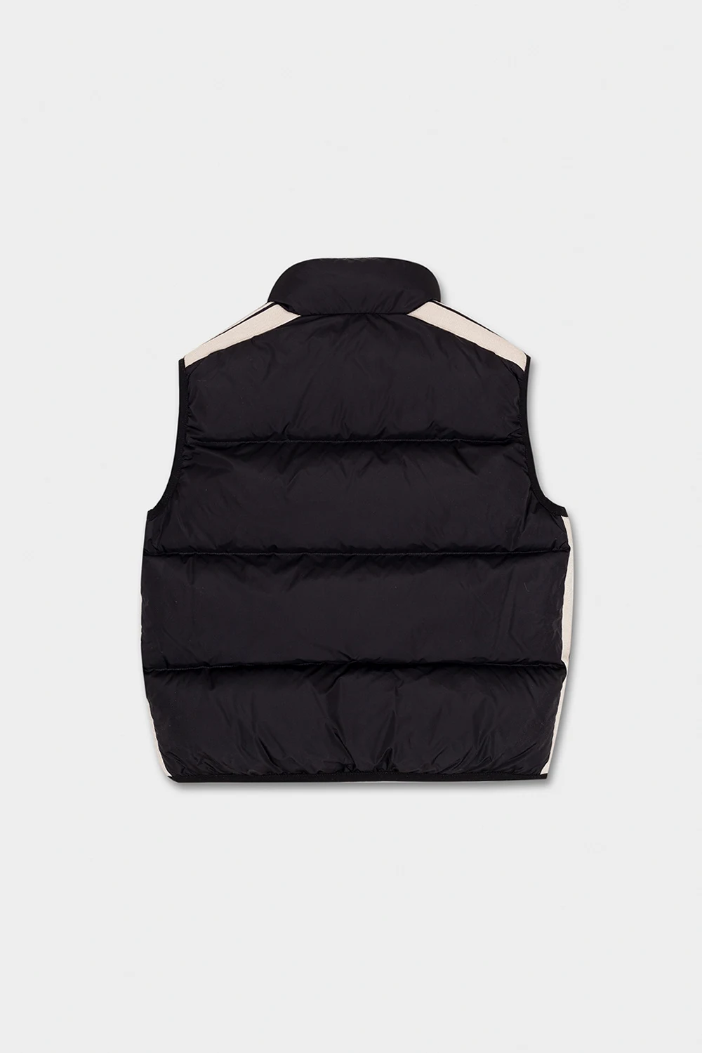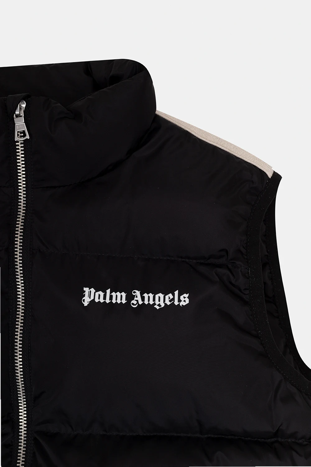 Black insulated quilted vest from Palm Angels Kids. Accentuated with cream and black stripes on the sides, this style features a mock neck, a zip fastening and two frontal slip pockets accompanied by a white logo print.