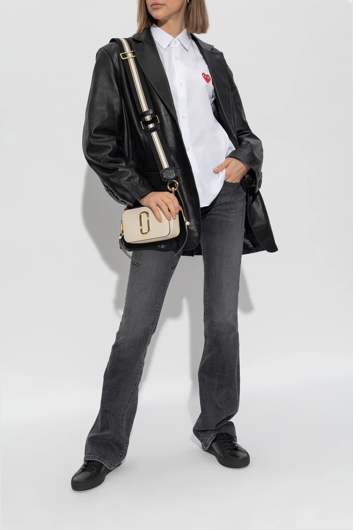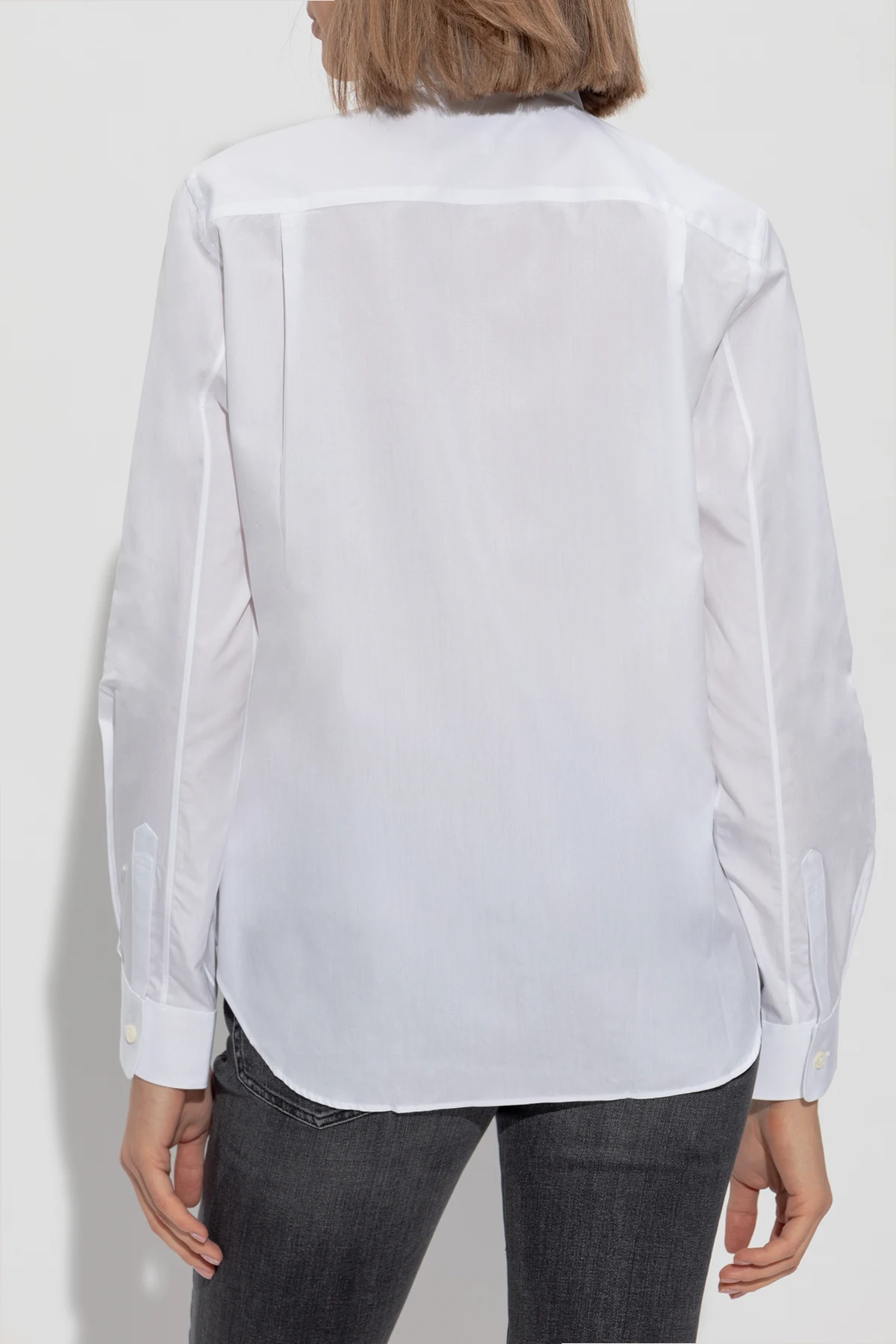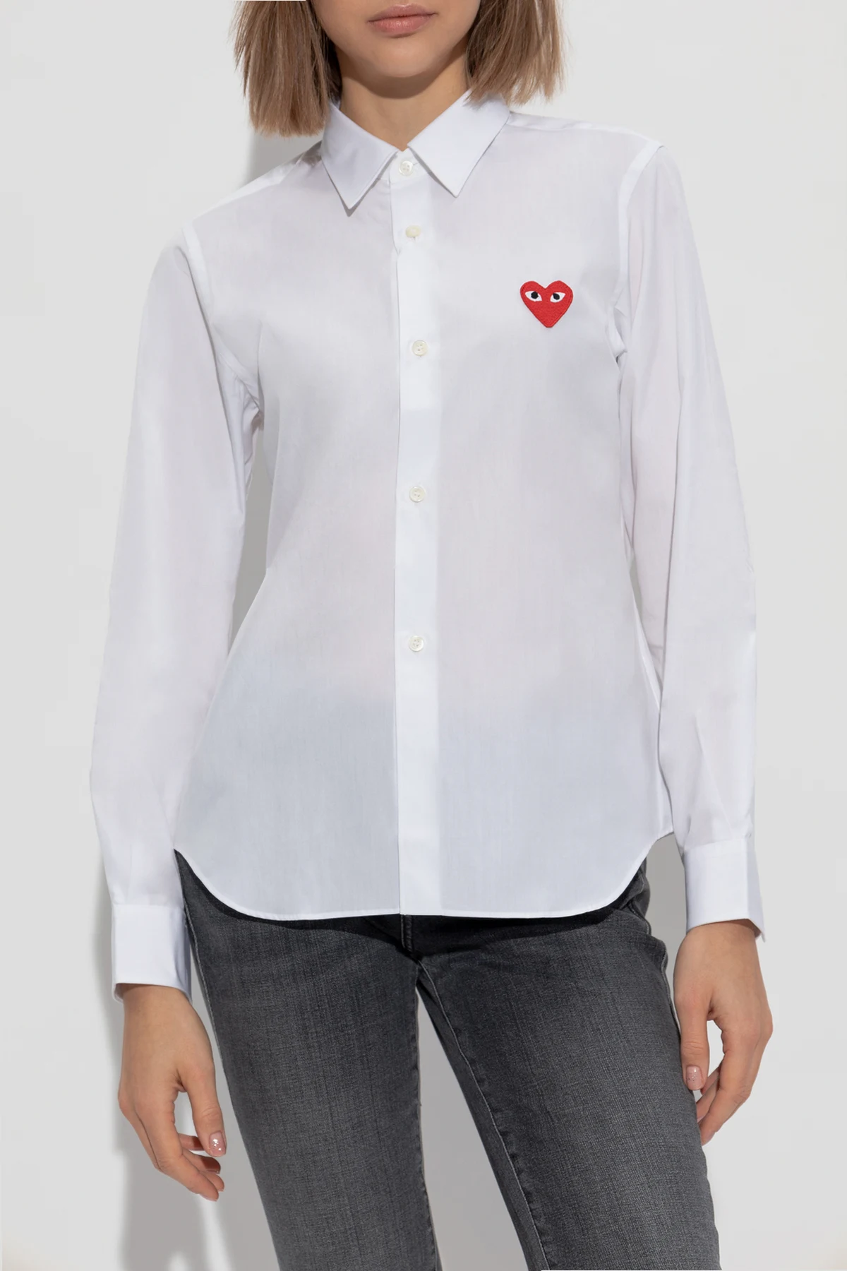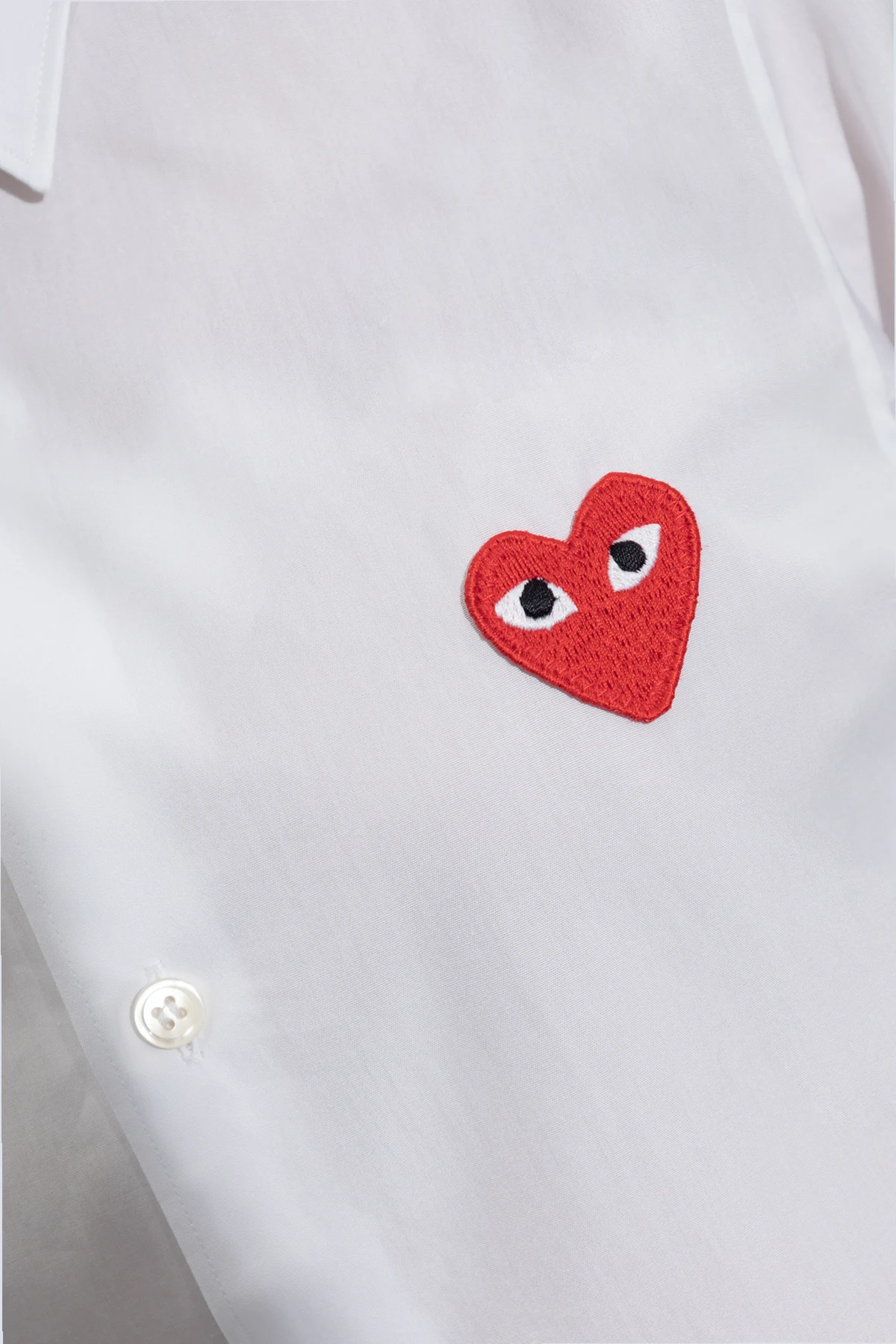 Classic white cotton shirt from Comme des Garçons Play. Button fastening. Appliqued red logo at front. Long sleeves. Button cuffs.