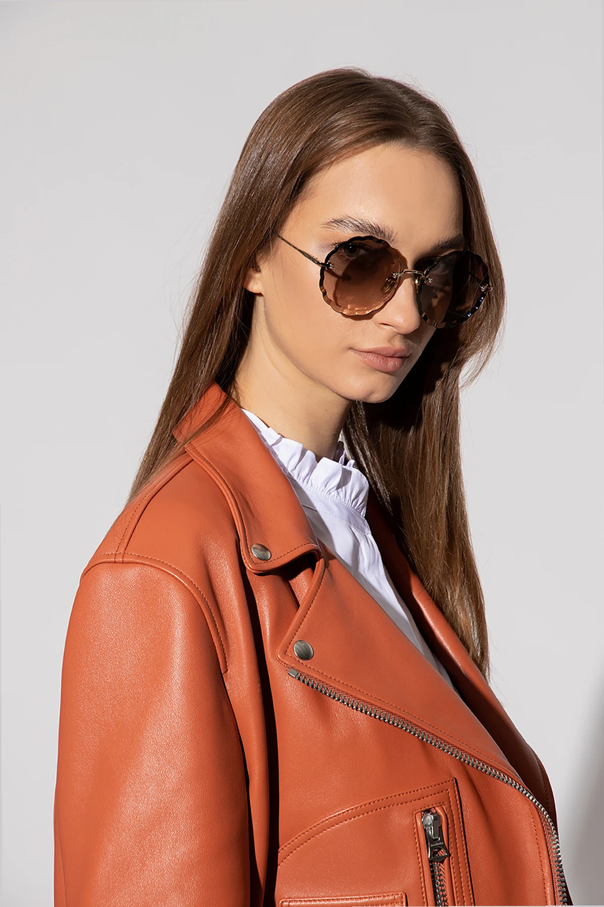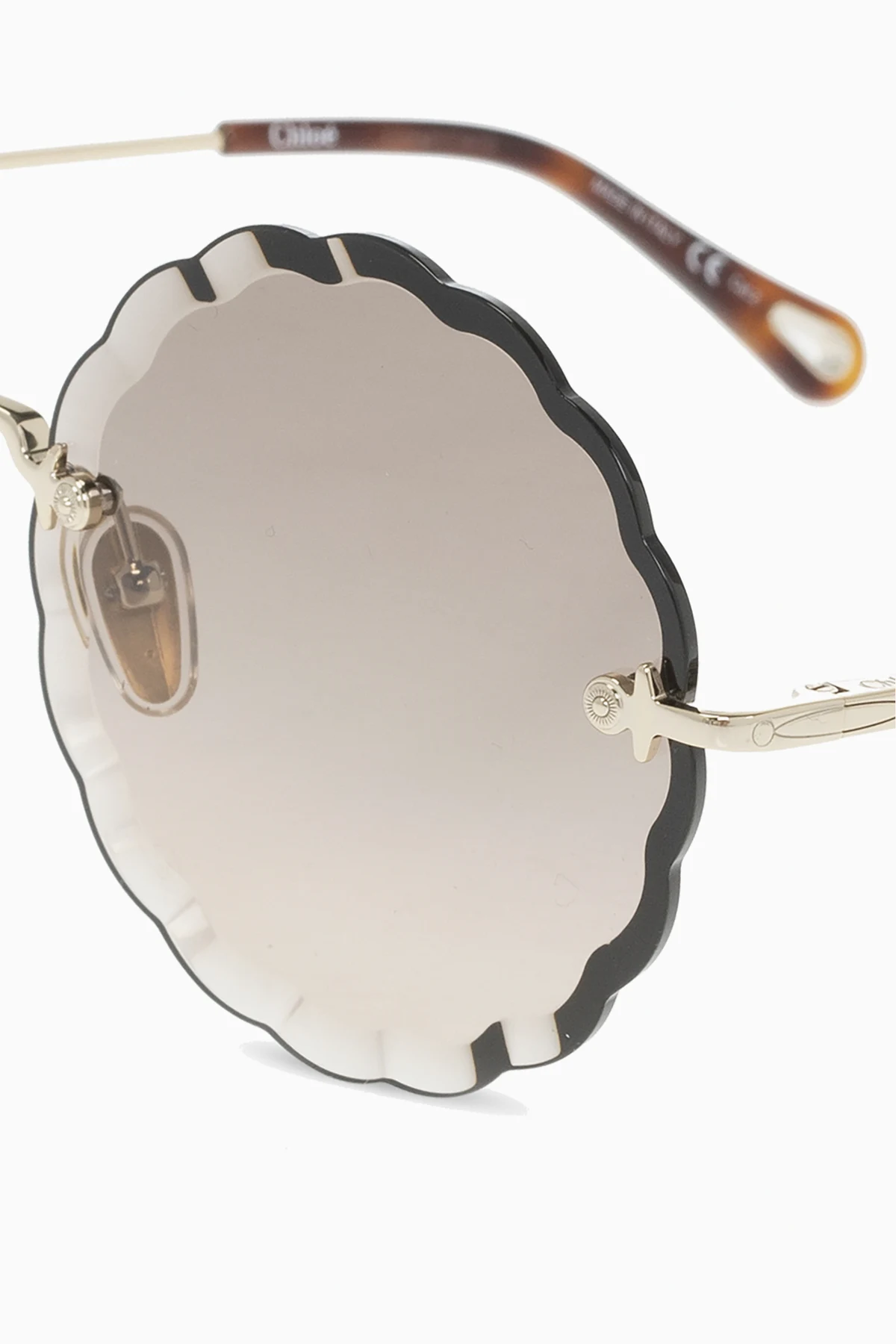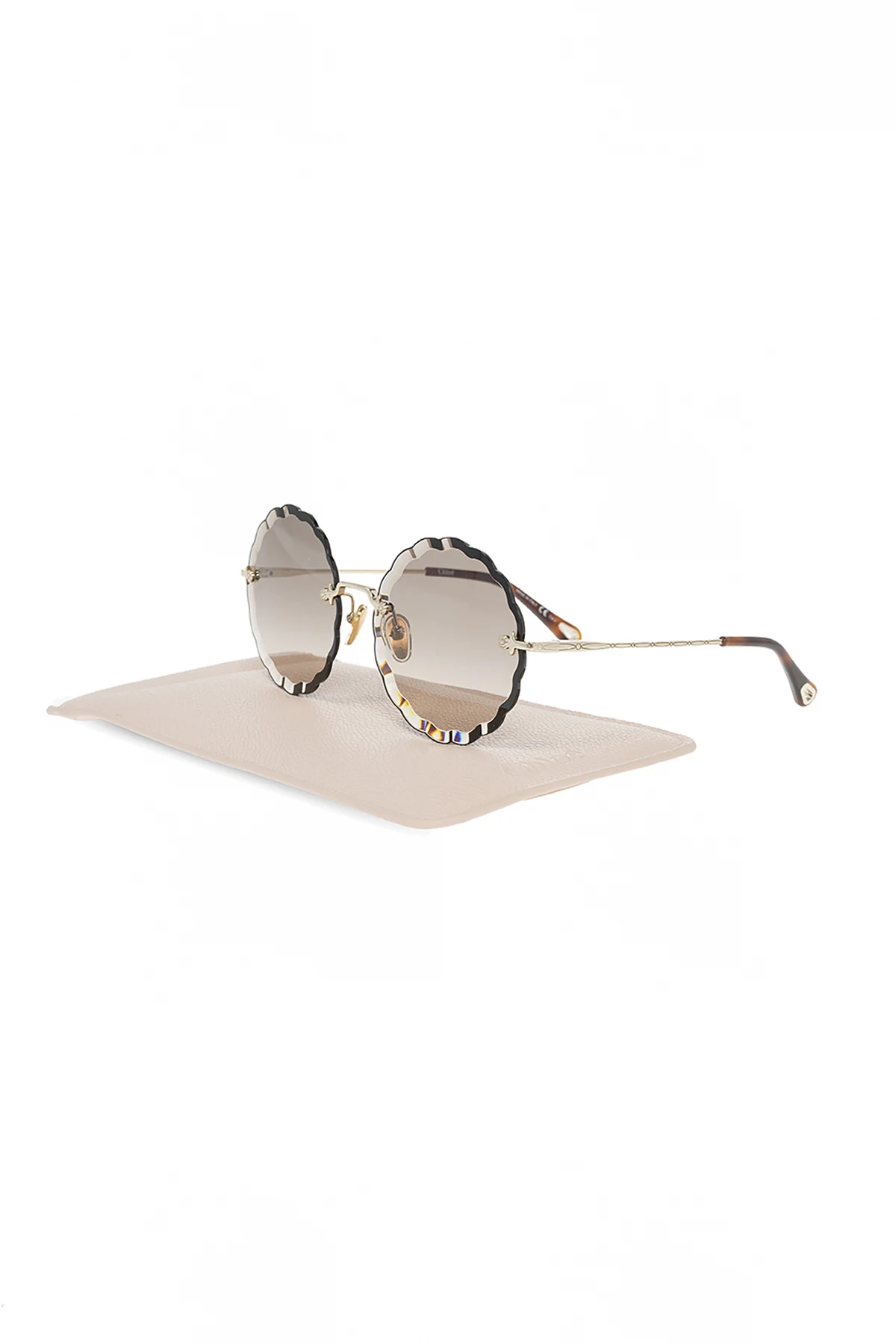 Gold-tone sunglasses from Chloé. This pair has patterned temples with a logo and eyelets as well as grey and brown certified gradient lenses with 100% UVA/UVB protection. Comes with a logo-embossed case in blush pink.