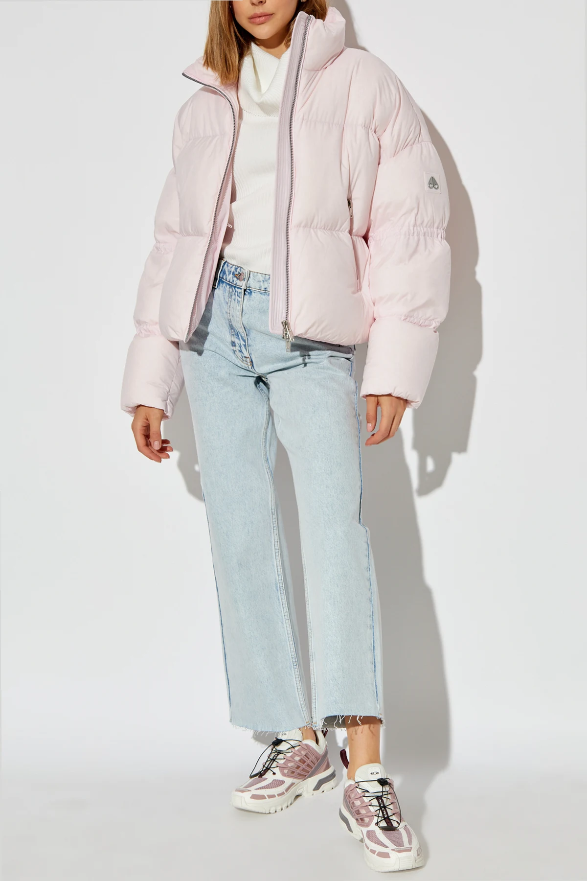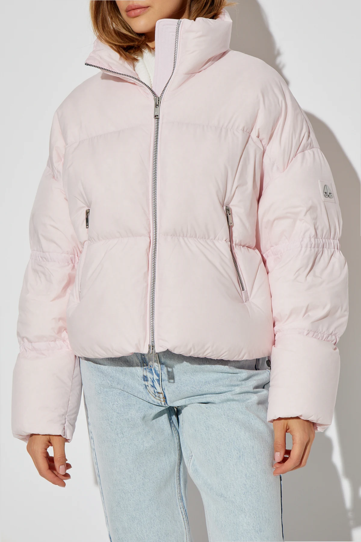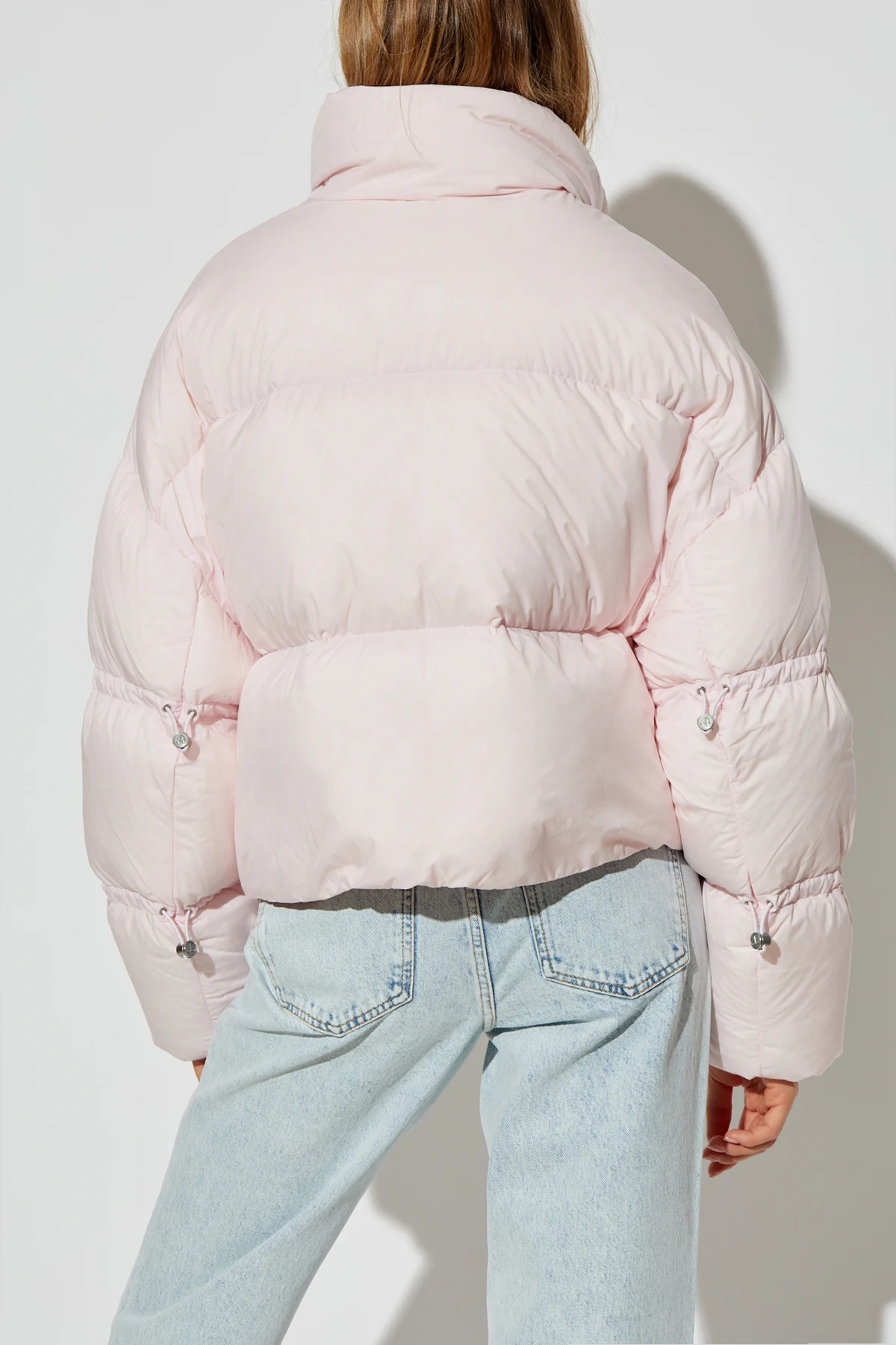 Diese raffinierte Jacke in einem zarten, hellrosa Farbton hat einen klassischen, kurzen Daunenschnitt mit leicht oversized Passform, breiten Ärmeln und einem geraden Saum. Der hohe Stehkragen bietet zusätzlichen Schutz vor Kälte, und der zentrale Verschluss mit einem metallischen, silbernen Reißverschluss verleiht der Jacke einen modernen Charakter.