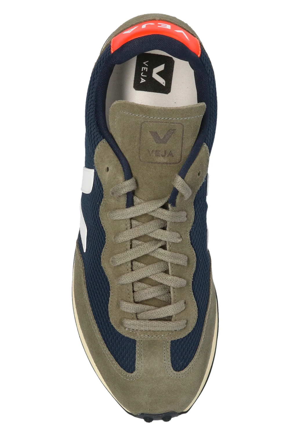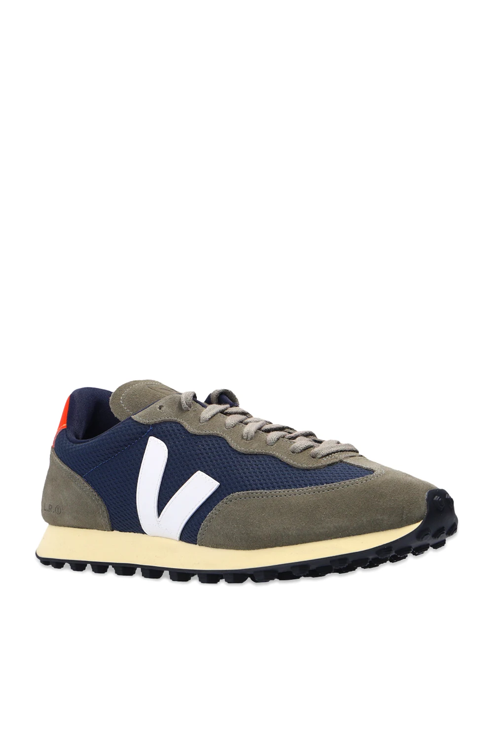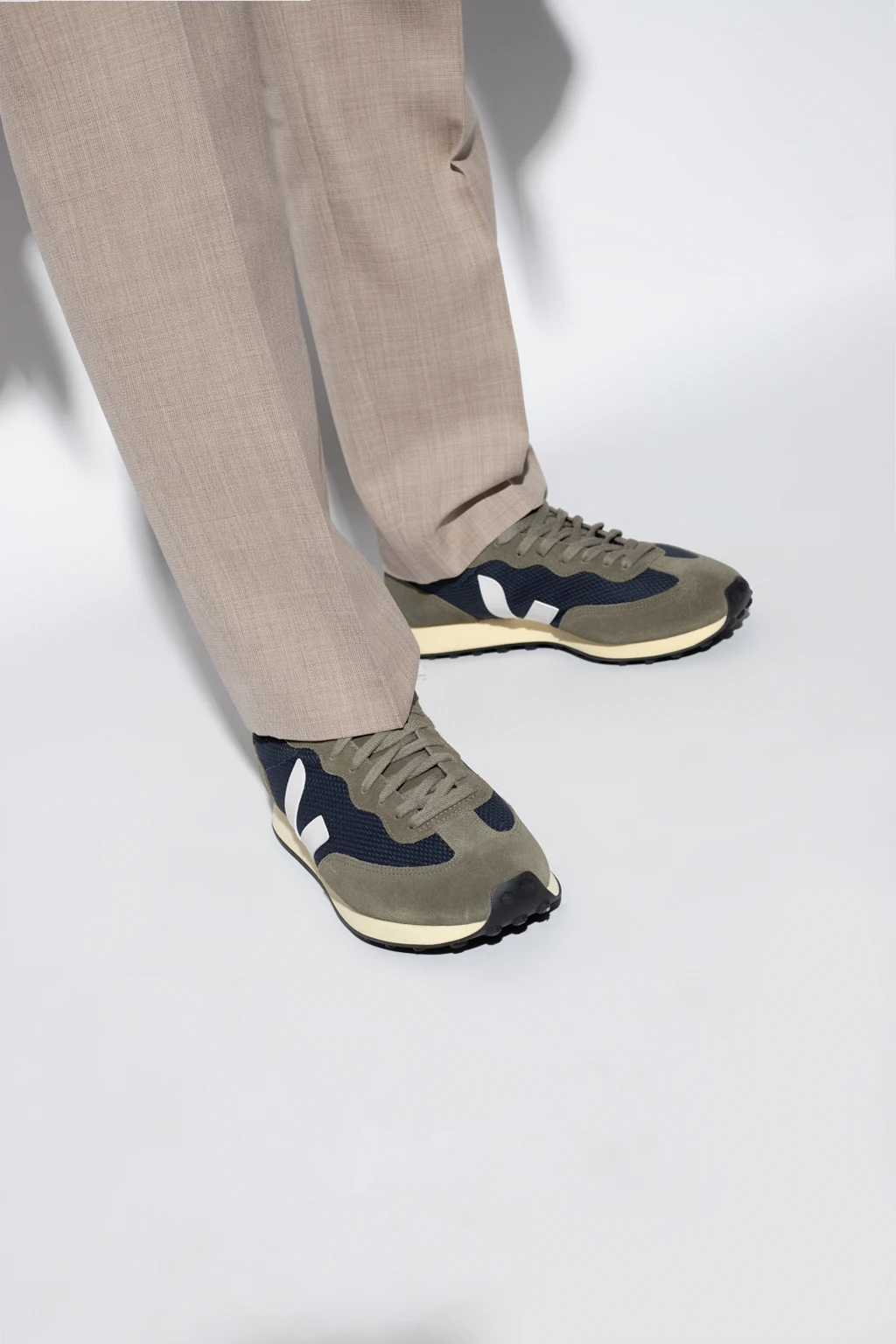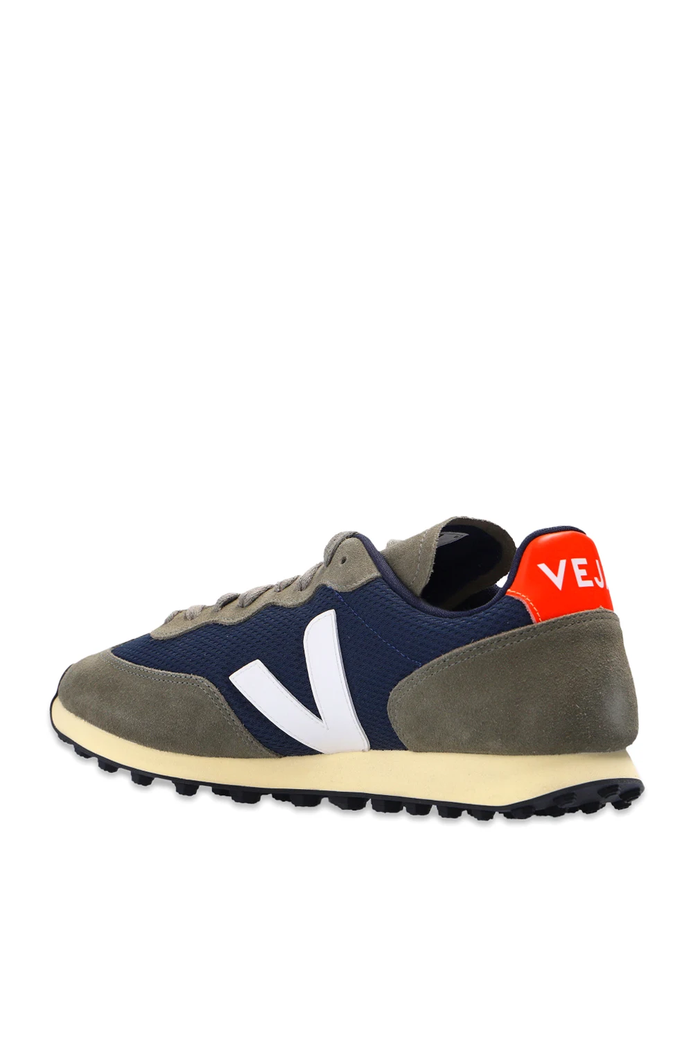 Dark green and navy ‘Rio Branco’ sneakers from Veja. Crafted from breathable Alveomesh with suede trims, this lace-up pair features a white logo patch produced from rubber and rice waste. The mesh inner lining made from recycled materials was developed to acquire a better resistance to friction. The organic-sourced and recycled insole consists of sugar cane, Amazon rubber, organic cotton and recycled EVA. It is set on a light yellow and black rubber sole made from organic and recycled materials.