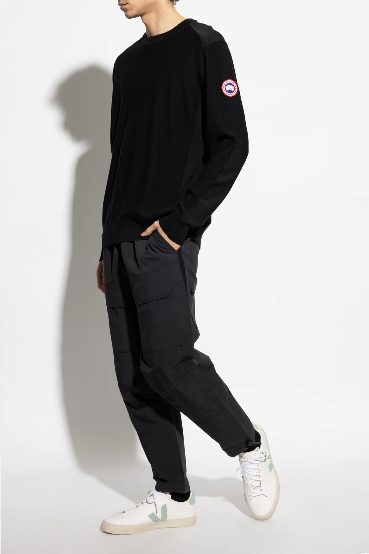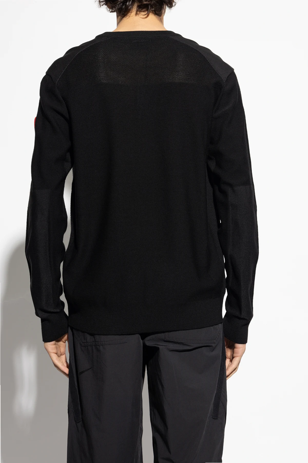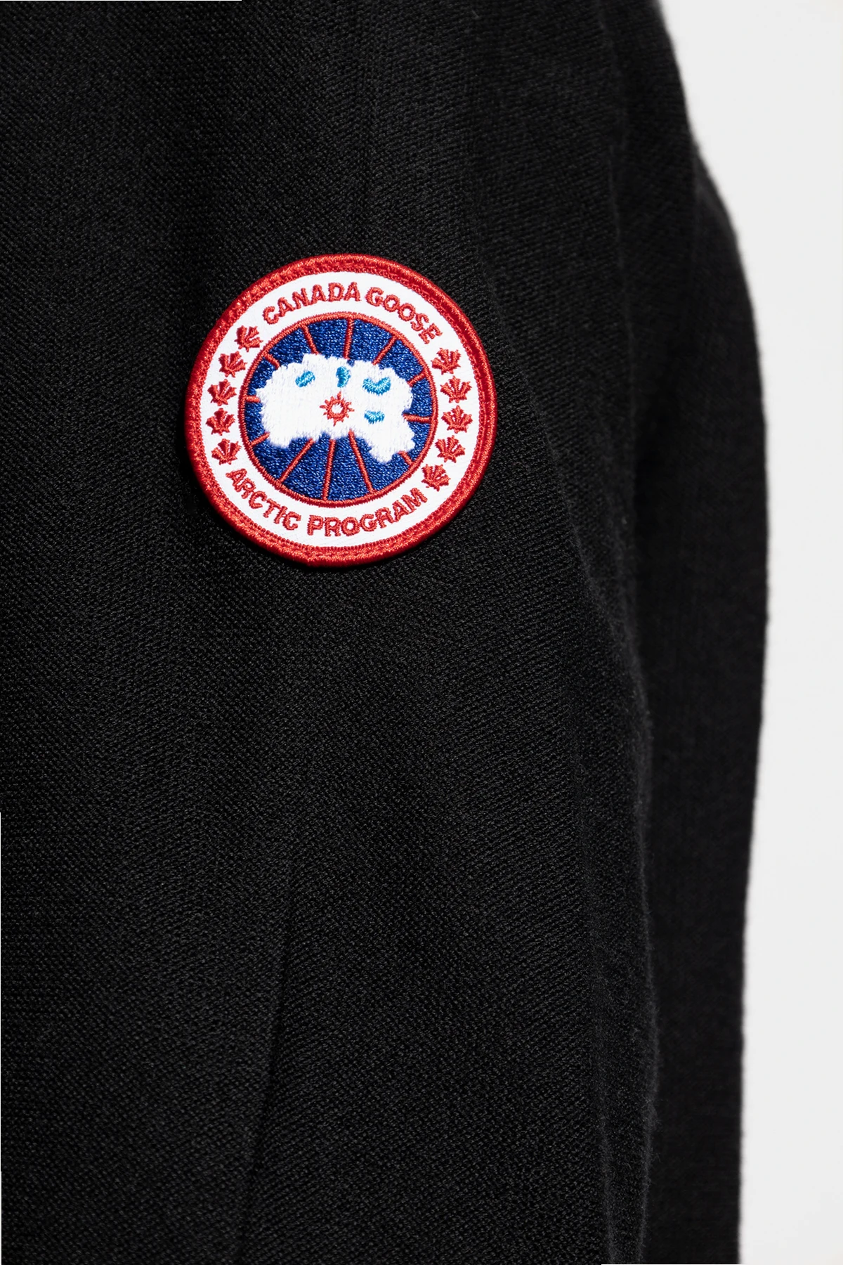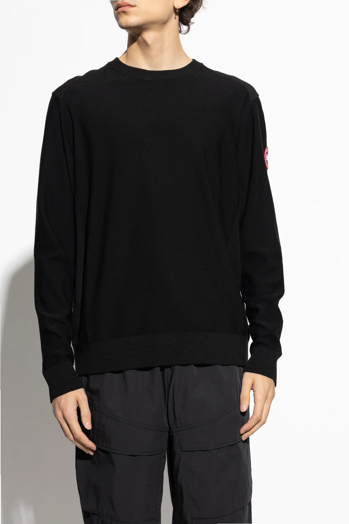 Black ‘Dartmouth’ crewneck sweater from Canada Goose. Crafted from merino wool, this pullover showcases ribbed finishes and red, white and navy blue logo patch on the sleeve for the brand recognition.