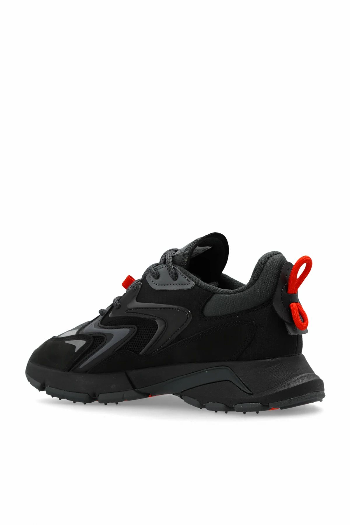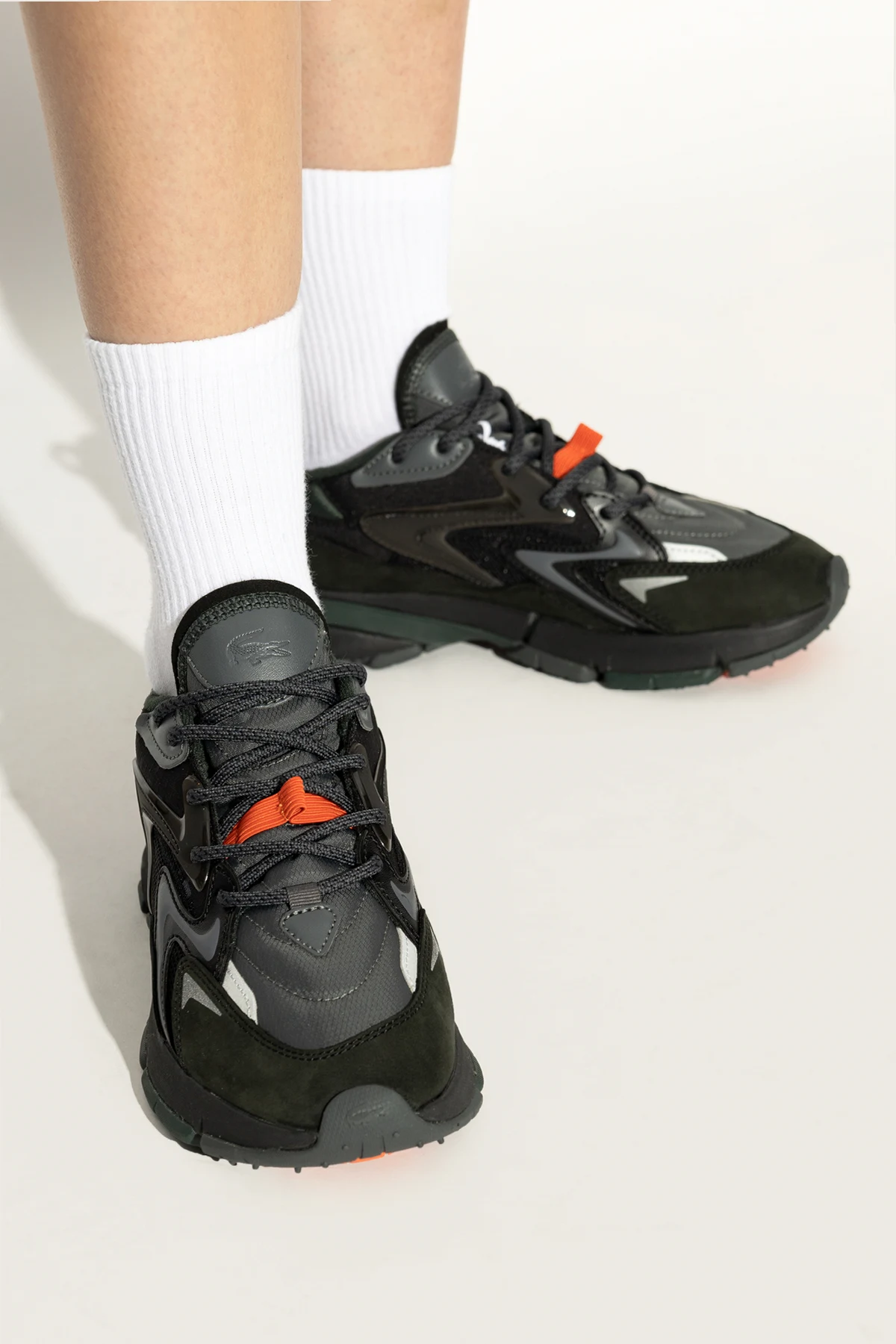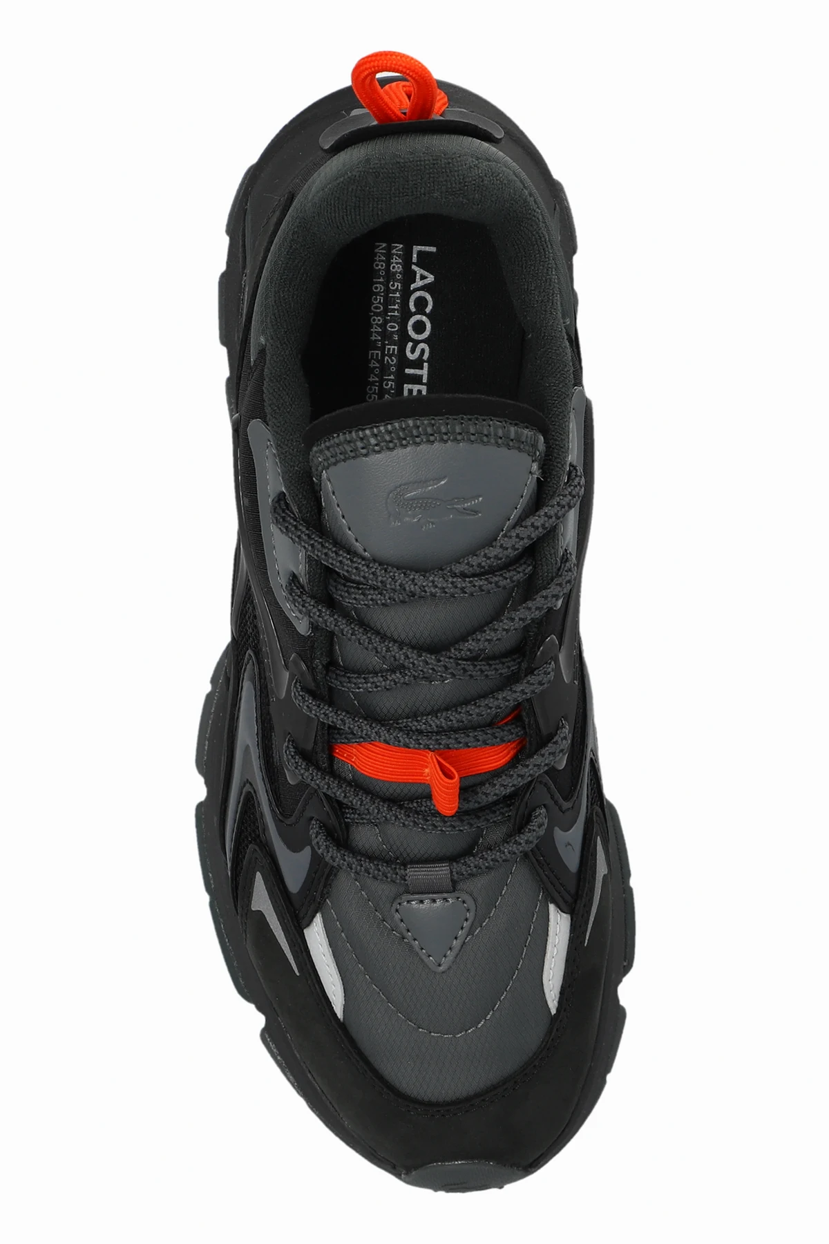 Die seitlichen und vorderen Partien des Schuhs sind perforiert, was die Atmungsaktivität erhöht - ein wesentlicher Vorteil bei intensivem Gebrauch. Auf der Seite des Schuhs befindet sich das charakteristische Krokodil-Logo, und auf der Zunge ist der Schriftzug "LACOSTE" angebracht, der die Marke eindeutig identifiziert.