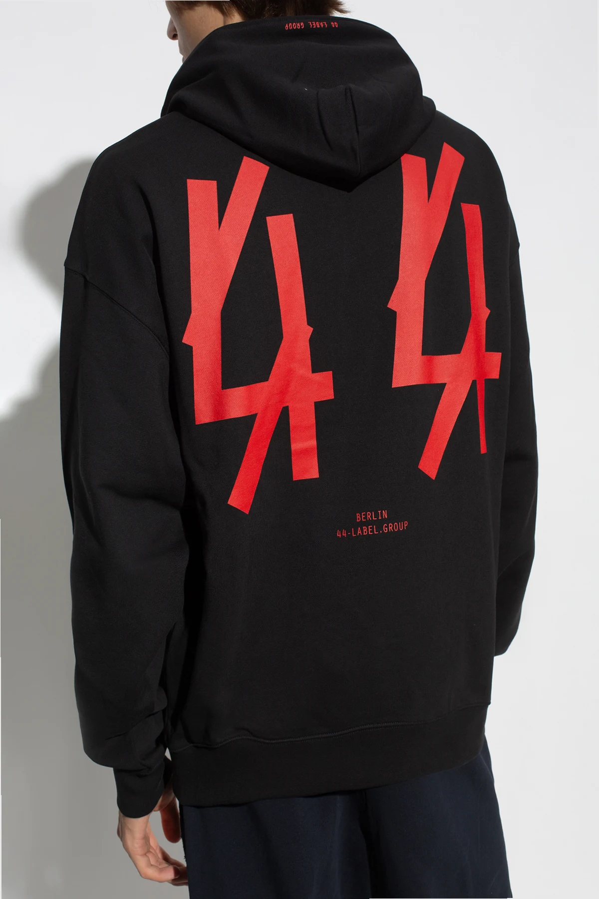 Auf der Vorderseite befindet sich eine große Kängurutasche, die nicht nur funktional ist, sondern dem Sweatshirt auch einen charakteristischen Streetwear-Look verleiht. Auf dem Rücken hebt sich ein großer roter Druck mit den Zahlen „44“ und den Schriftzügen "BERLIN" und "44 LABEL GROUP" ab. Ein dezentes schwarzes „44“-Logo ziert diskret die Mitte der Kapuze, und ein kleiner roter Schriftzug "44 LABEL GROUP" ist am Hinterkopf angebracht.