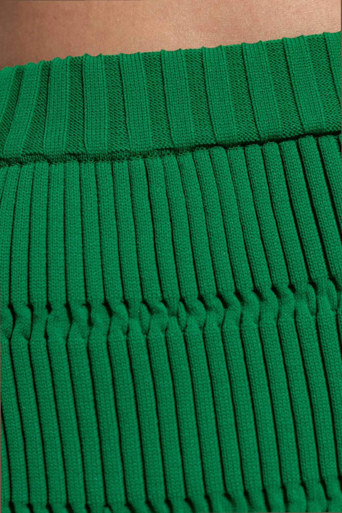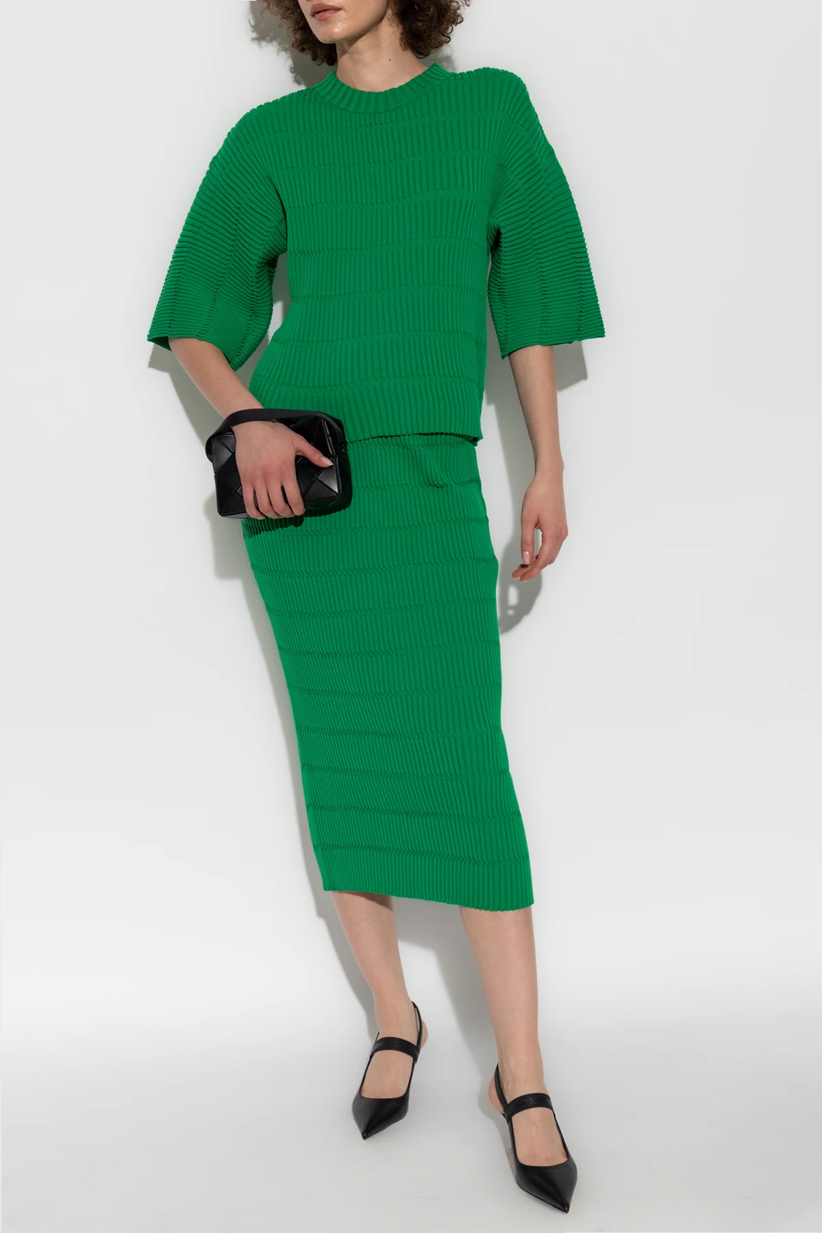 Der Rock zeichnet sich durch eine enge, bleistiftförmige Passform aus, die die Silhouette betont, sowie durch eine mittlere Länge, die bis hinter das Knie reicht. Hervorstechend ist das markante, horizontale Rippmuster, das ihm eine elegante Textur verleiht. Hergestellt aus elastischem Material, das Tragekomfort bietet, verfügt der Rock über einen elastischen Bund, der das Anziehen erleichtert. Die dominante, intensive grüne Farbe verleiht ihm Ausdruck und Klasse.