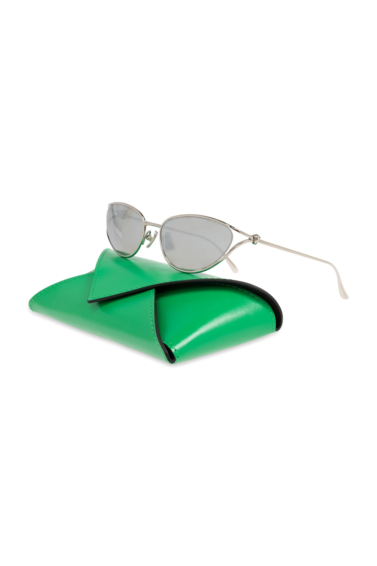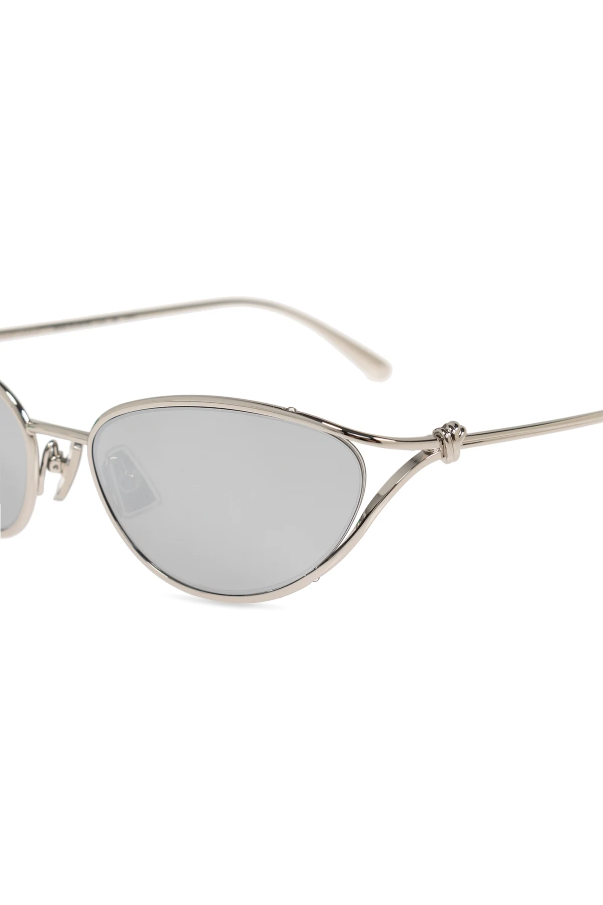 Wir präsentieren exklusive Sonnenbrillen der Marke Bottega Veneta – die Quintessenz von Luxus und modernem Design. Aus hochwertigem Metall gefertigt, ziehen diese eleganten Brillen mit ihrem silbernen Rahmen und den modischen, leicht abgerundeten Gläsern in Katzenaugenform alle Blicke auf sich.