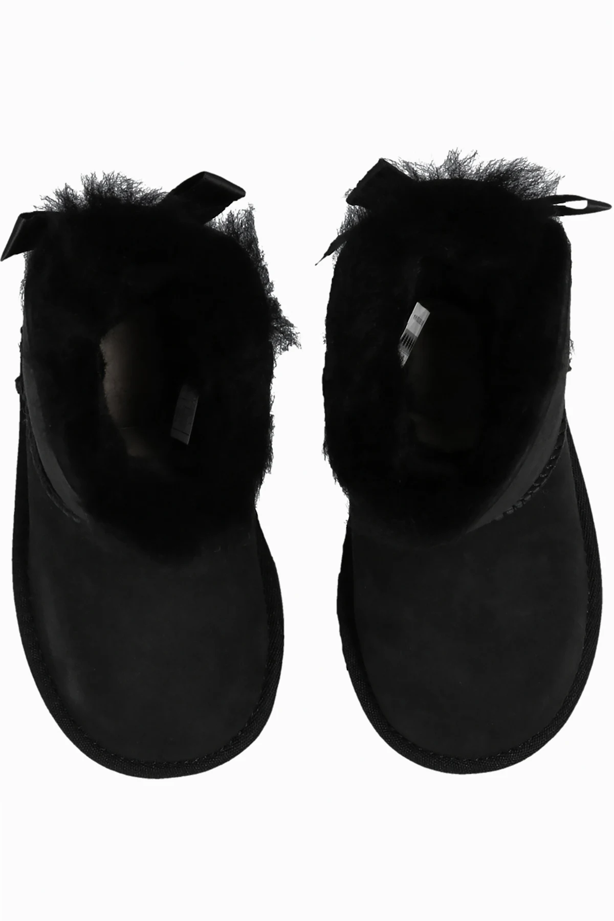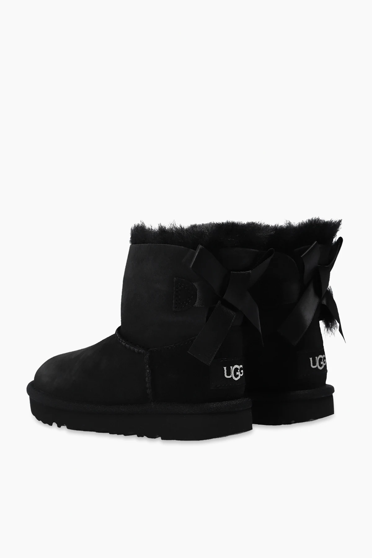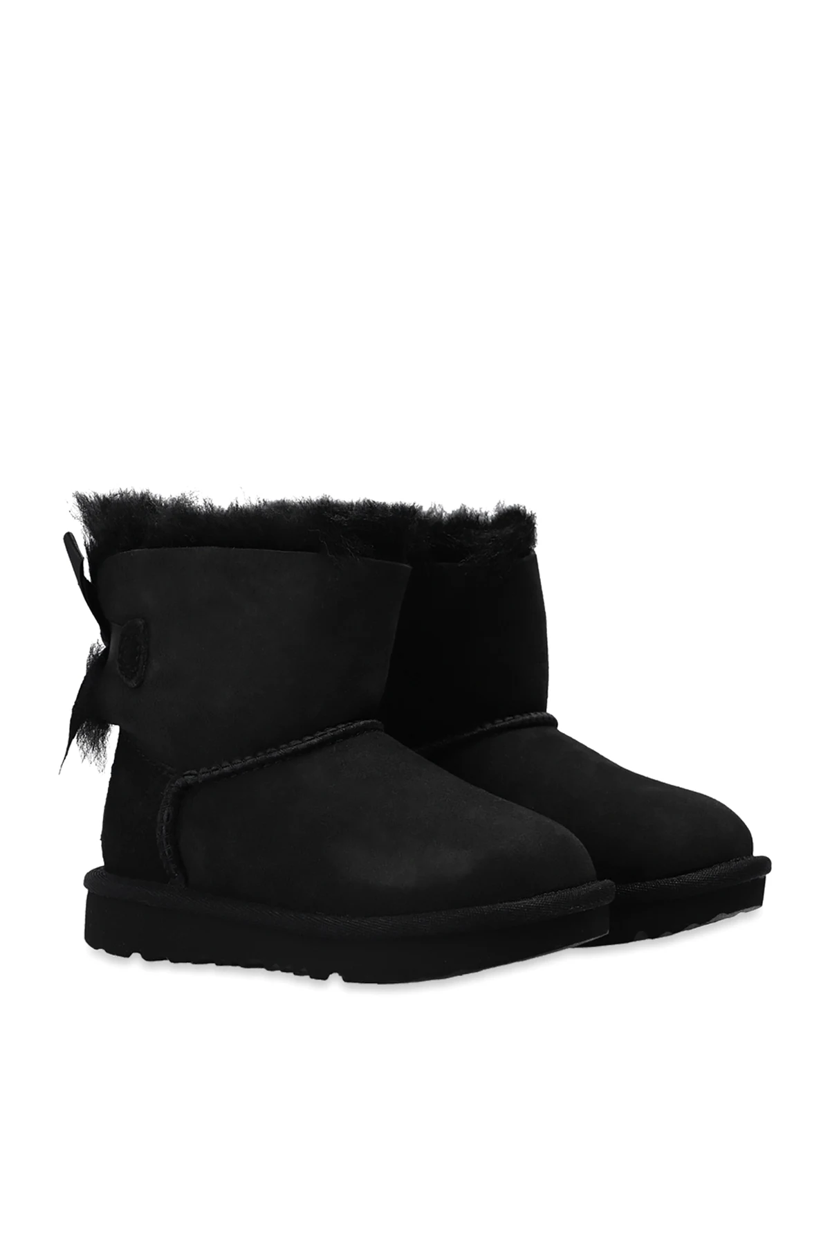 Black ‘Mini Bailey Bow II’ snow boots from UGG Kids. Crafted from sheep leather, this design features a decorative bow, logo patch in black and cream, UGGpure™ wool lining and a black rubber sole.