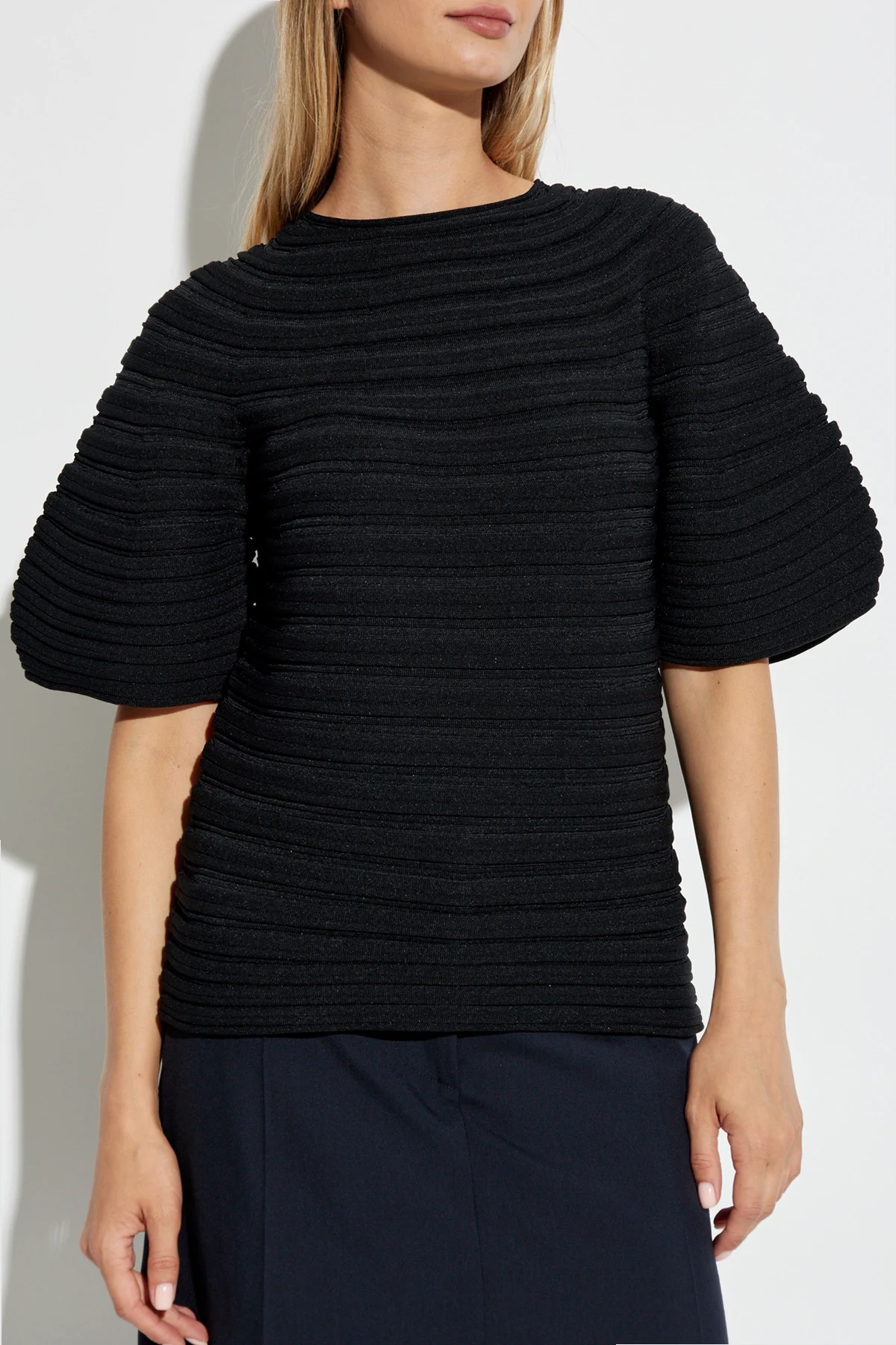 Die Bluse besticht durch einen schlichten, aber eleganten Schnitt mit rundem Ausschnitt und kurzen Ärmeln, die dank der erweiterten, plissierten Manschetten an Volumen und einzigartigem Aussehen gewinnen.