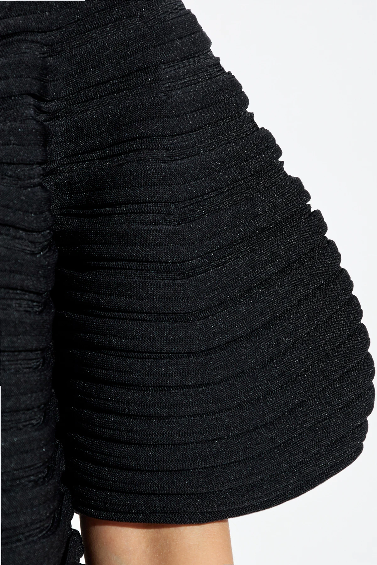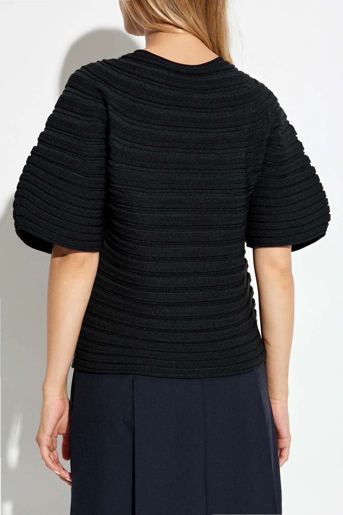 Hergestellt aus hochwertigstem Material und sorgfältig in horizontale Streifen plissiert, beeindruckt die Bluse mit einem gleichmäßigen Muster auf ihrer gesamten Oberfläche, einschließlich der Ärmel. Das minimalistische Design, ohne sichtbare Aufschriften oder Logos, verleiht ihr eine subtile Eleganz.