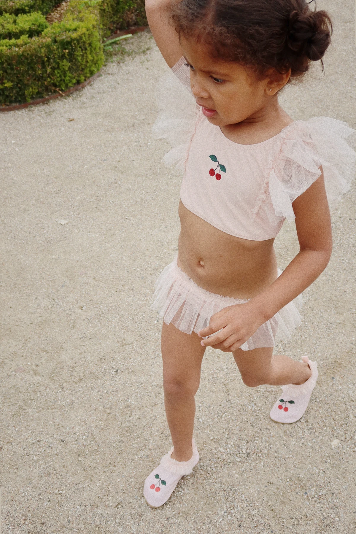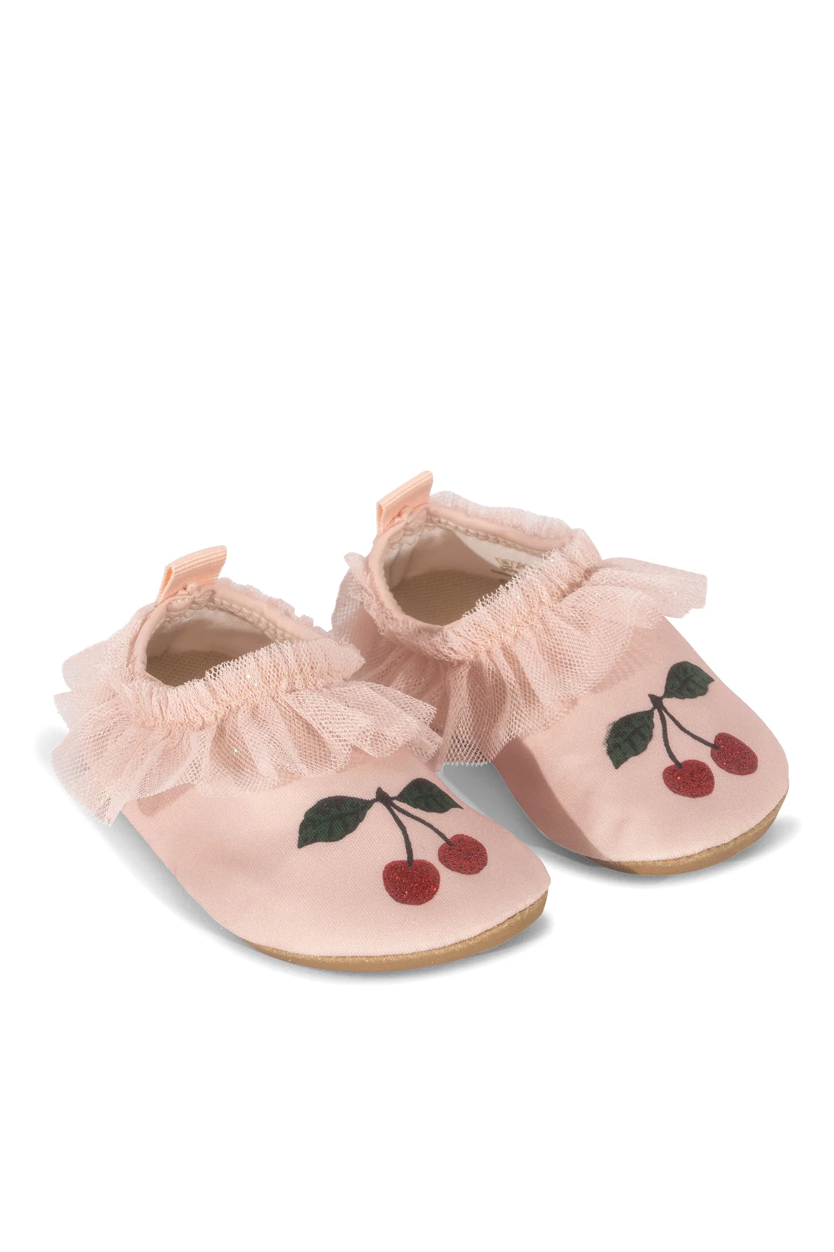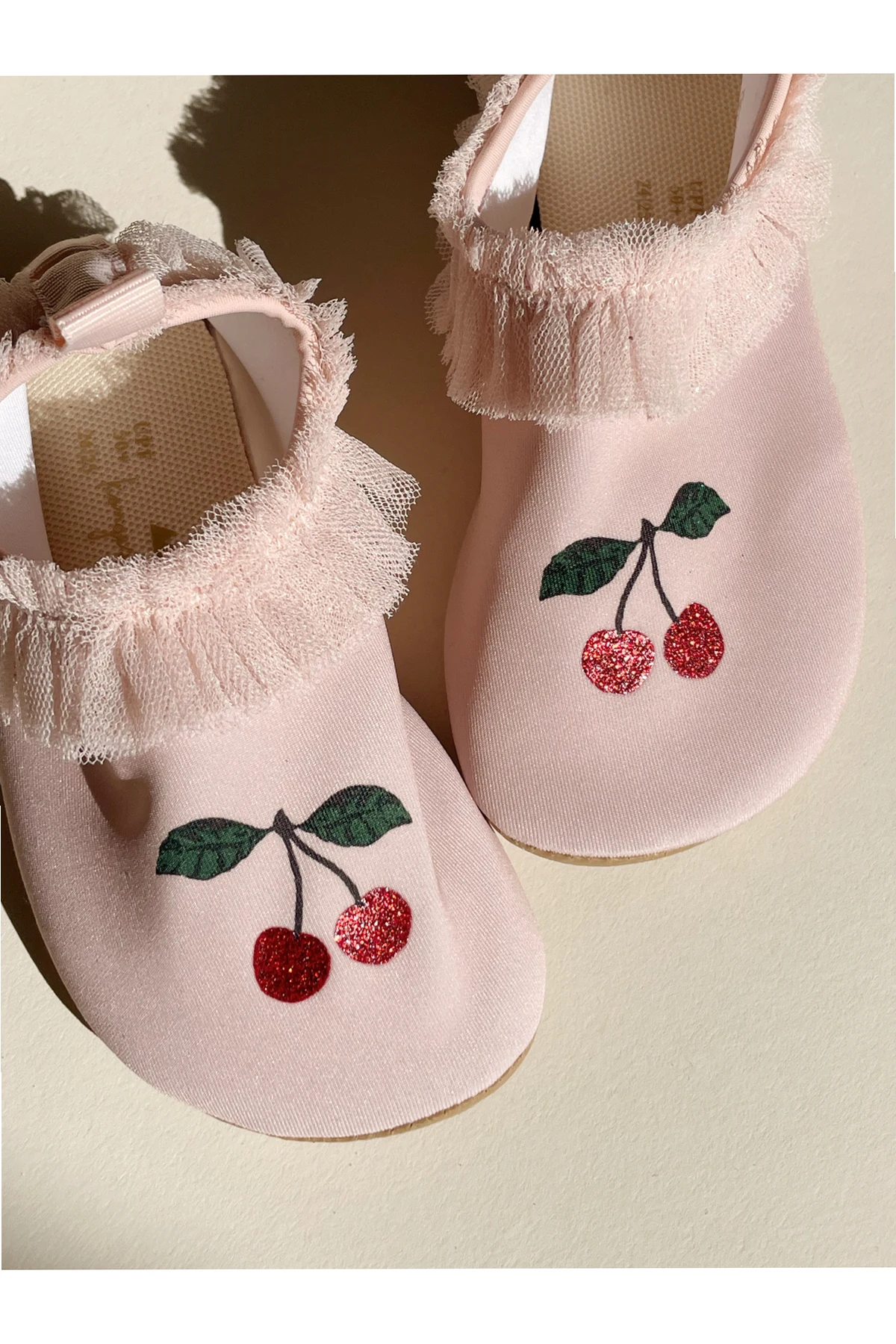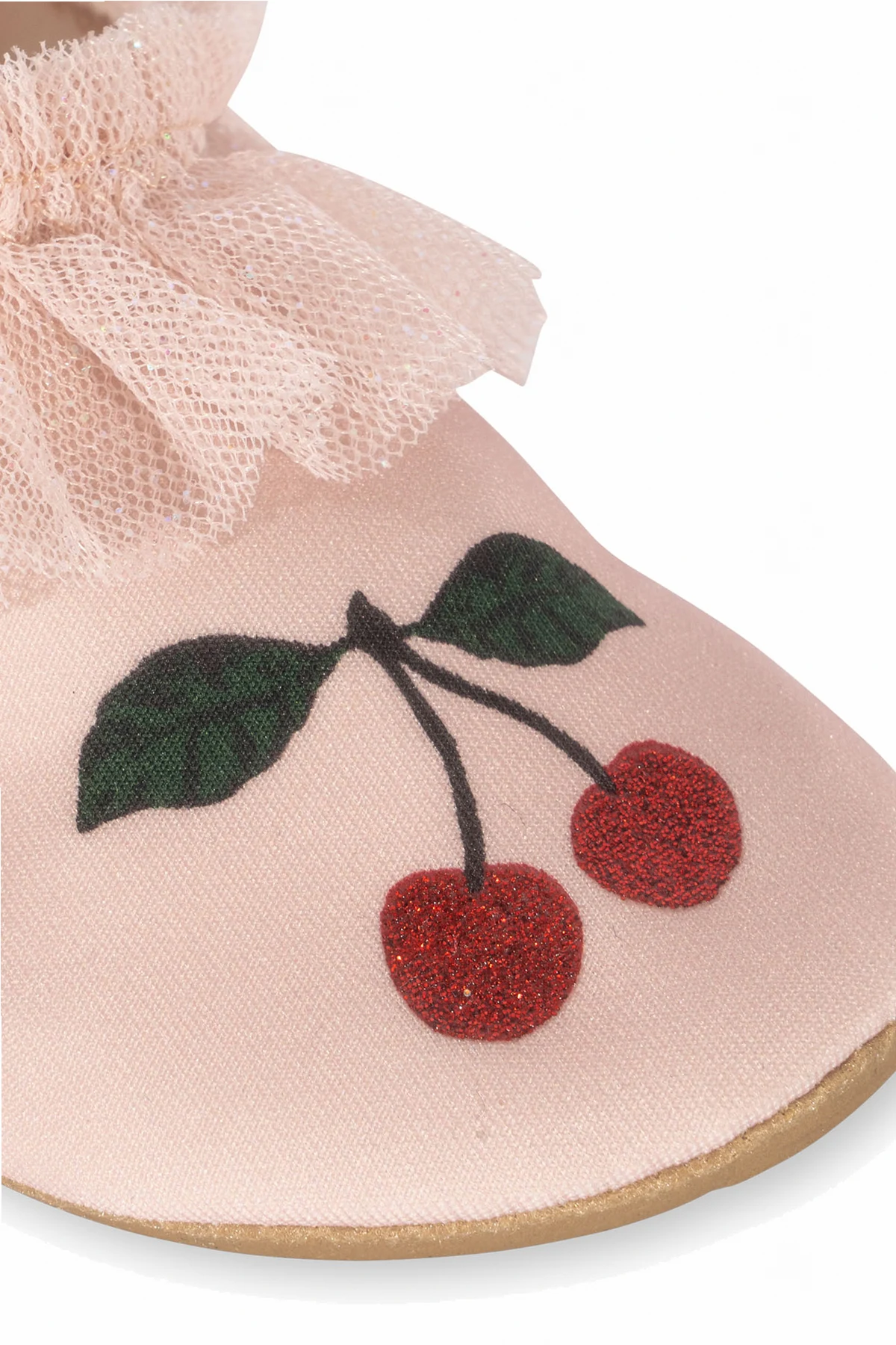 Hergestellt aus Materialien höchster Qualität, zeichnen sich die Ballerinas durch ein zartes rosa Finish aus, das nicht nur ästhetisches Vergnügen bietet, sondern auch Weichheit beim Berühren. Applikationen in Form von roten Kirschen mit grünen Blättern verleihen ihnen Charme, während die glitzernde Textur der Früchte dafür sorgt, dass die Schuhe bei jeder Fußbewegung subtil schimmern.