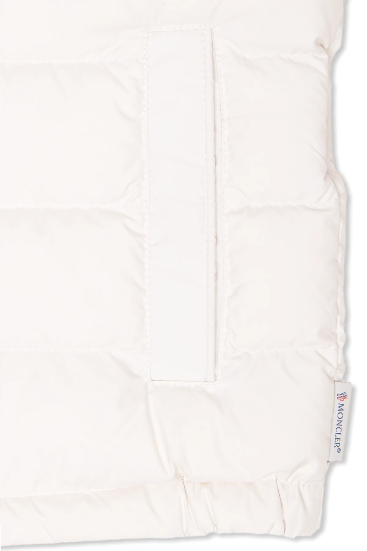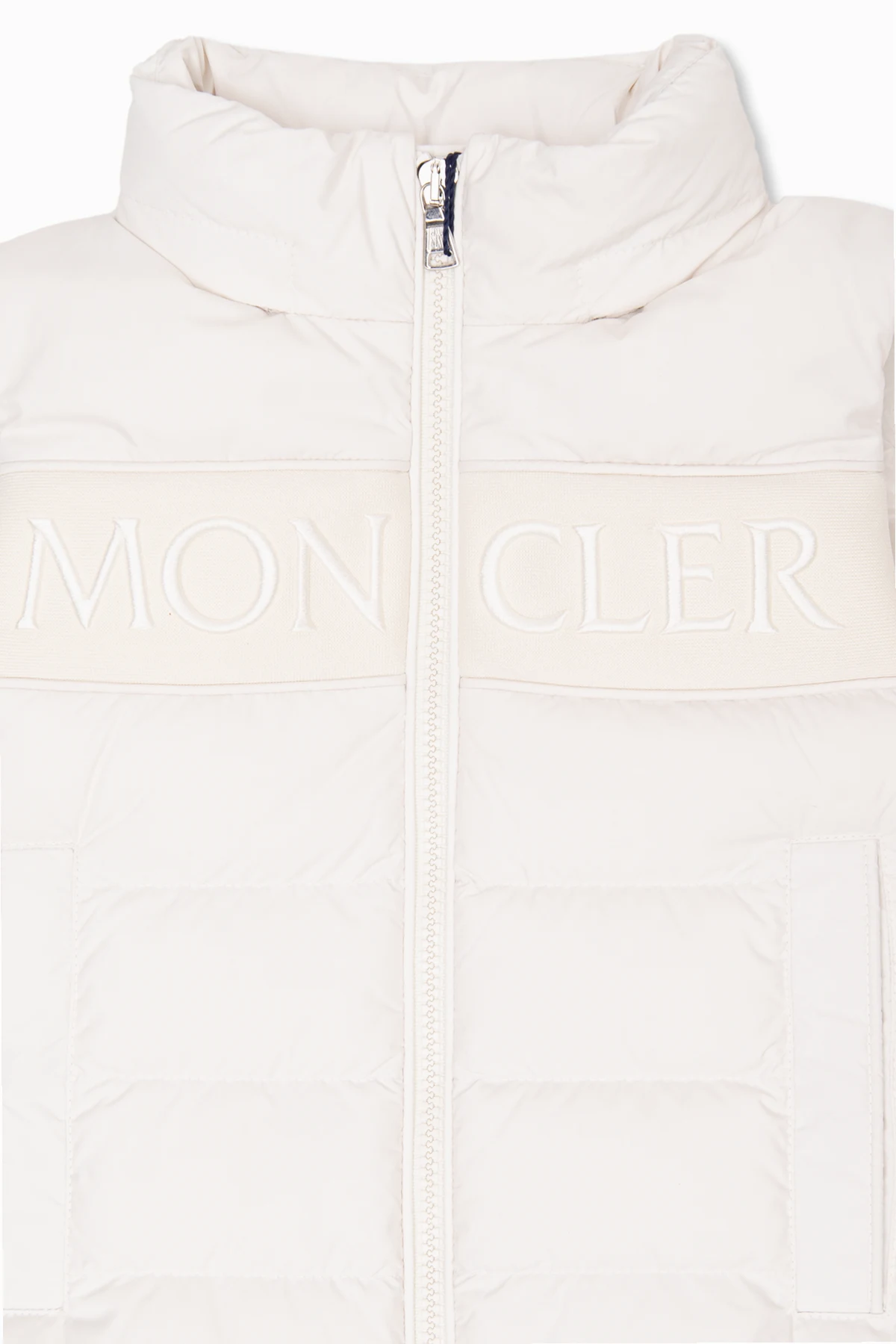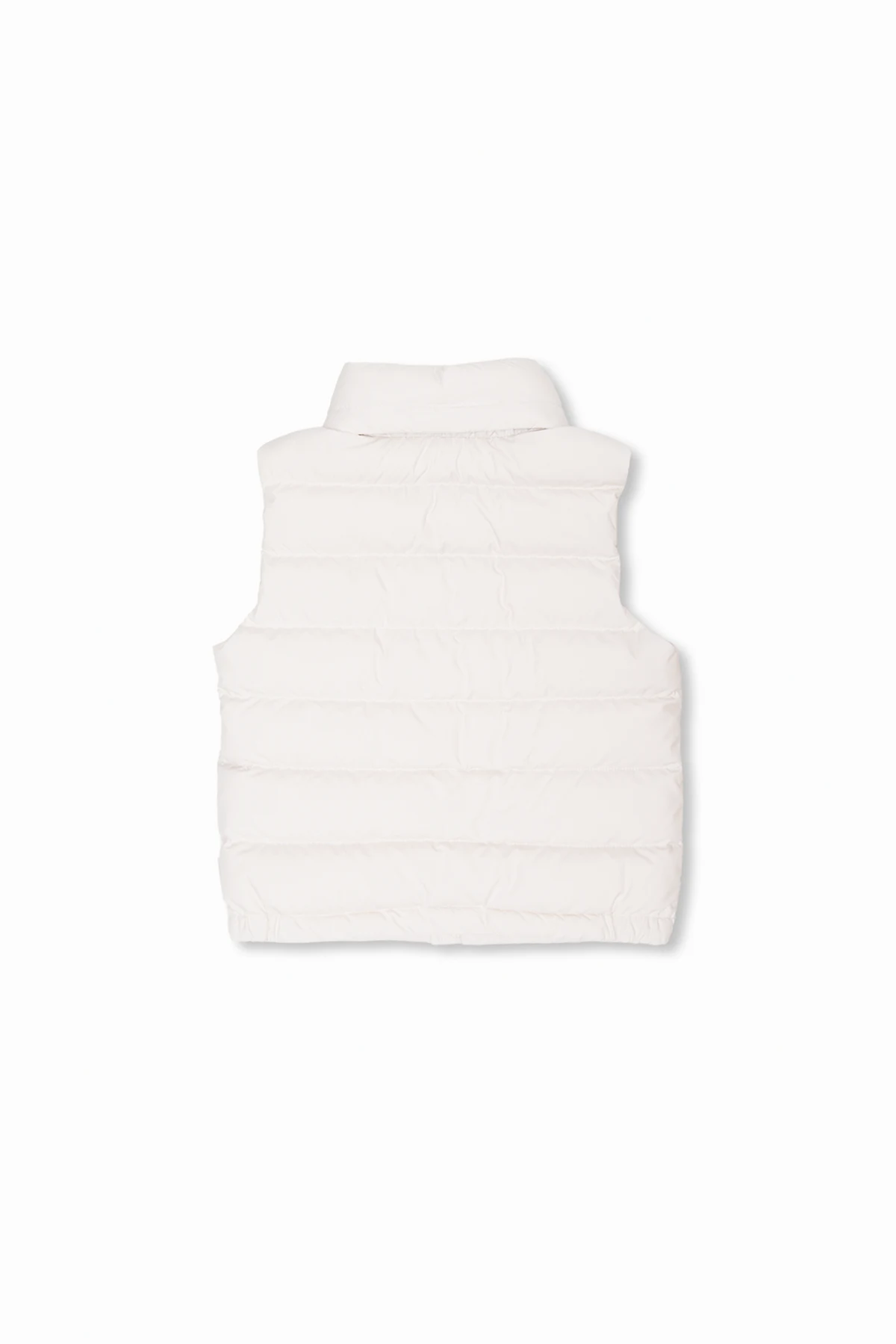 Cream ‘Rafael’ insulated vest from Moncler Enfant. Fastened with a zip, this design features a logo embroidery, two snap-fastened pockets and ribbed cuffs.