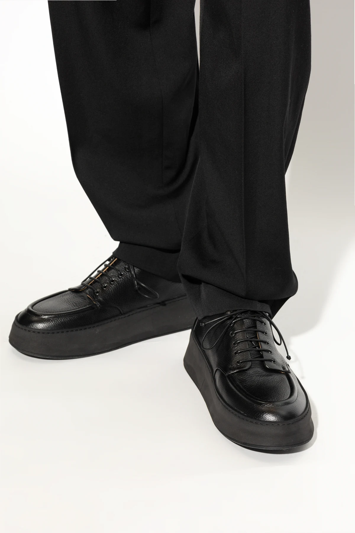 Black ‘Cassapana’ lace-up derby shoes from Marsll. Set on a black platform rubber sole, this leather-crafted pair is complete with silver-tone metal hardware.