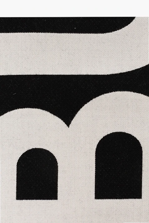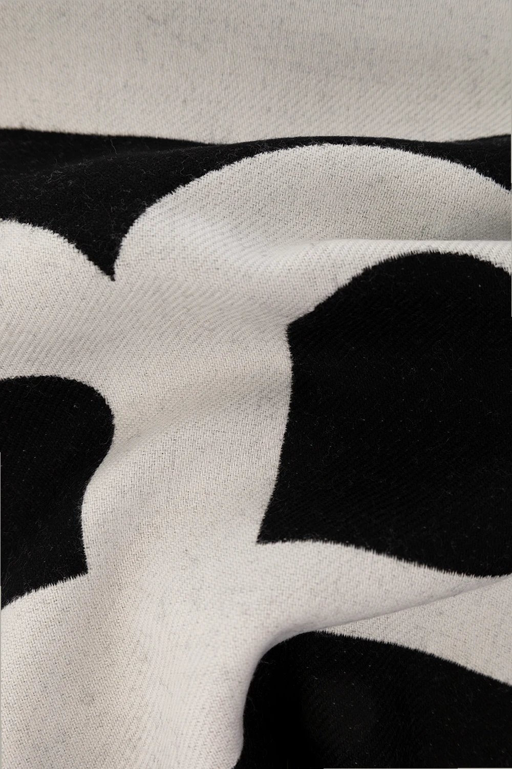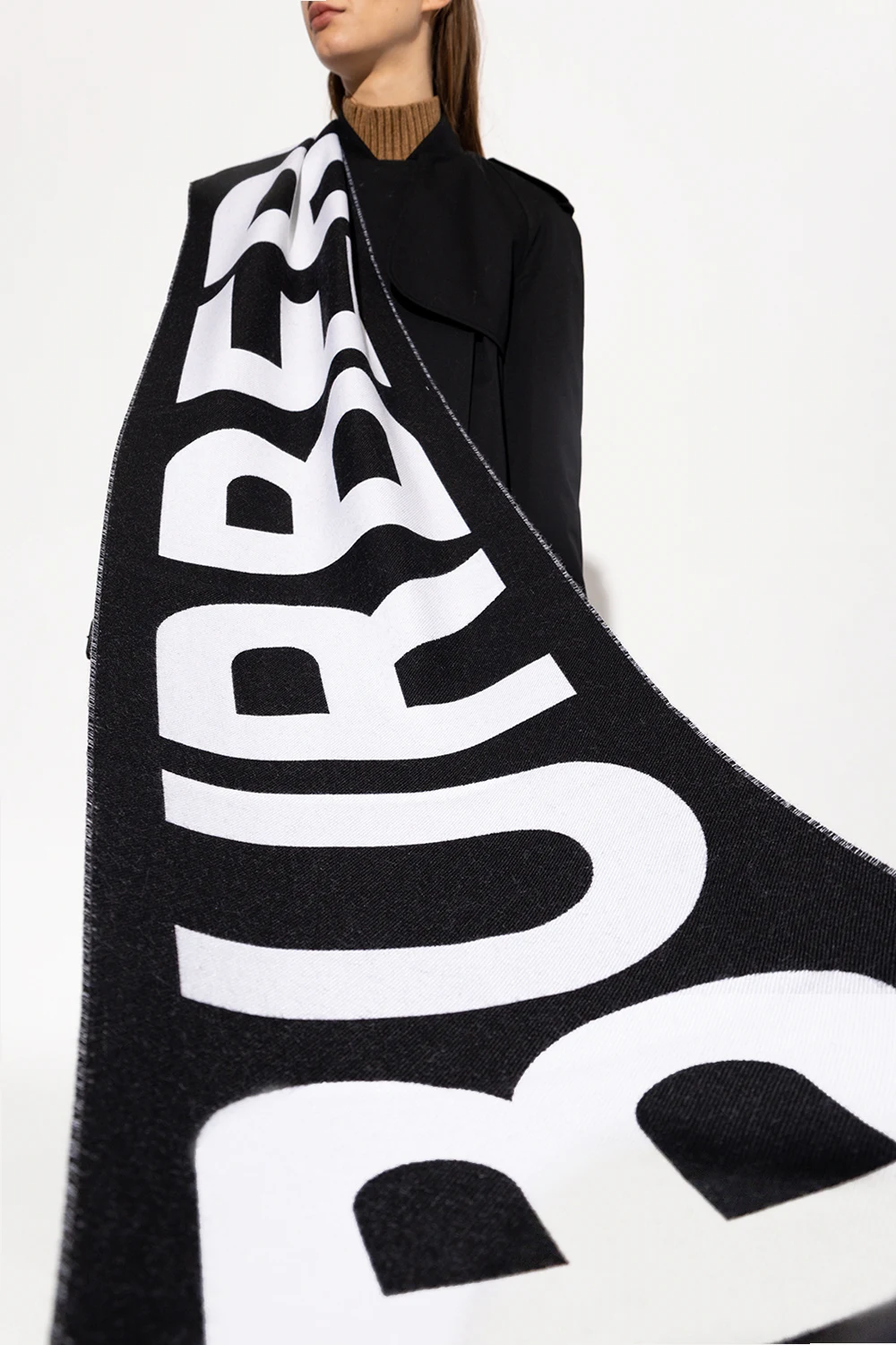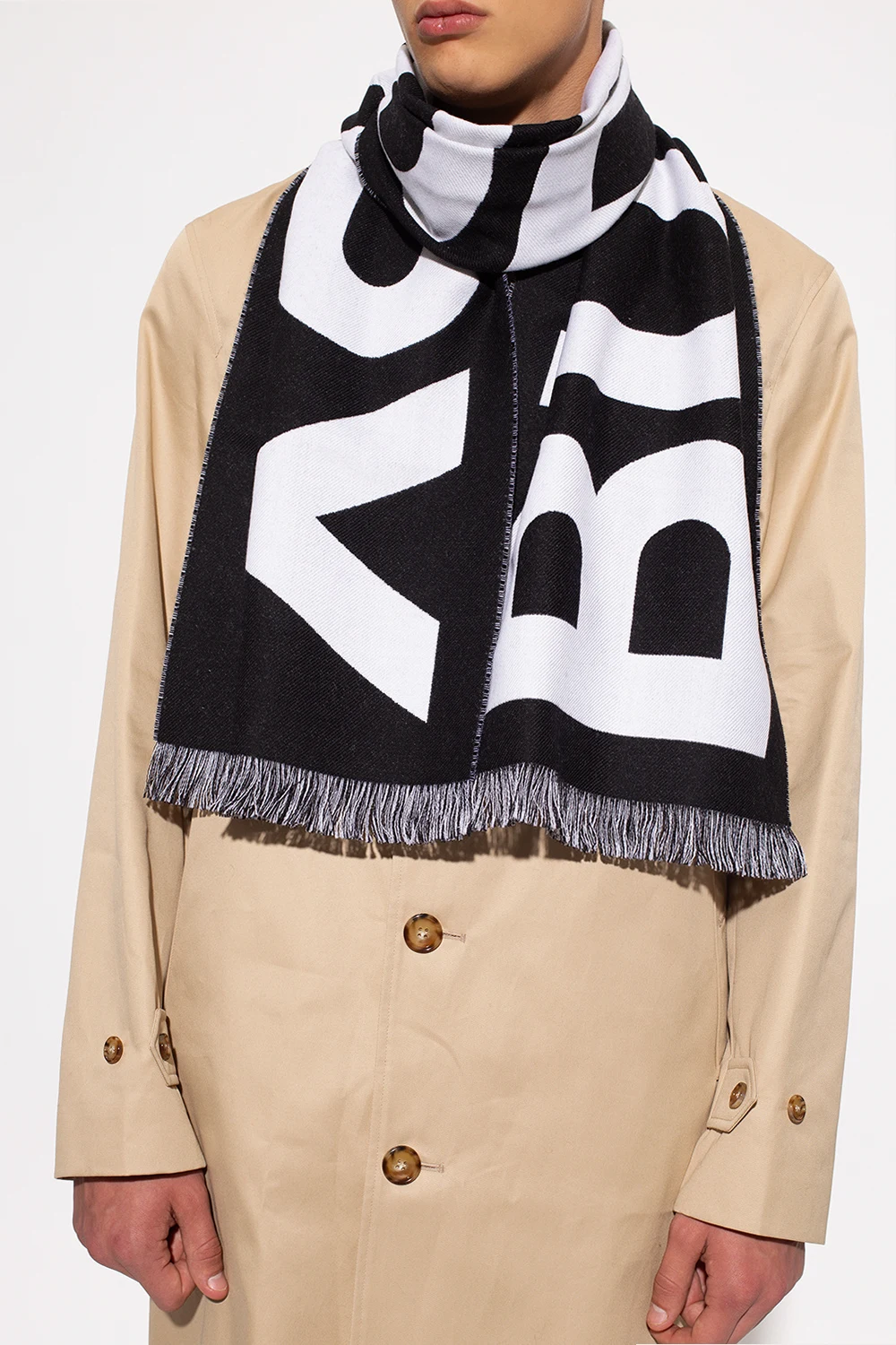 Black and white scarf with a logo embroidery and fringe ends from Burberry. Made of wool.