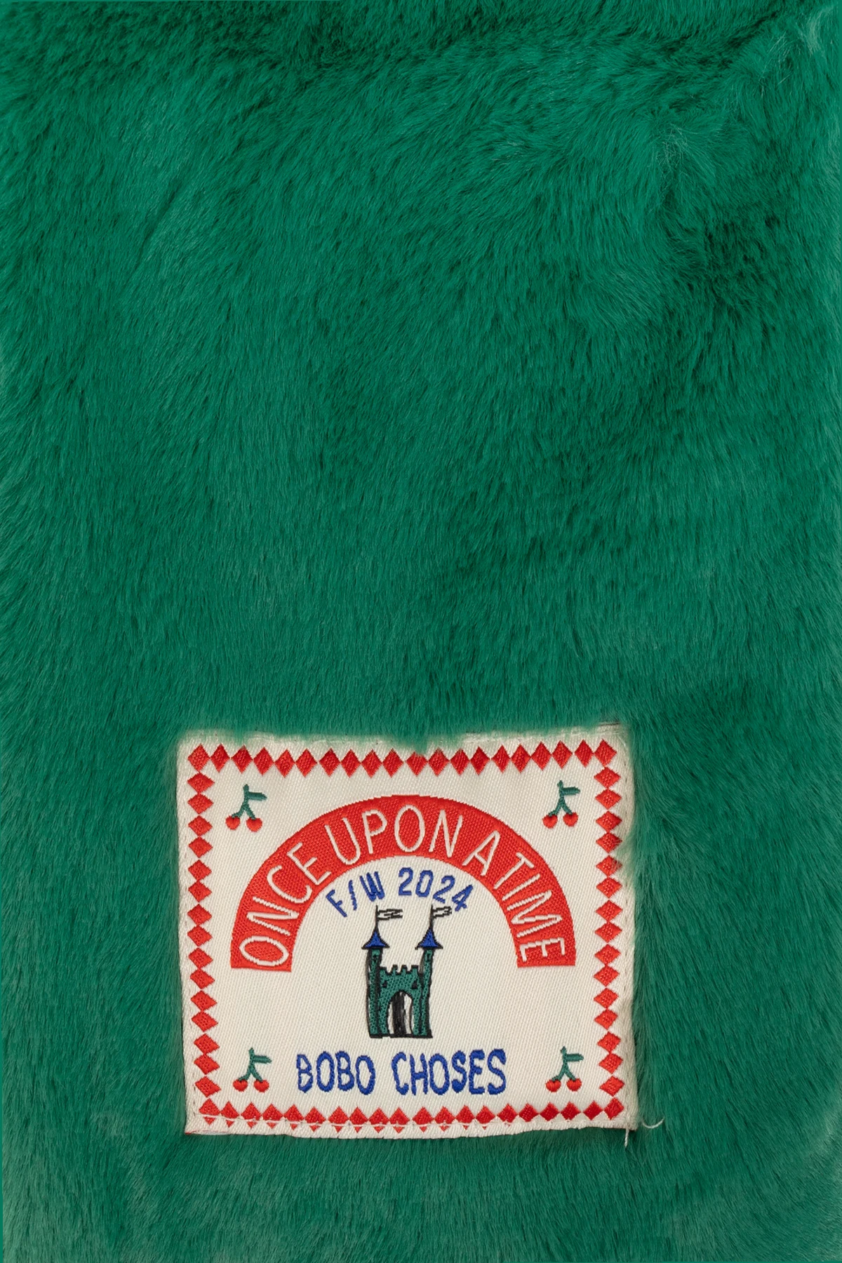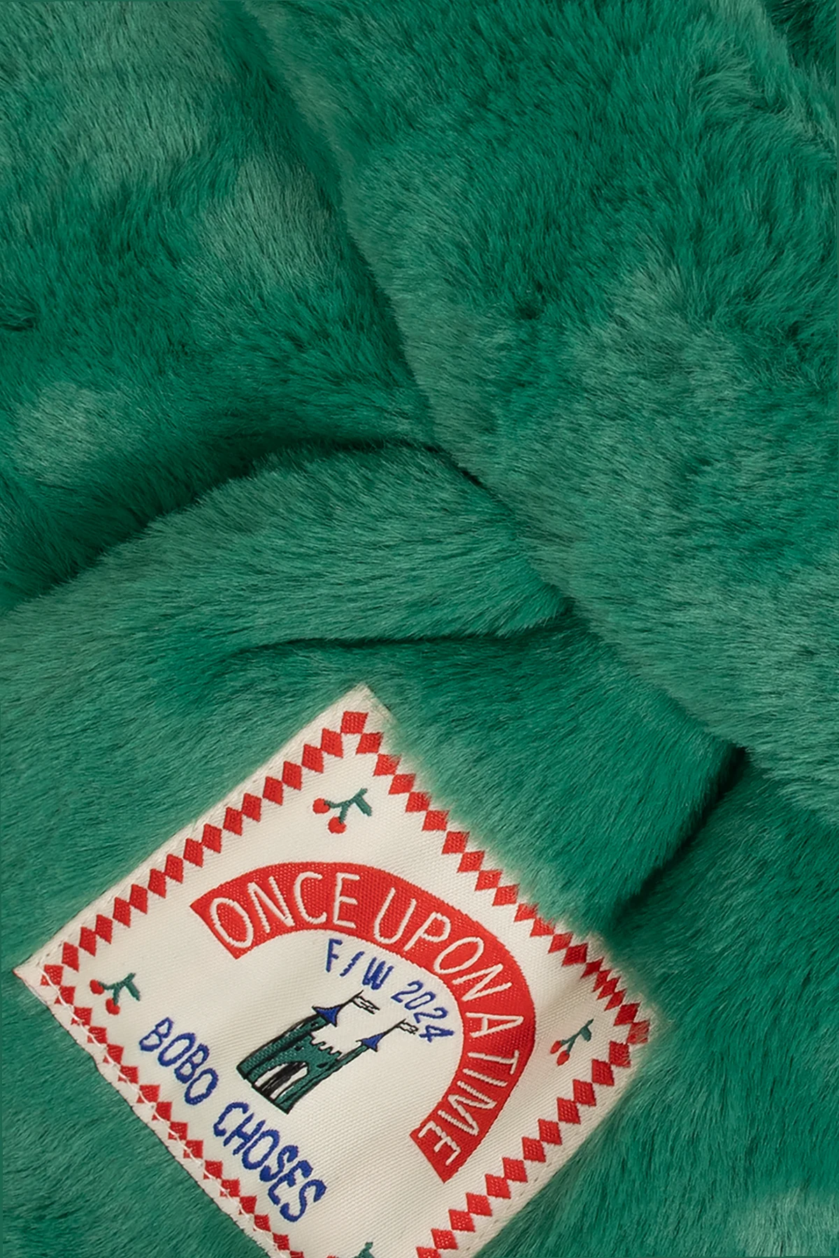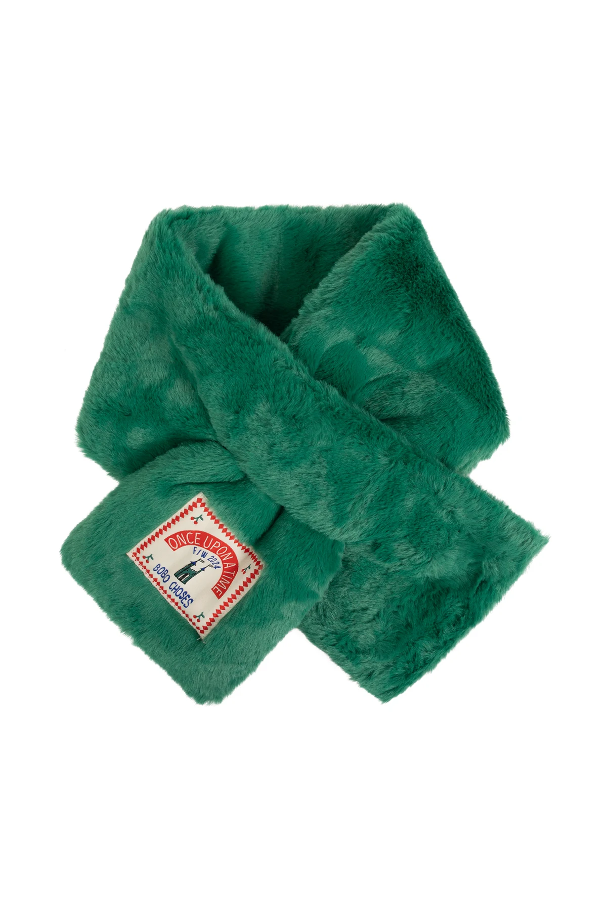 Am einen Ende des Schals befindet sich ein rechteckiger Aufnäher mit dem Designer-Logo, verziert mit einem roten Rand und der Aufschrift "ONCE UPON A TIME" und "BOBO CHOSES" . Eine Illustration, die eine Burg darstellt, und die Aufschrift "F/W 2024" weisen darauf hin, dass es sich um ein Produkt der Herbst/Winter-Kollektion 2024 handelt. Sorgfältig gearbeitete Nähte und ein präzise angenähtes Etikett zeugen von höchster Verarbeitungsqualität.