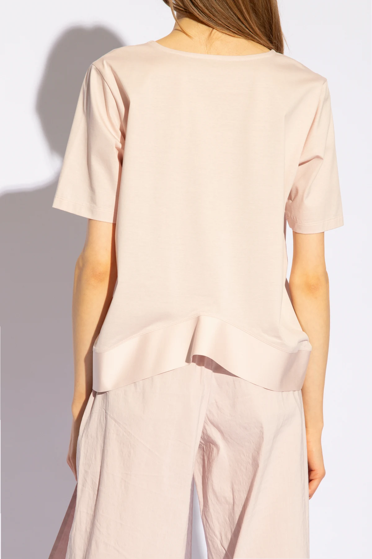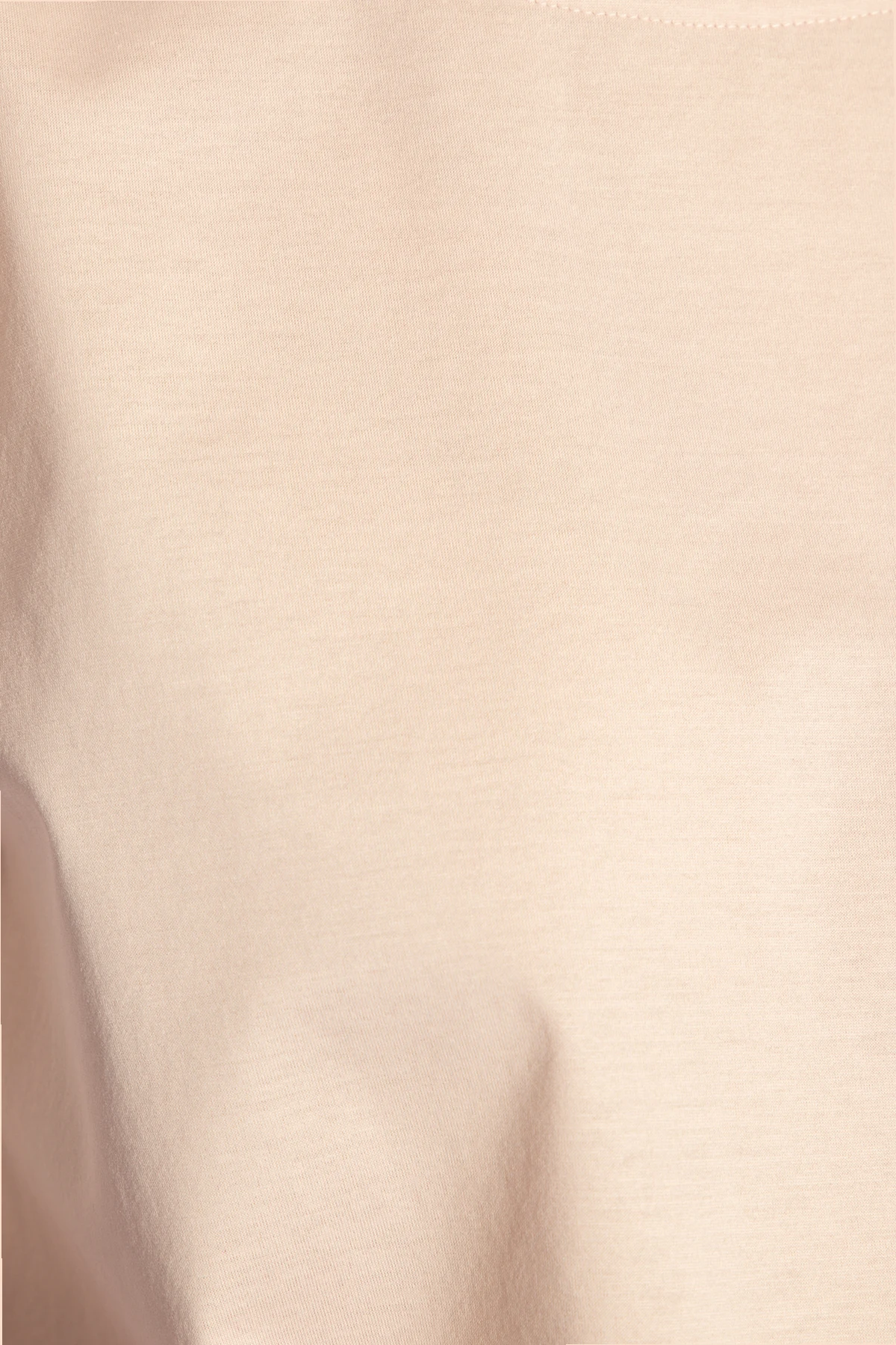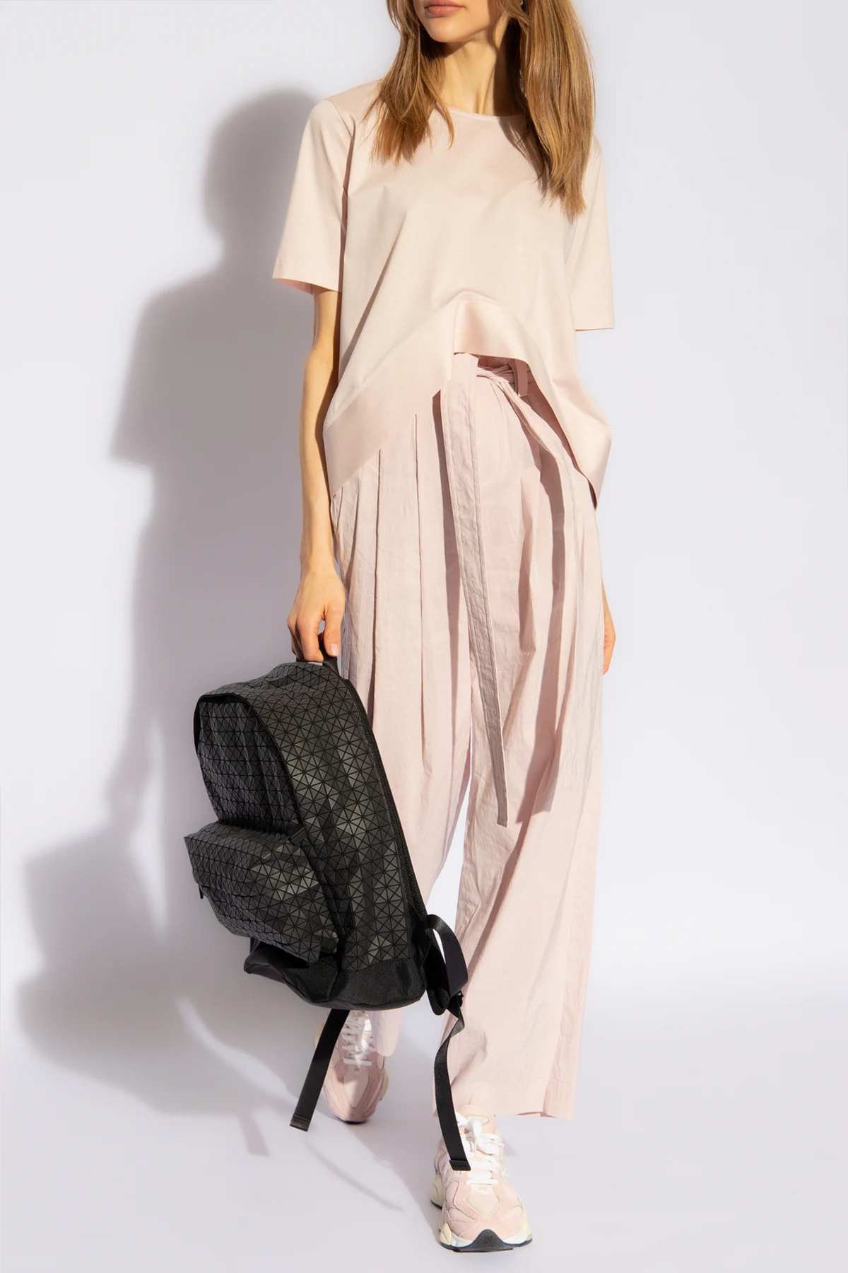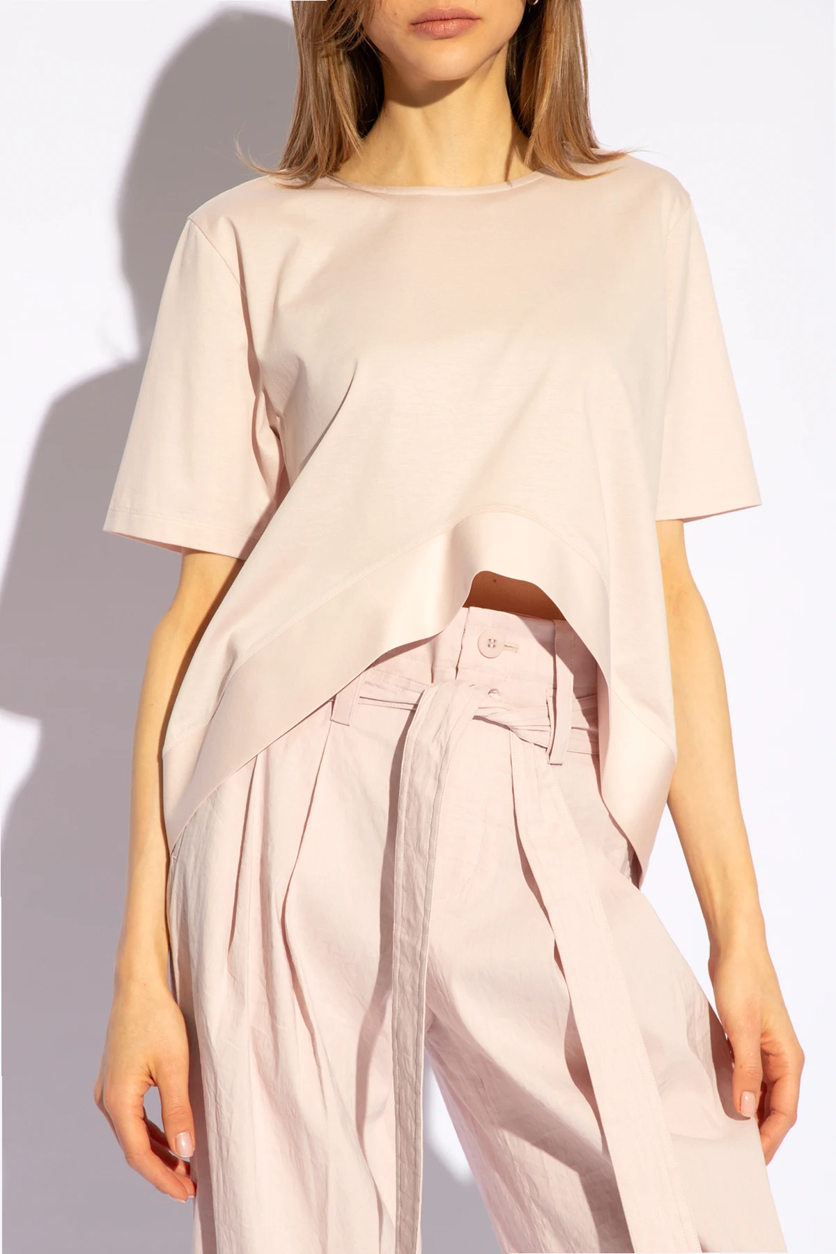 Light pink cropped asymmetrical top with a round neck and short sleeves from Issey Miyake. Made of cotton.