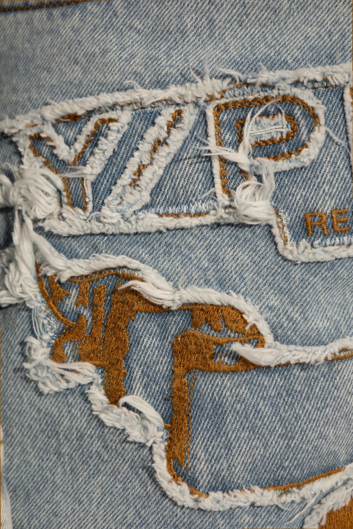 Der einzigartige Charakter dieser Jeans wird durch beige Stoffbeschriftungen unterstrichen, die strategisch im oberen Bereich der Hose, in der Nähe des Bundes und der Taschen angebracht sind. Sie dienen nicht nur als identifizierendes Element der Marke, sondern verleihen den Hosen auch einen individuellen Charakter. Die Rückseite ist in ihrer Einfachheit gehalten, verziert nur mit einem dezente Designer-Logo-Patch, was den raffinierten Geschmack und die Aufmerksamkeit für Details hervorhebt.