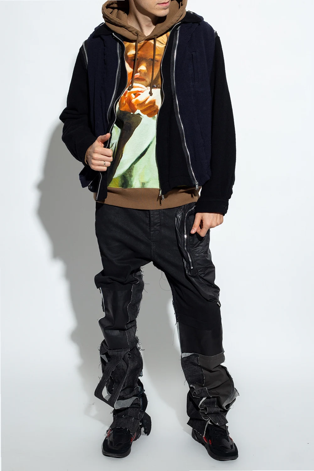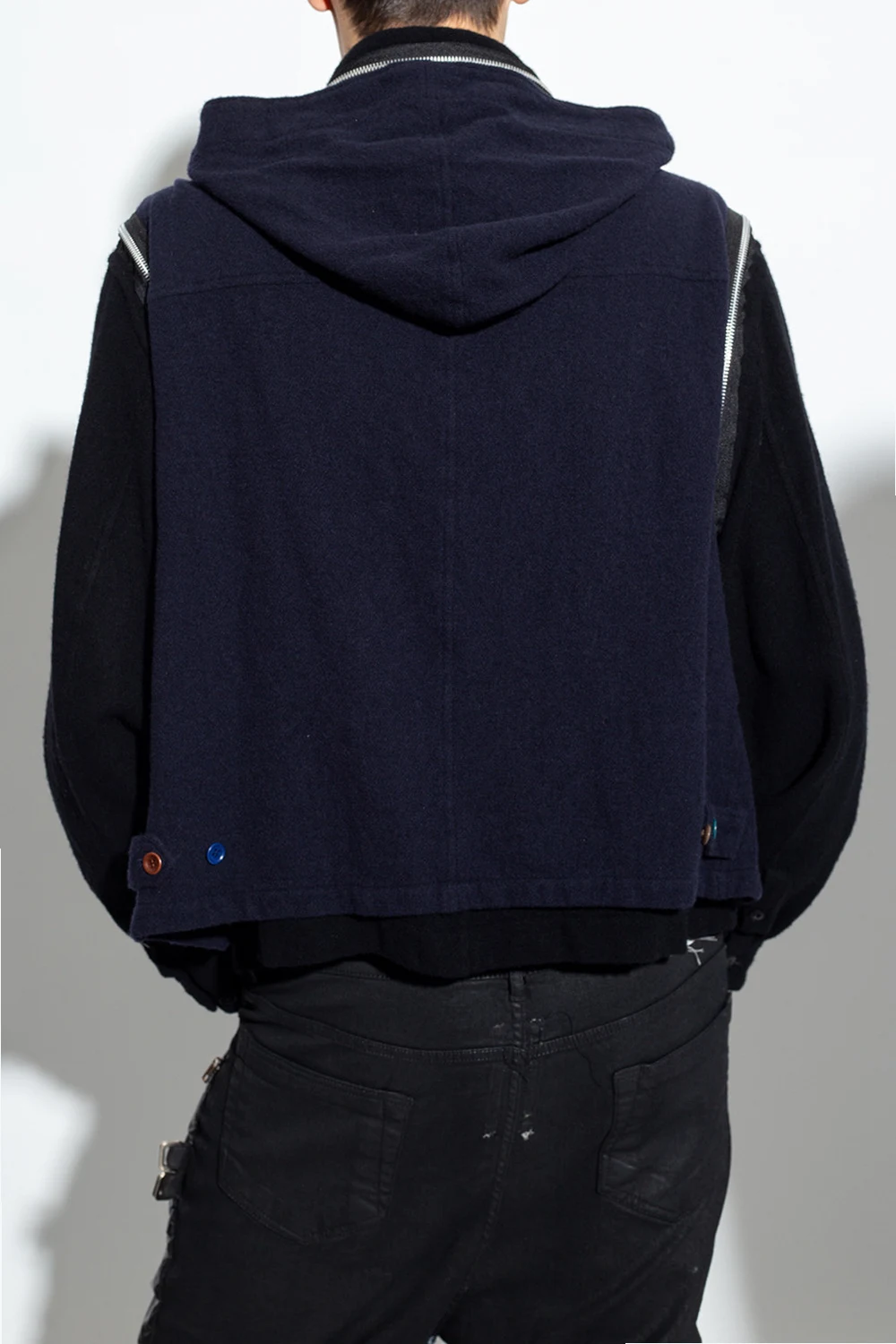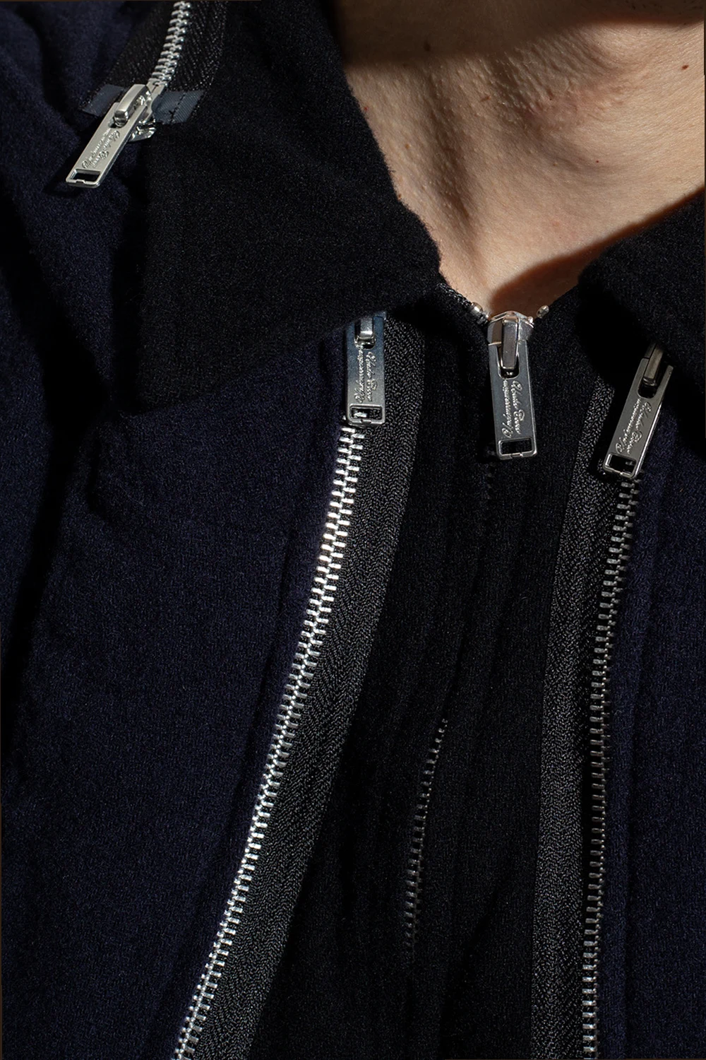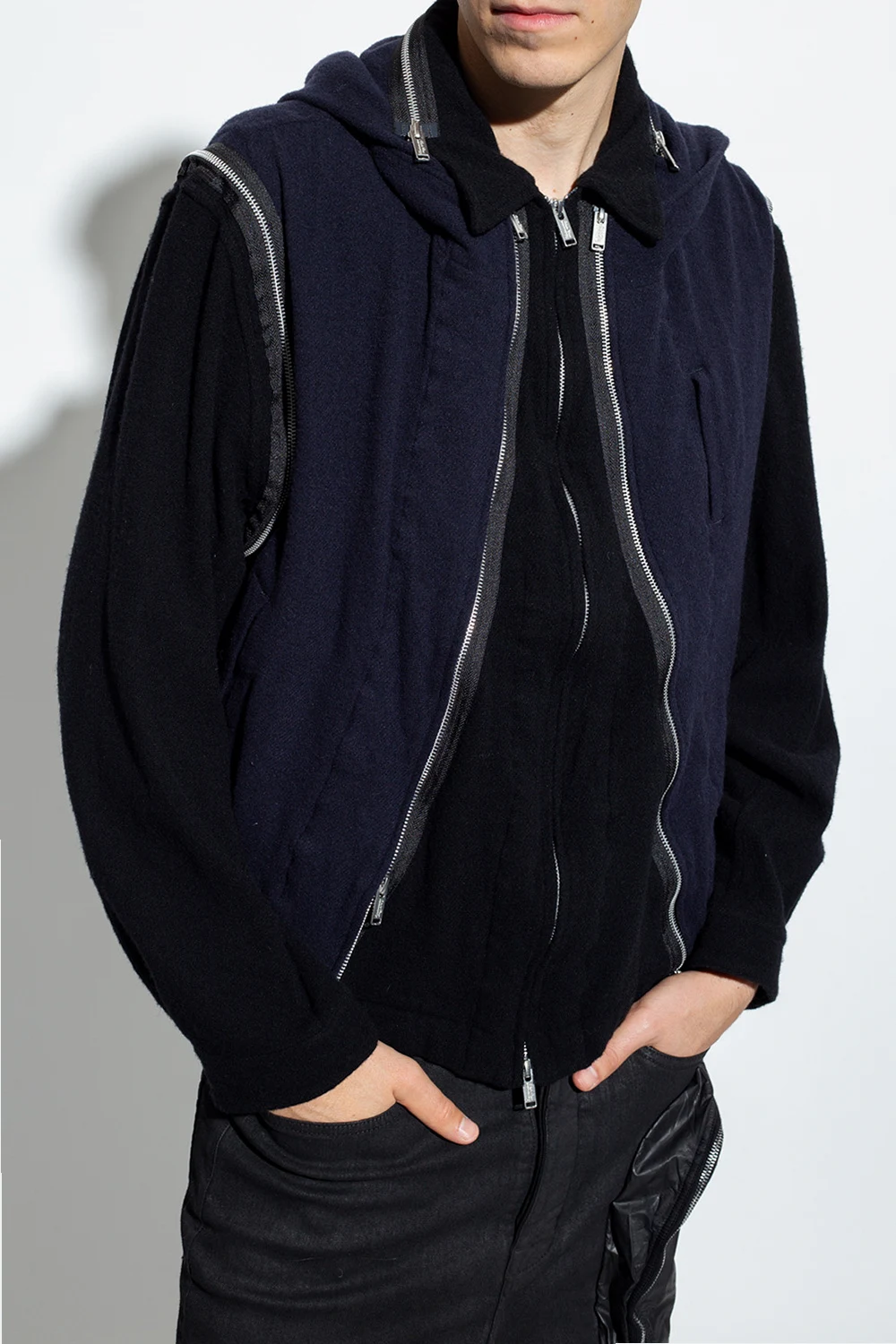 Navy blue and black jacket from Undercover. Made of wool, this style features a zip fastening, three slip pockets and long sleeves with button cuffs.