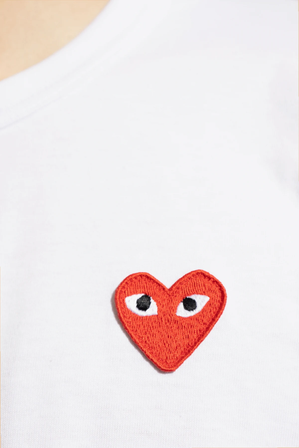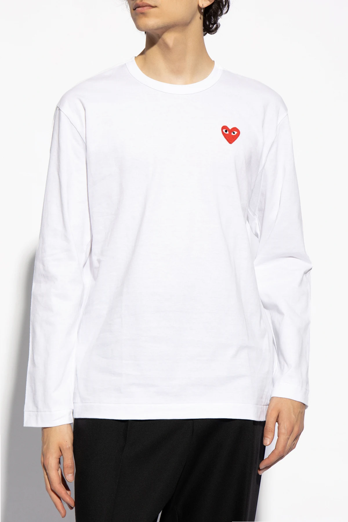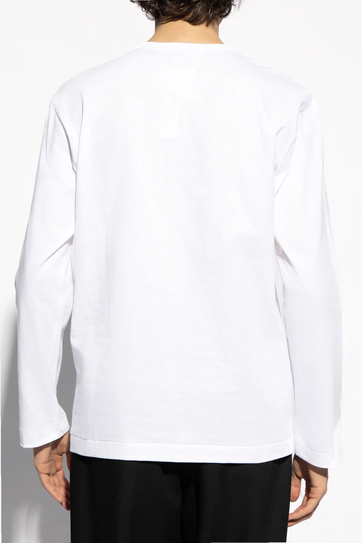 White T-shirt from Comme Des Garçons Play. Made of cotton. Front decorated with a logo patch in red, white and black. Round neck. Long sleeves.