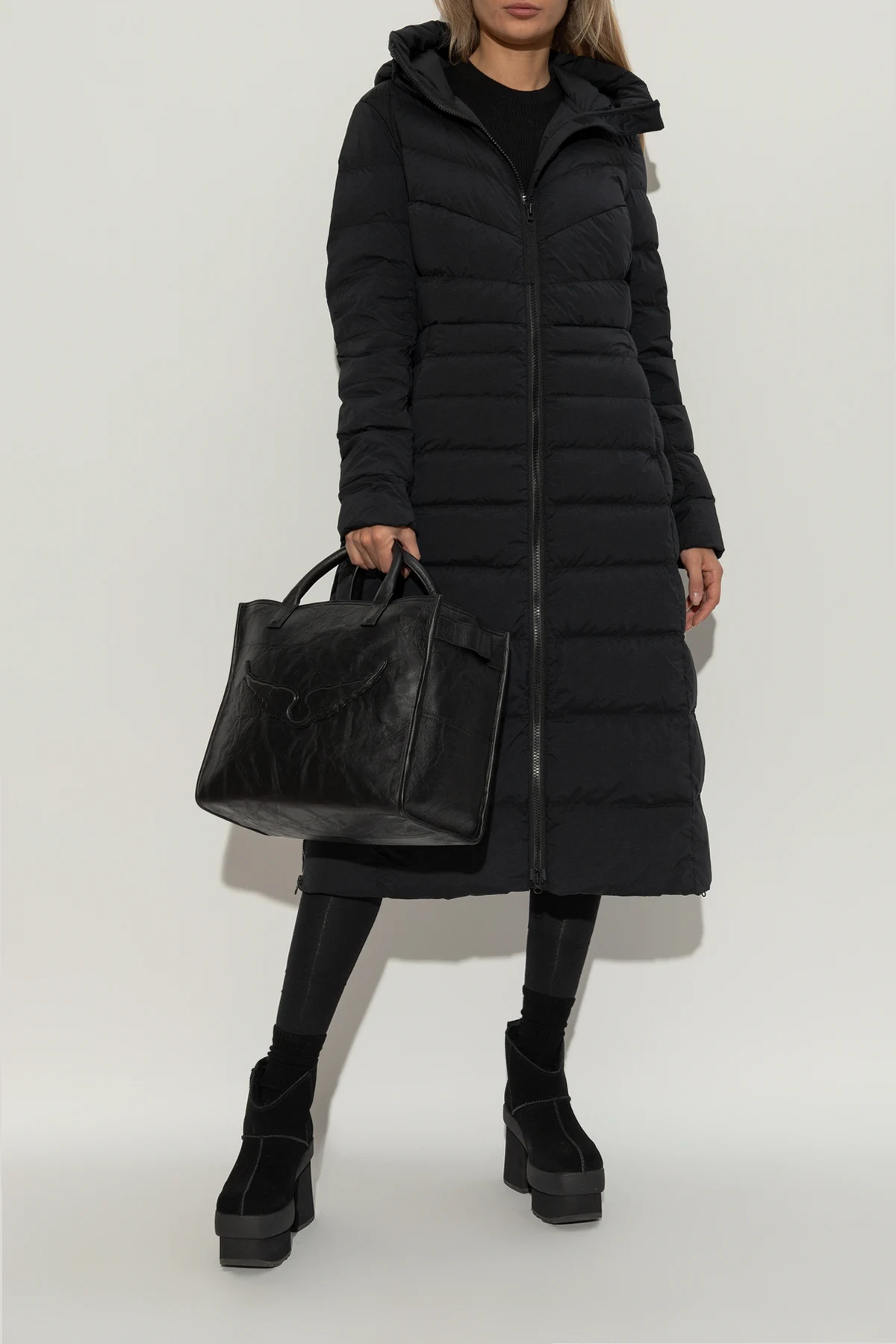 Die High-Heeled Boots verfügen über einen kurzen Schaft, der bis zum Knöchel reicht, eine massive Plateausohle und einen breiten, stabilen Absatz. Das minimalistische Design mit klaren Linien und einheitlicher schwarzer Farbe macht sie zur idealen Wahl sowohl für lässige als auch formellere Outfits.