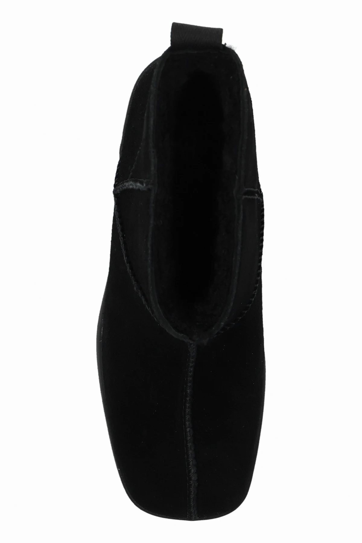 Der obere Teil der High-Heeled Boots besteht aus Wildleder, während die Sohle und der Absatz aus solidem Gummimaterial gefertigt sind. Auf der Rückseite befindet sich eine Schlaufe, die das Anziehen erleichtert, und ein Designer-Logo-Patch an der Ferse verleiht ihnen einen exklusiven Charakter. Sichtbare Nähte betonen ihre Konstruktion und verleihen ihnen ein einzigartiges Aussehen.