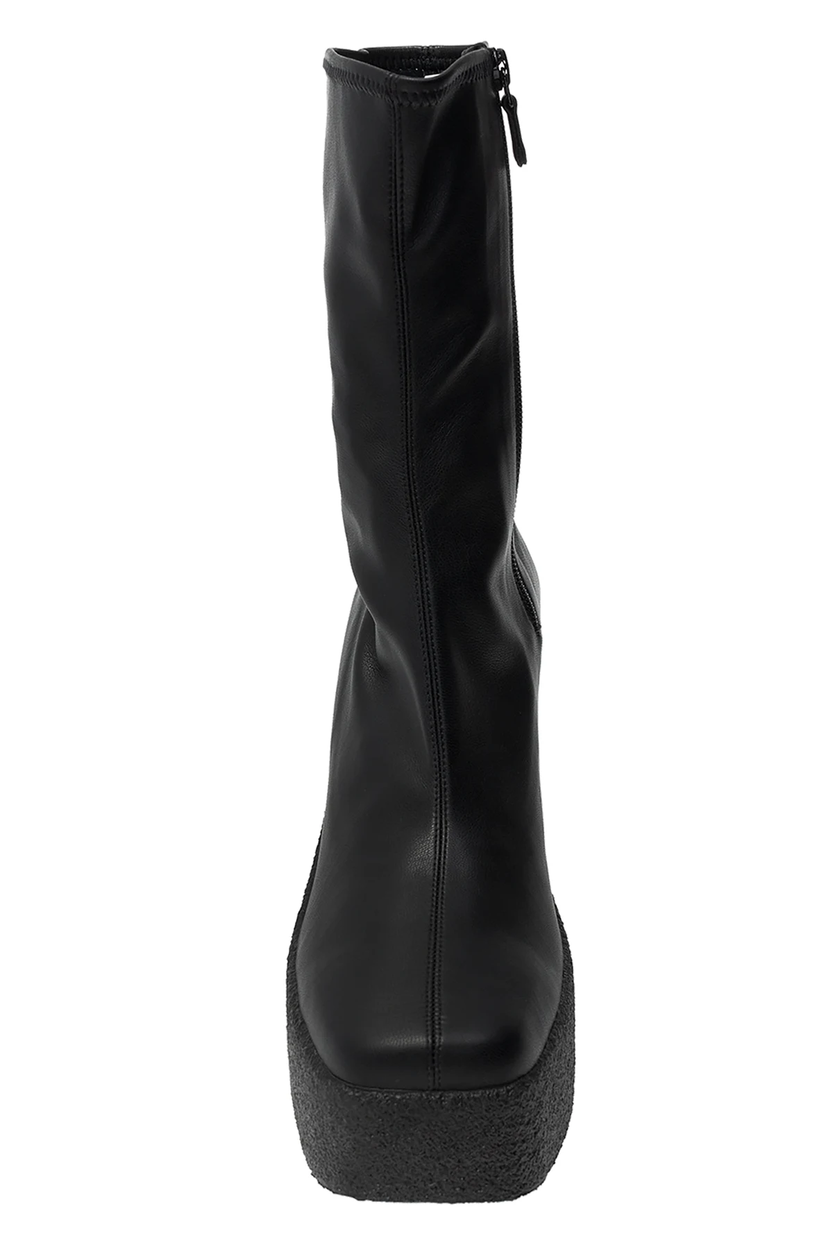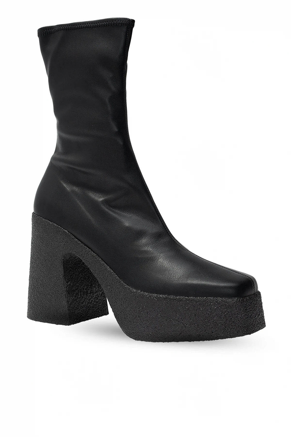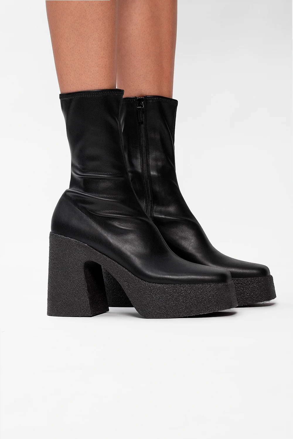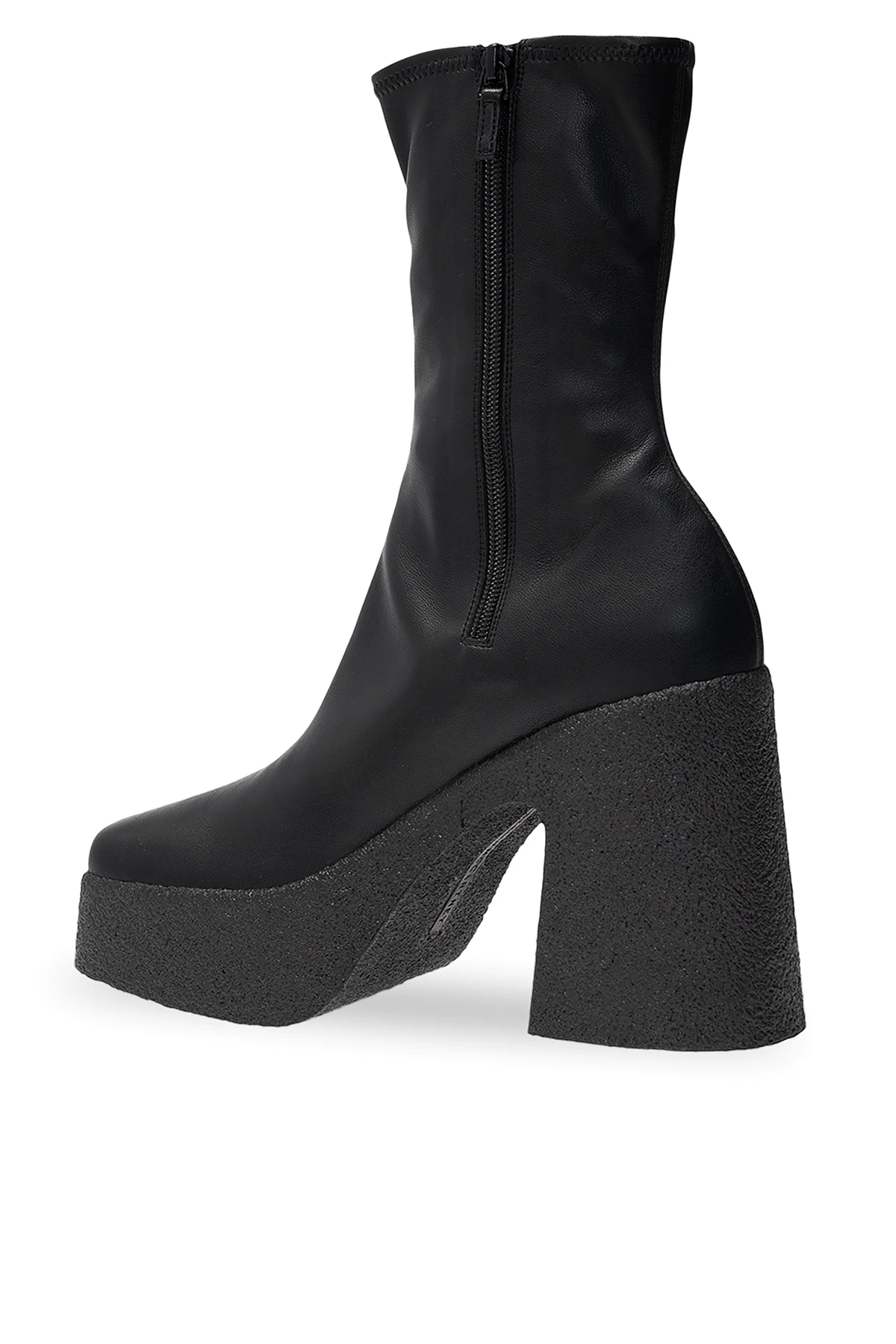 Black heeled ankle boots from Stella McCartney. Crafted from varnished eco-friendly material, this pair fastens via zip on the side and sits on a black rubber sole.