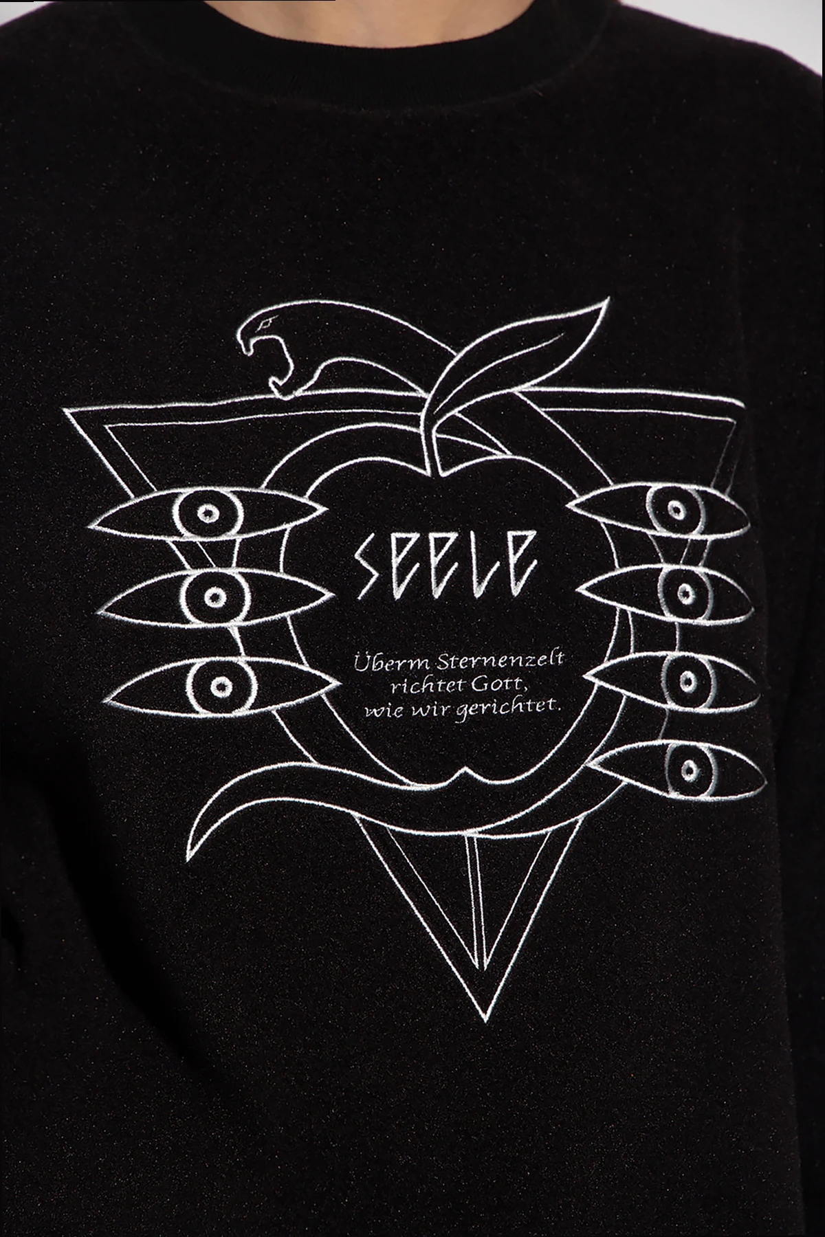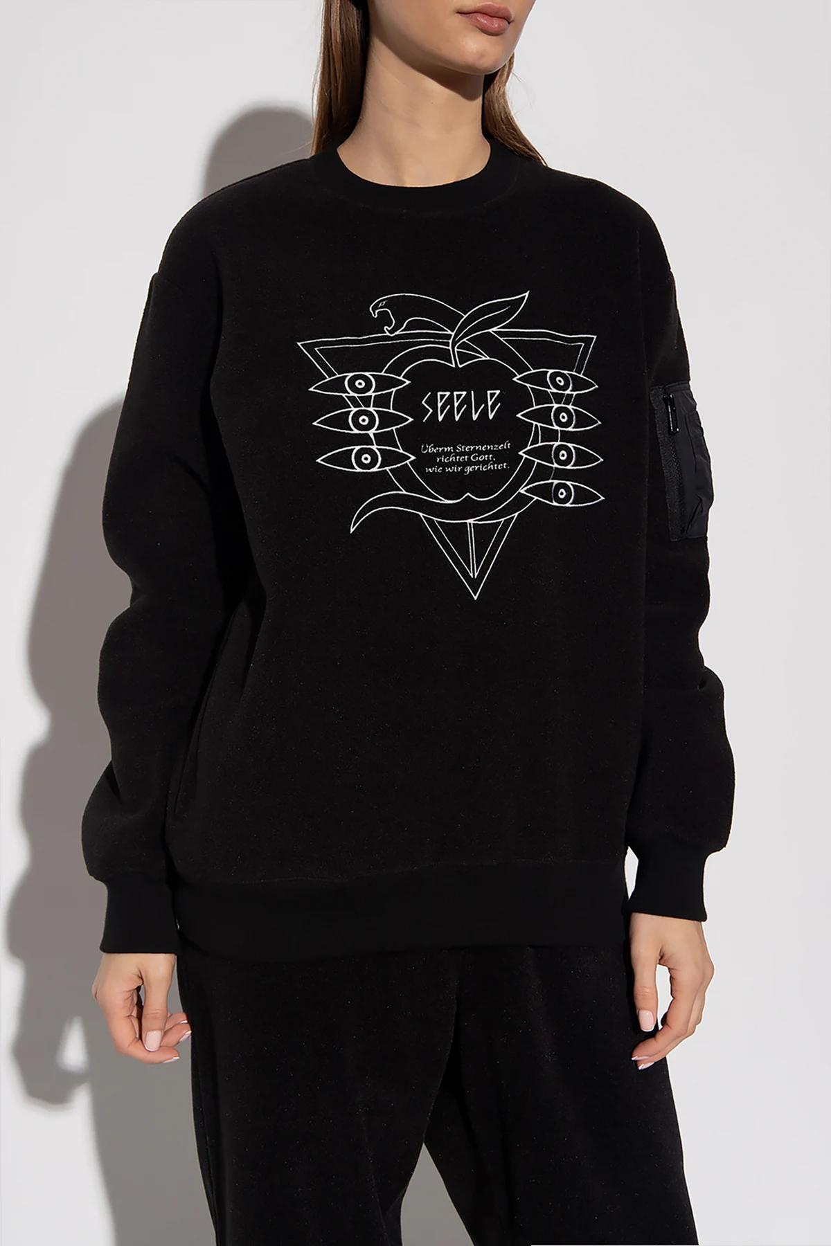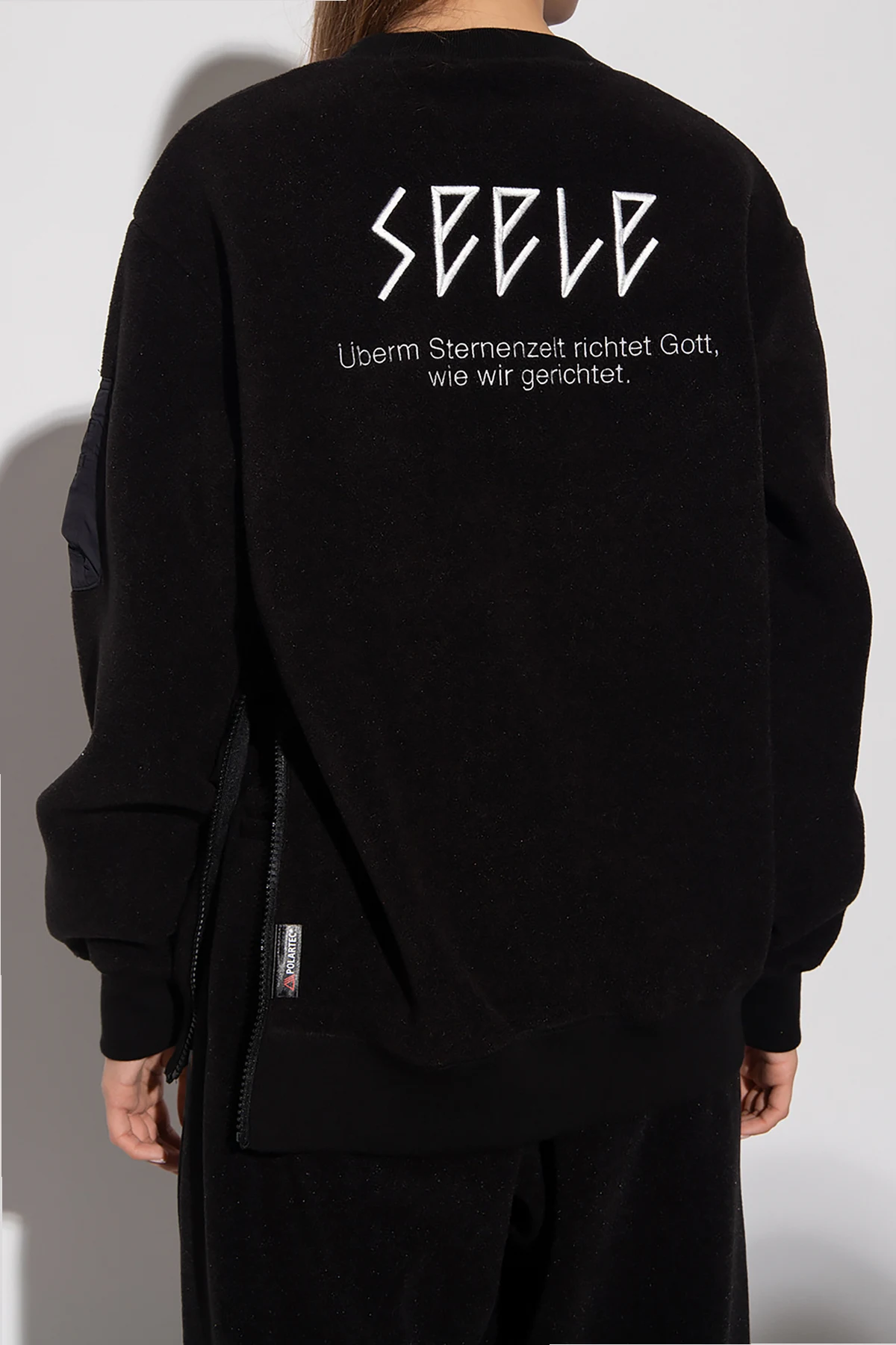 Black fleece sweatshirt from Undercover. Made of Polartec®, this garment features a zip fastening, white stitching details, one slip pocket, zipped sleeve pocket and ribbed trims at the crew neck, hem and cuffs.