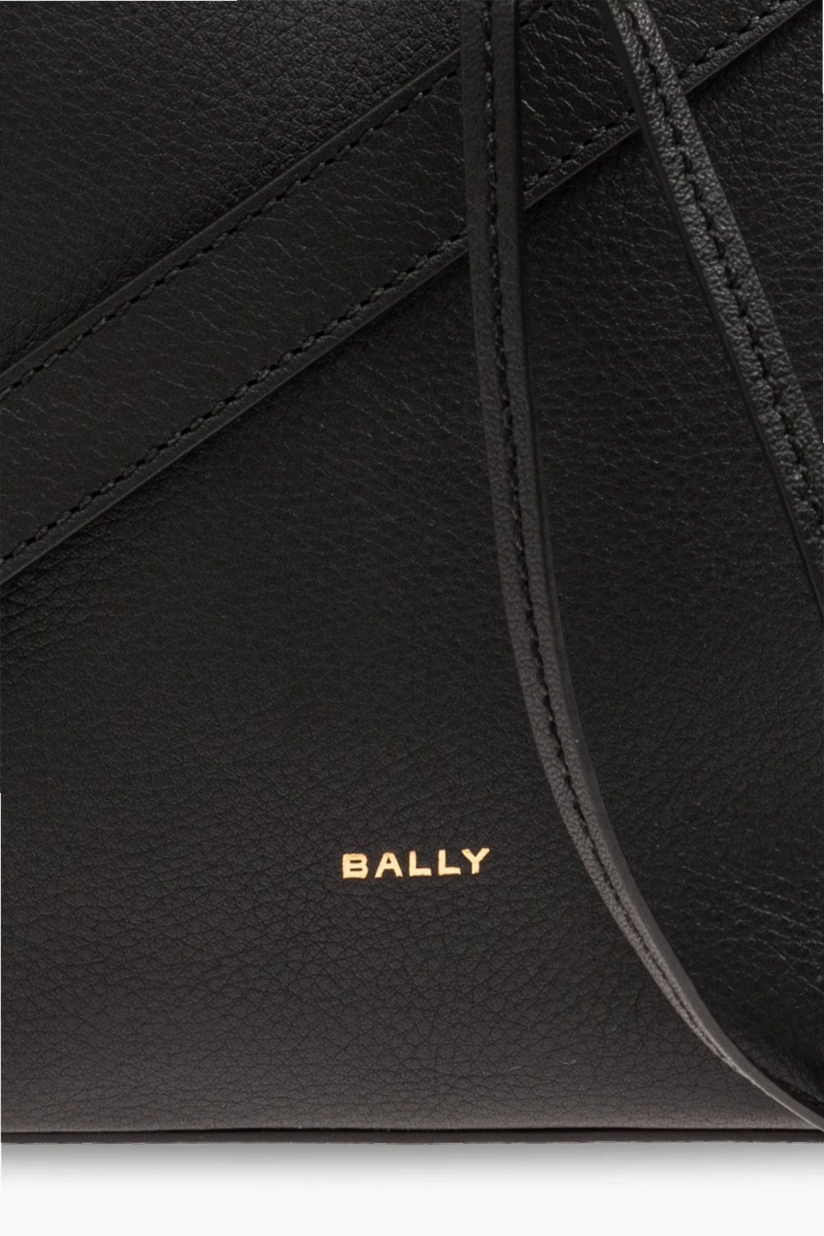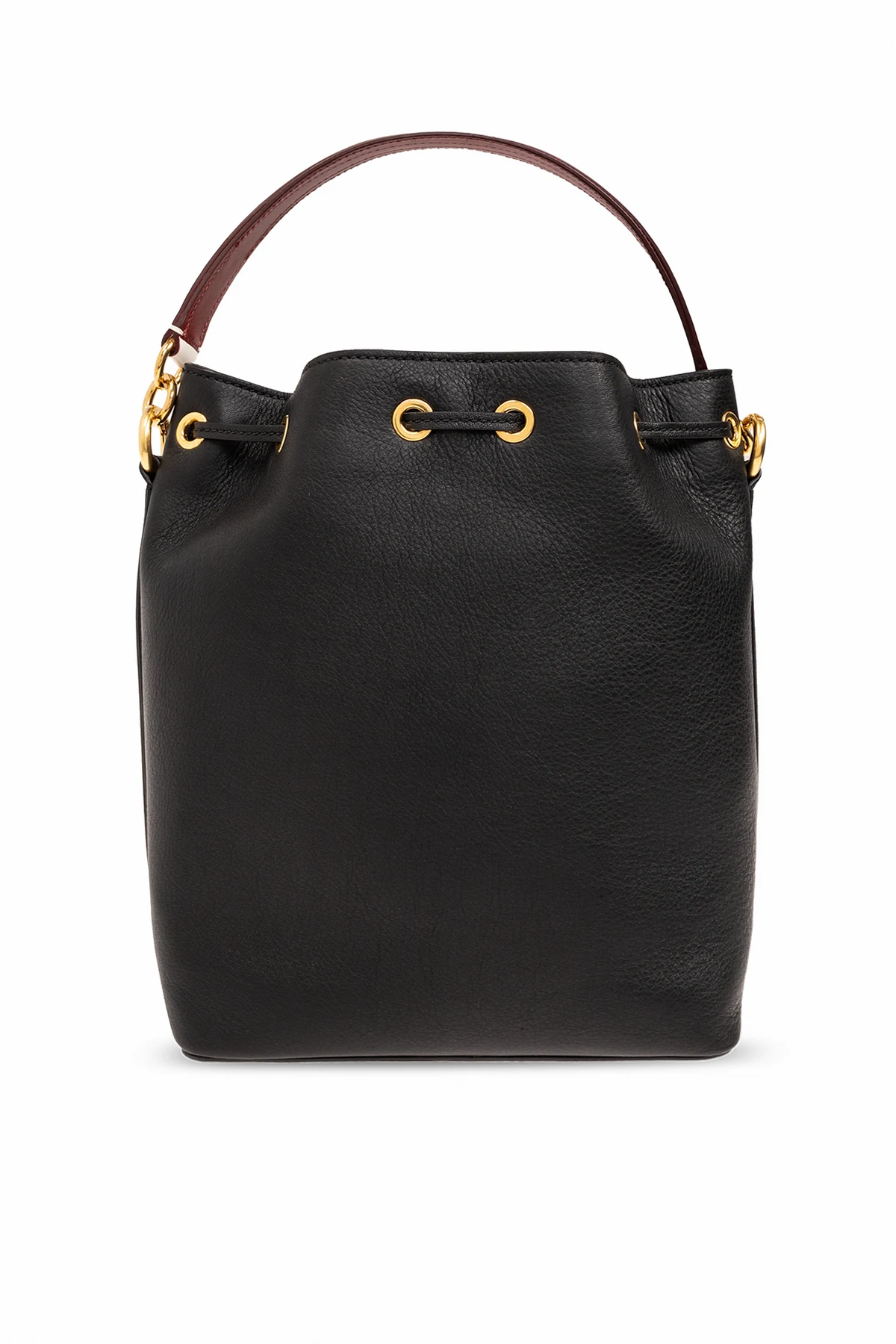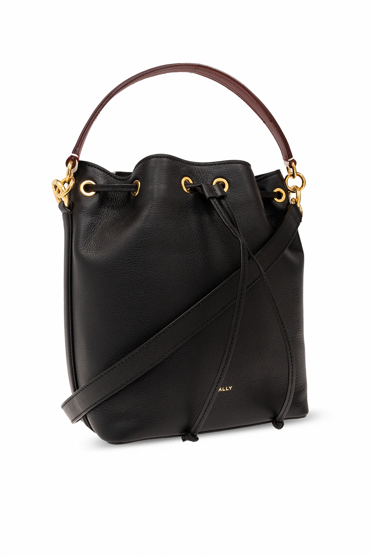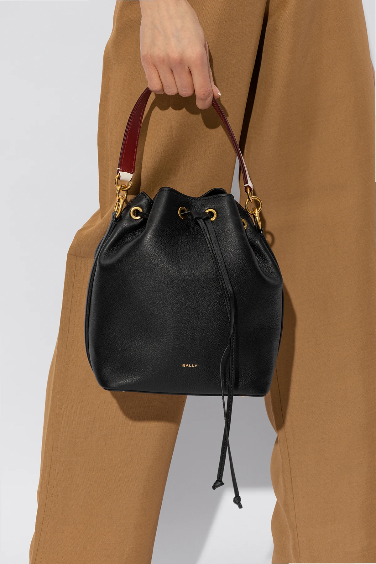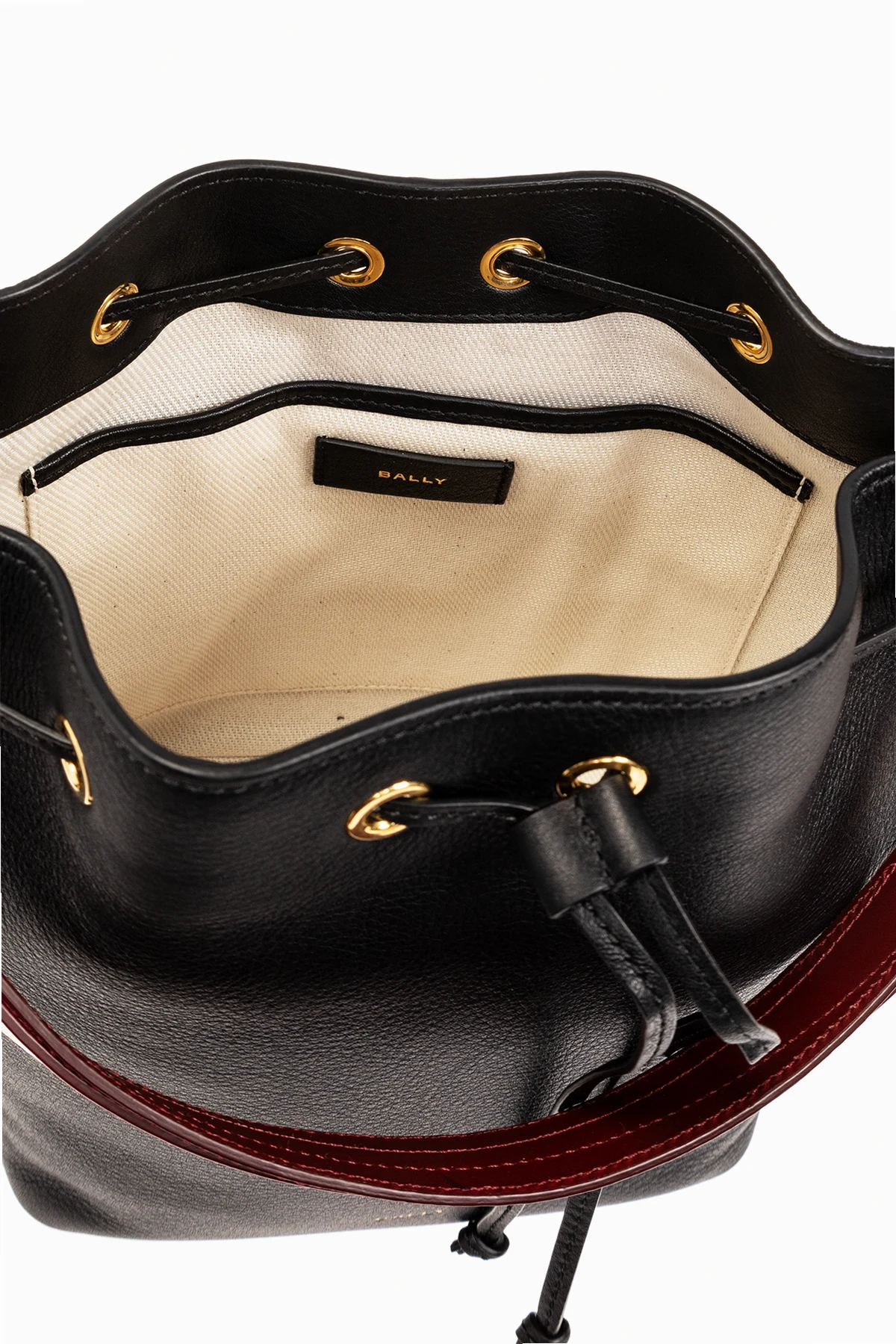 Black ‘Code Mini’ bucket bag from Bally. Made of leather, this model features drawstrings, a gold-tone logo print, detachable half-round handle in cream and maroon, detachable and adjustable strap, gold-tone metal hardware and one internal compartment with one zip pocket and one slip pocket.