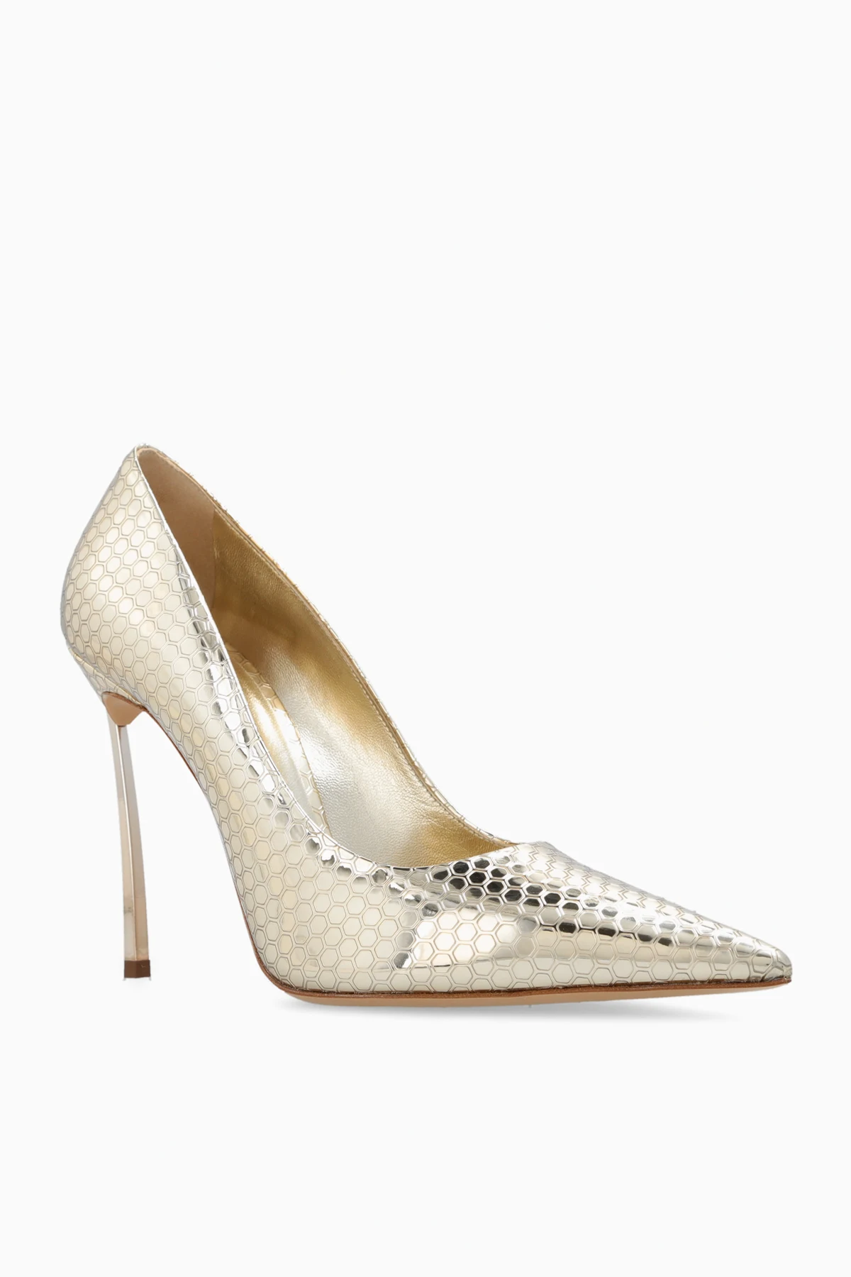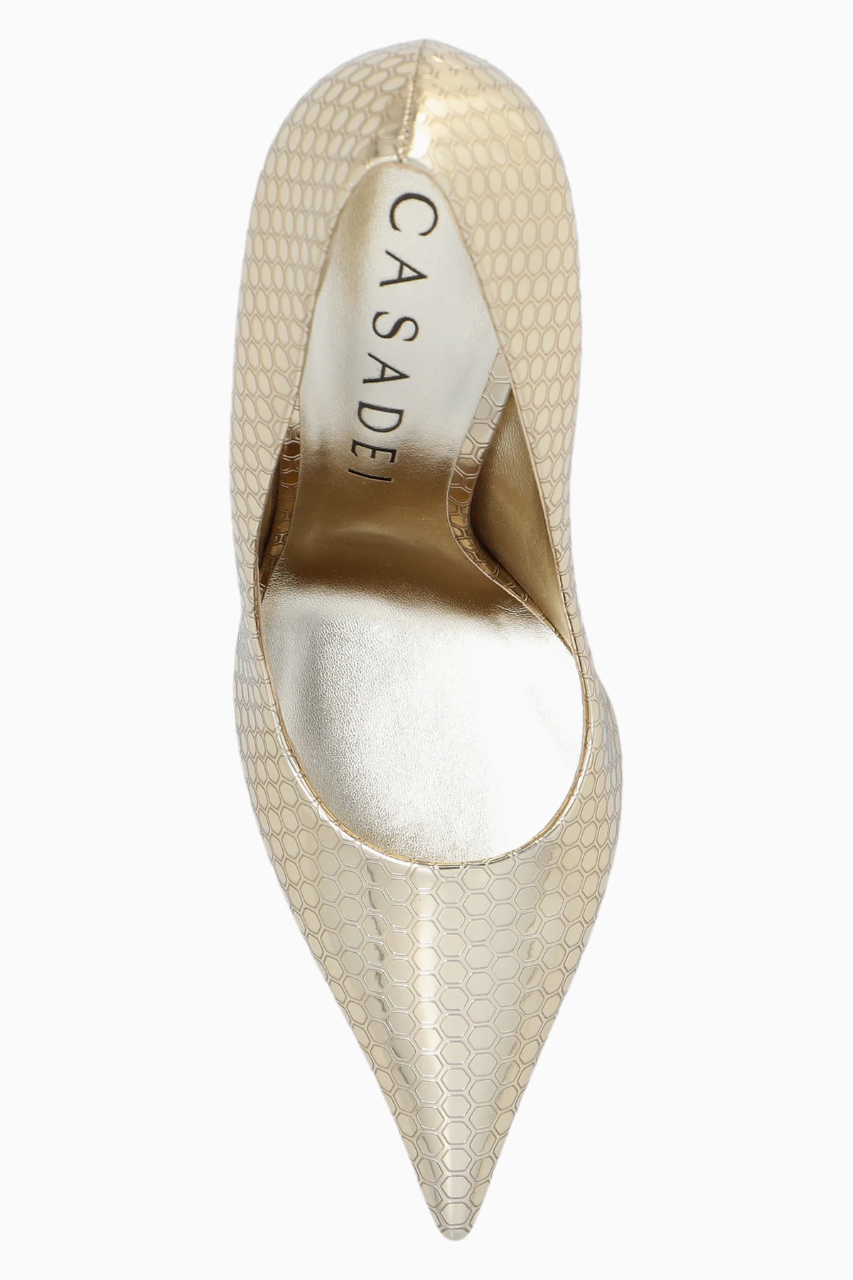 Gold-tone ‘Superblade Atomium’ stiletto pumps from Casadei. Crafted from glossy rubber with a geometrical pattern, this model sits on a beige leather sole and features a pointed-toe silhouette and the brand's signature stainless steel heel.