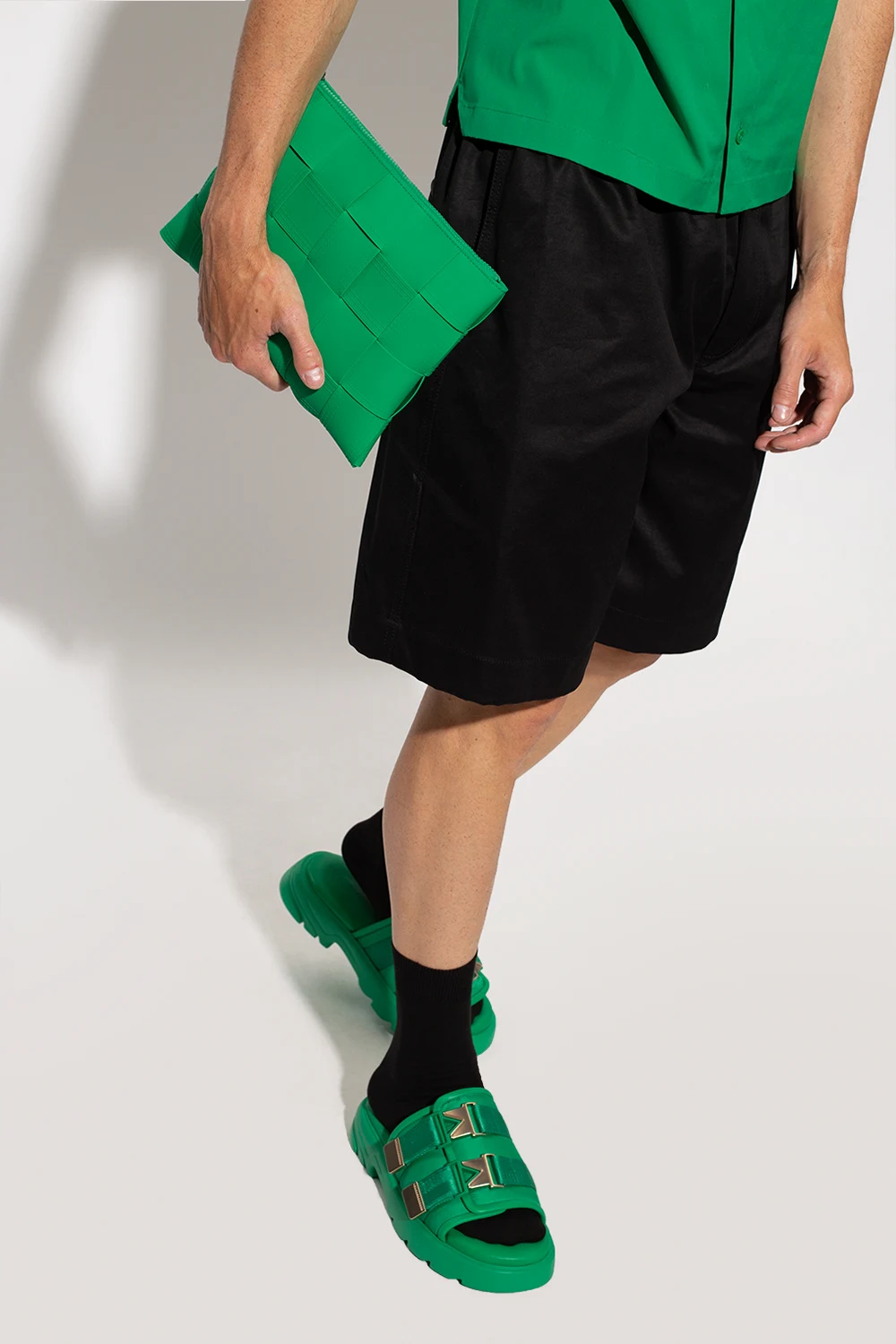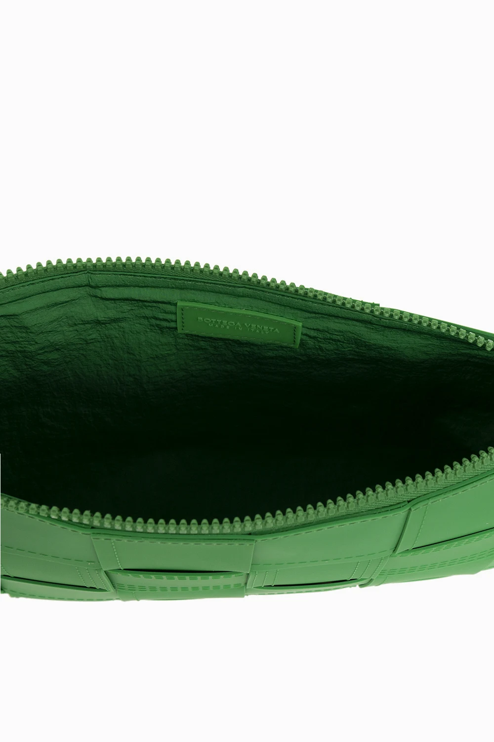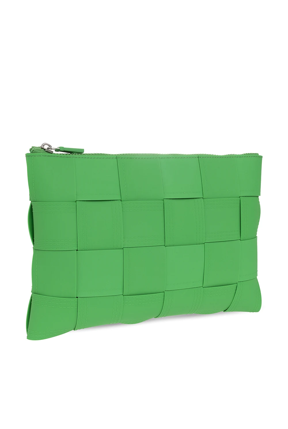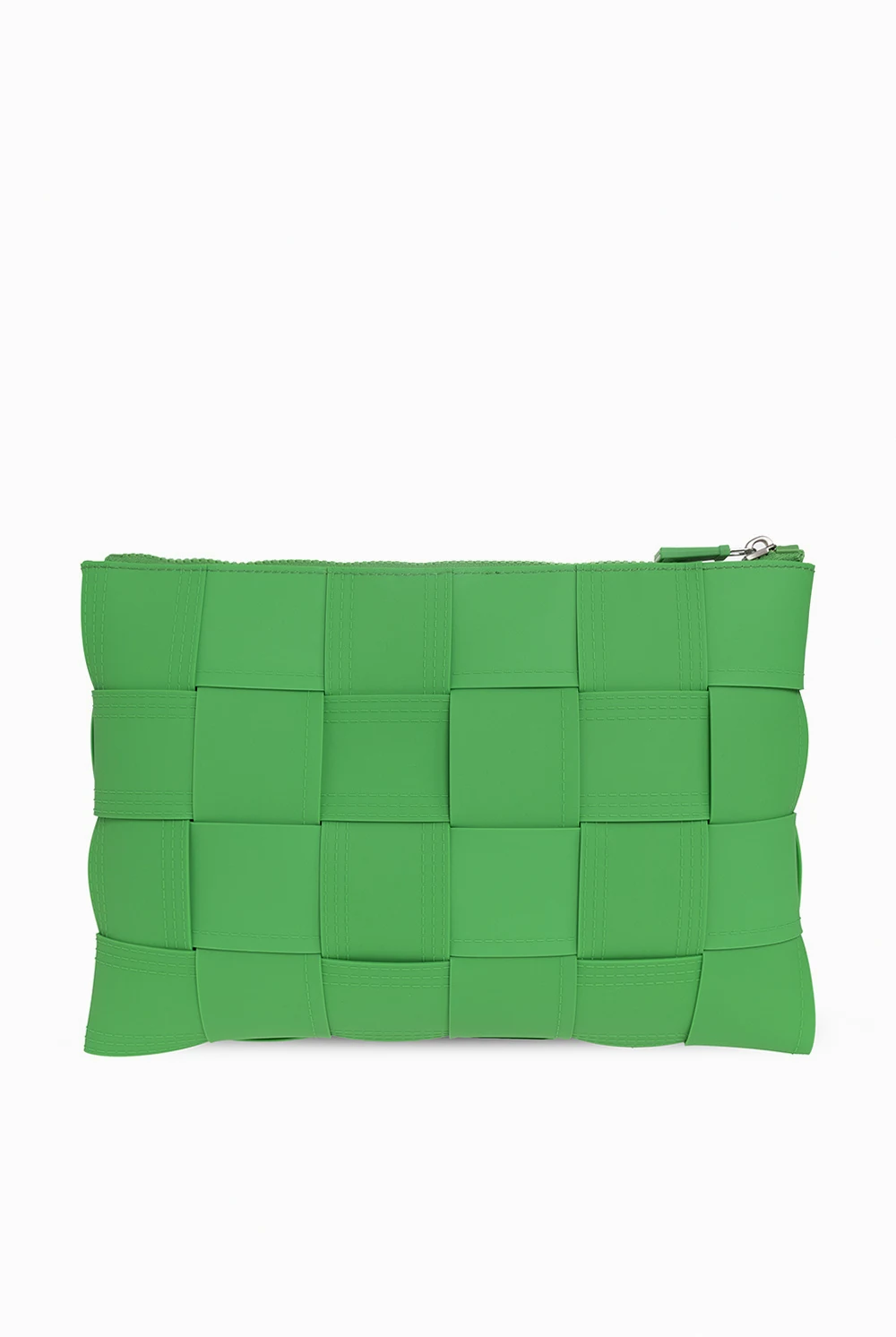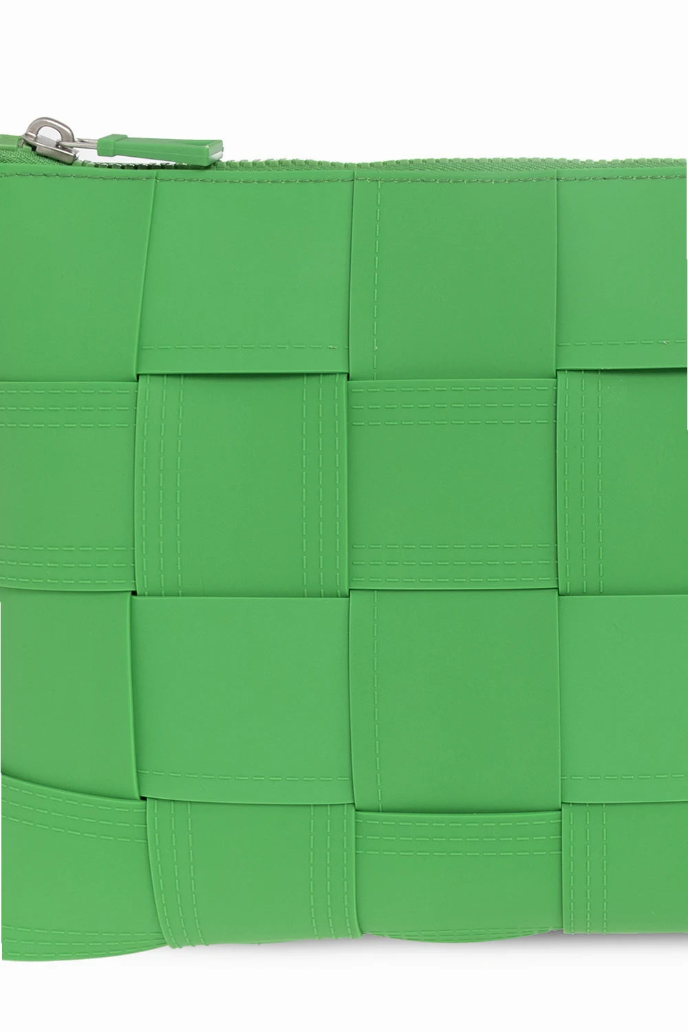 Green ‘Cassette Small’ pouch from Bottega Veneta. Crafted from thermoplastic rubber accentuated with the brand's signature Intreccio weave, this design features a zip fastening, fake seams and one internal compartment.