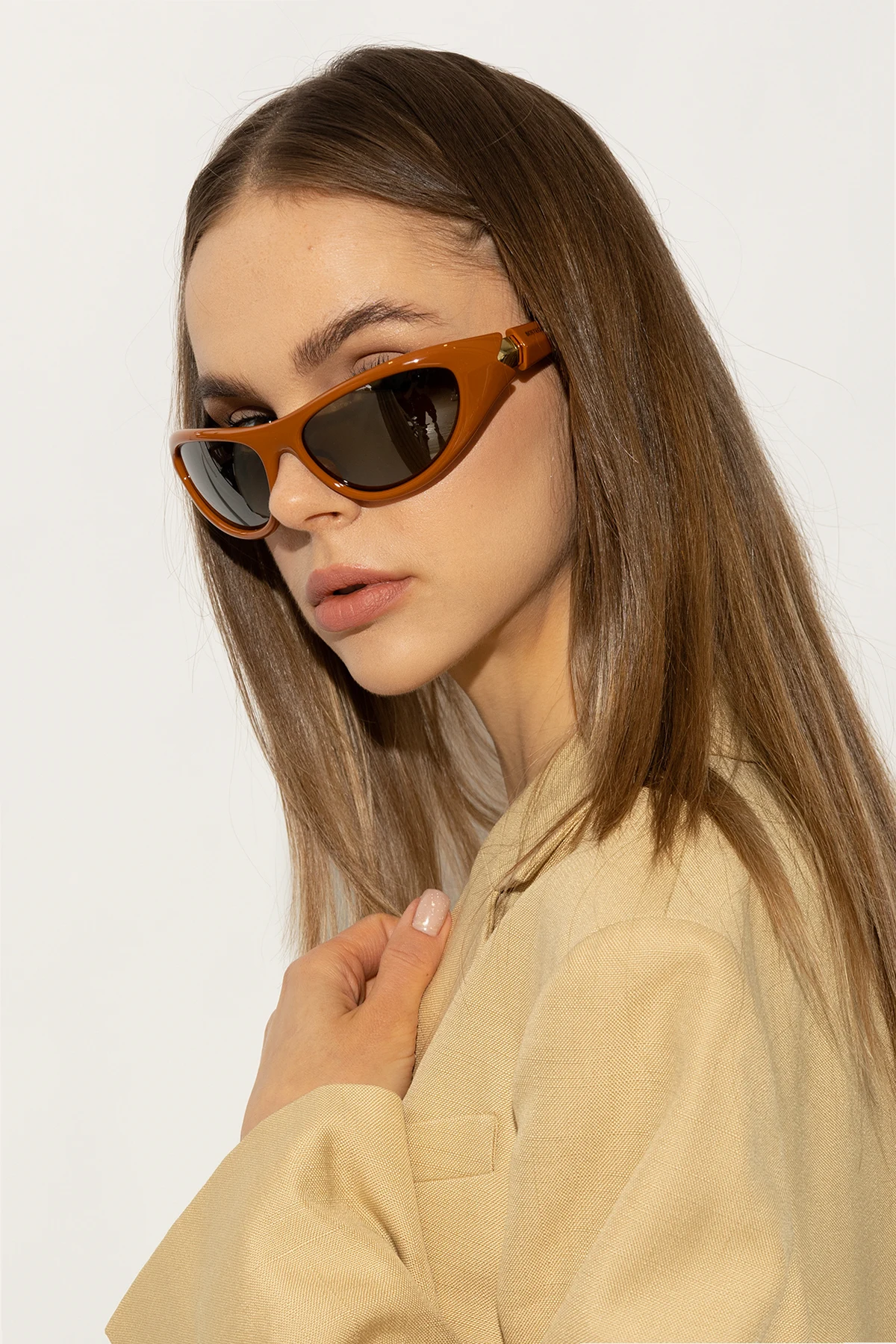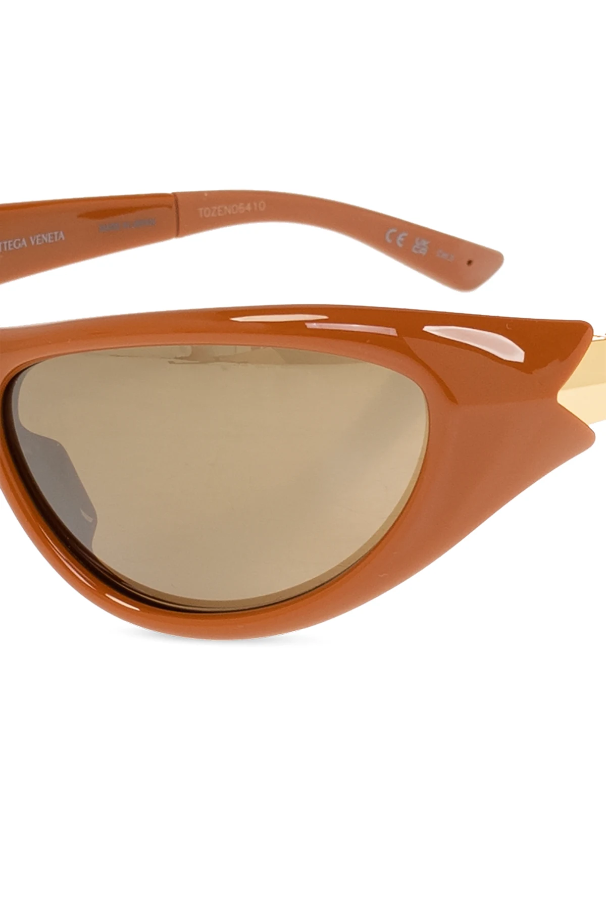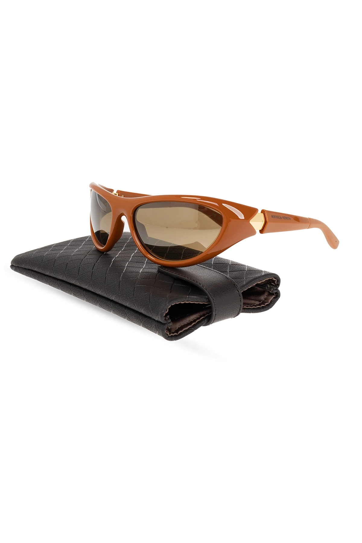 Brown ‘Curve Sporty’ sunglasses from Bottega Veneta. This pair features gold-tone metal hinges, logo printed on the sides, rubber temple tips and brown lenses with 100% UV protection. Case included.