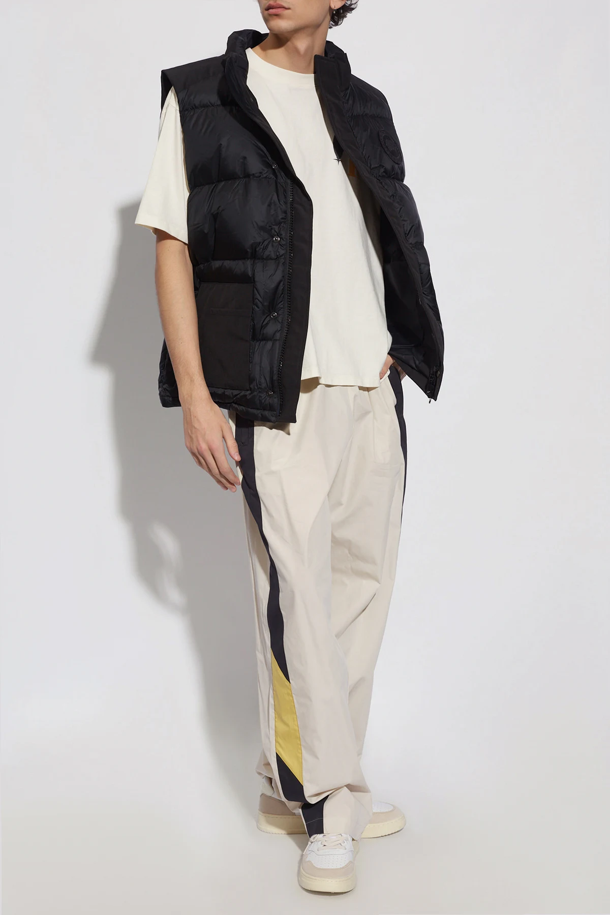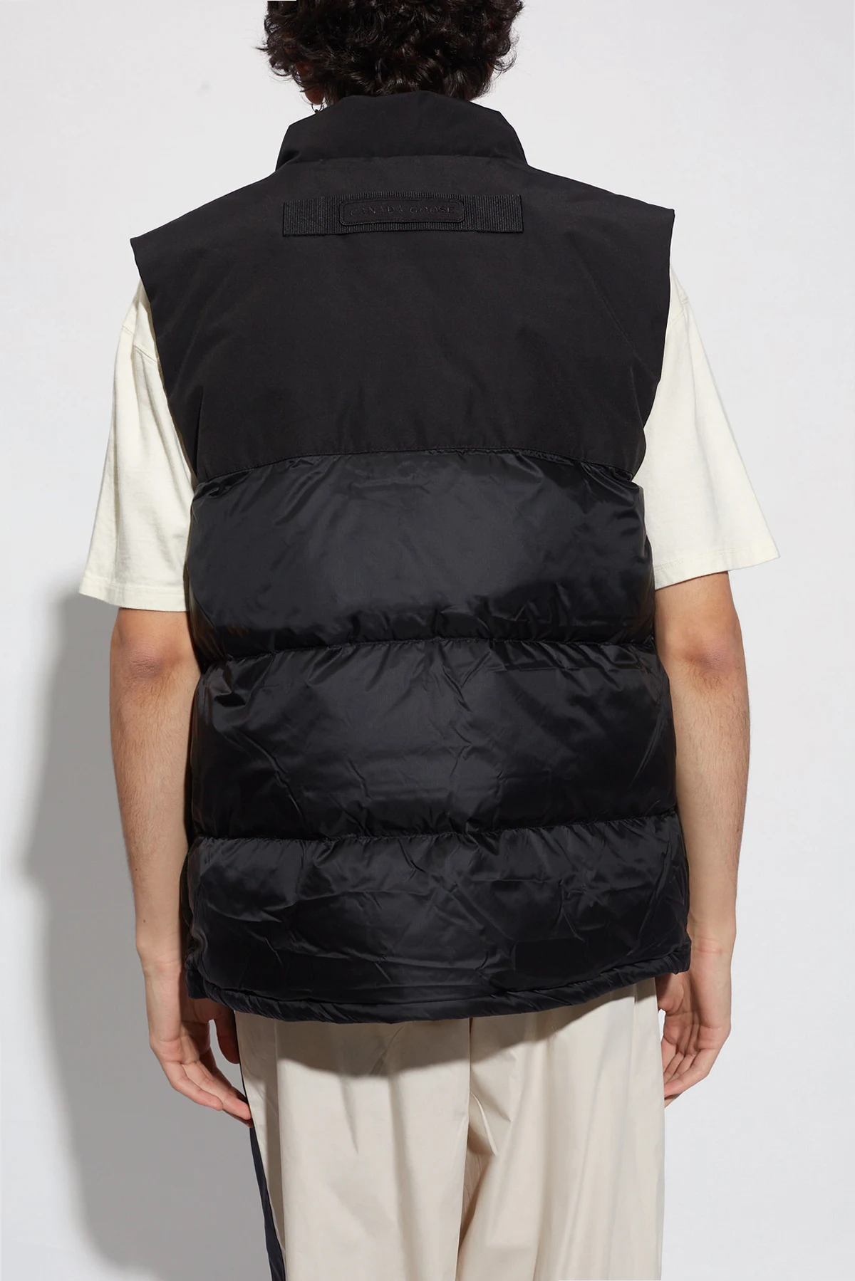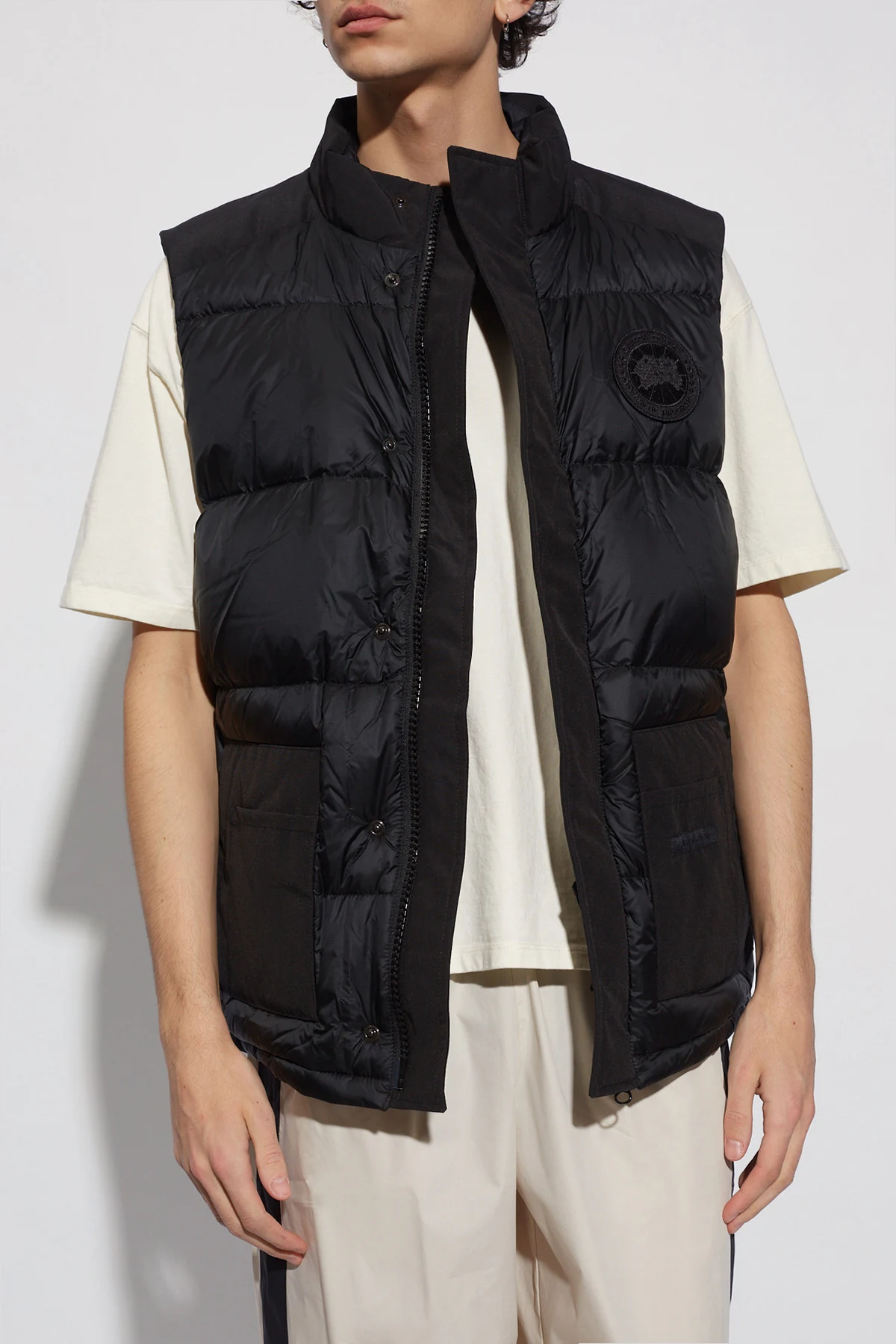 Black ‘Paradigm’ down vest from Canada Goose. Emblazoned with a logo patch on the front, this style fastens with a two-way zip and snaps and features a standing collar and four slip pockets. Temperature range: 5°C/-5°C.