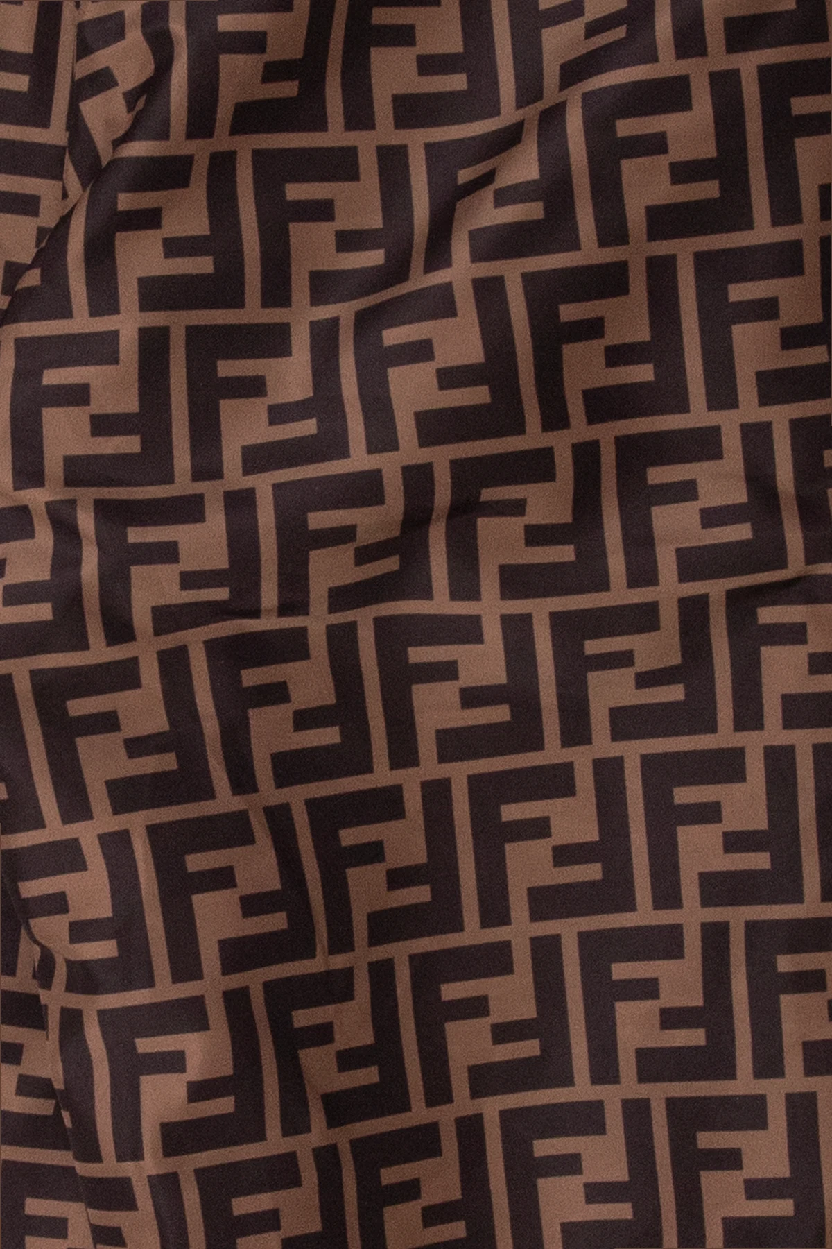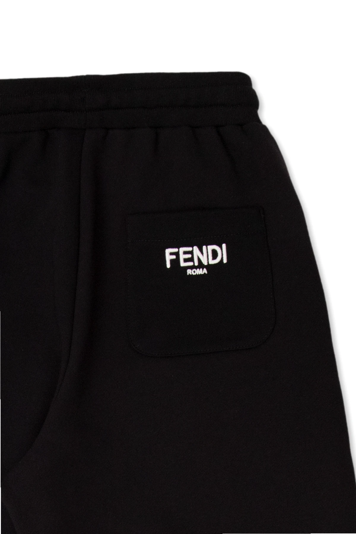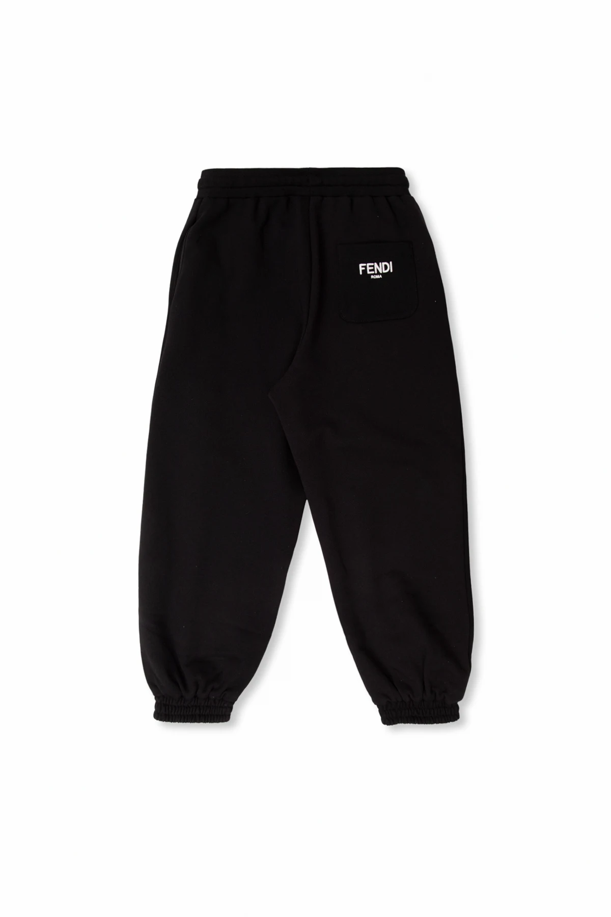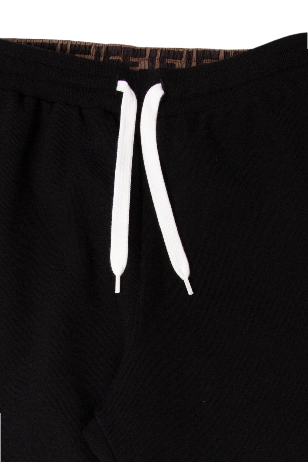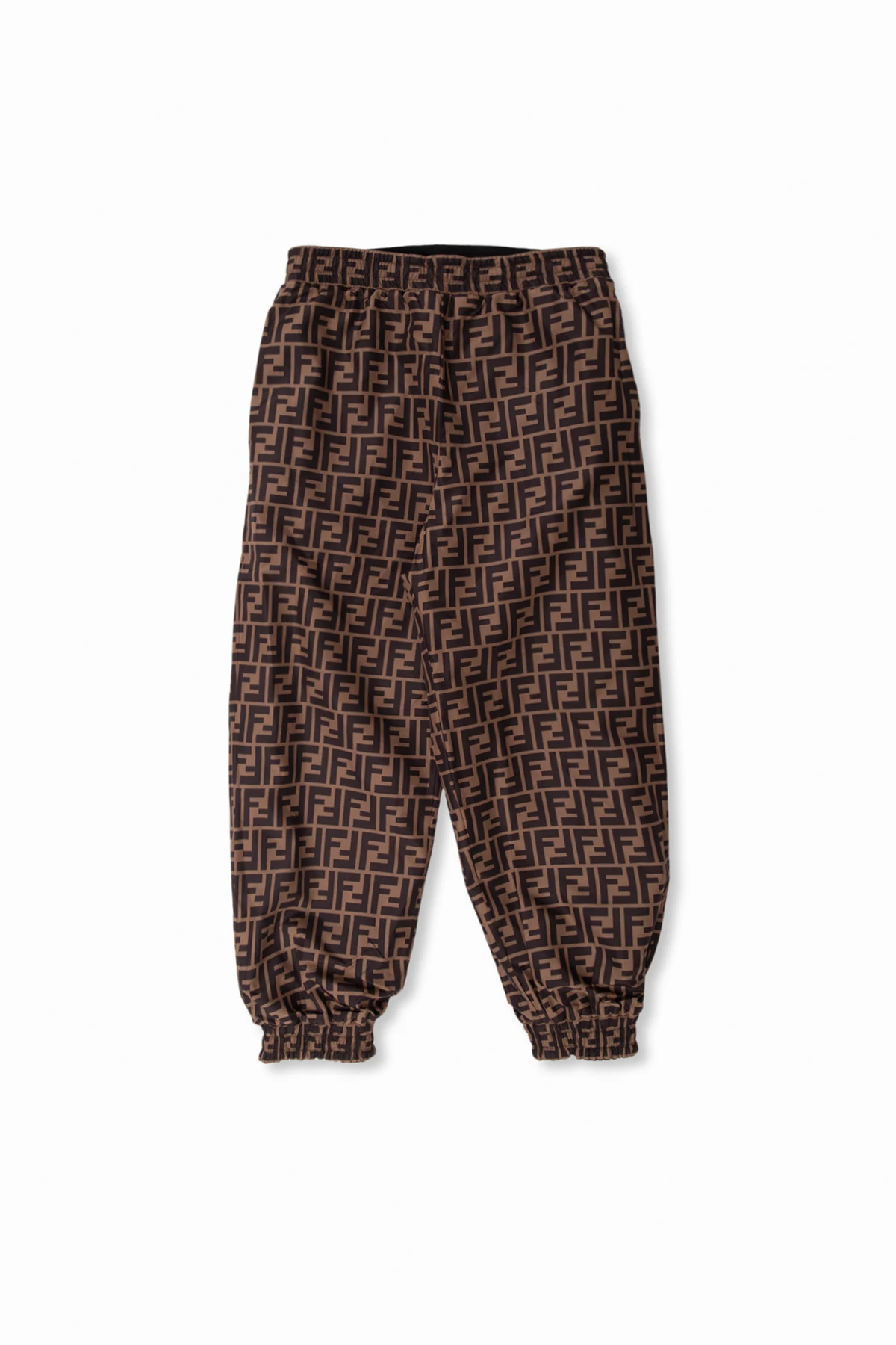Reversible trousers from Fendi Kids. This pair features a drawstring waist and elasticated cuffs. One side is made of black cotton and showcases a white logo and three slip pockets. The other side is embellished with a brown monogram and features two slip pockets.