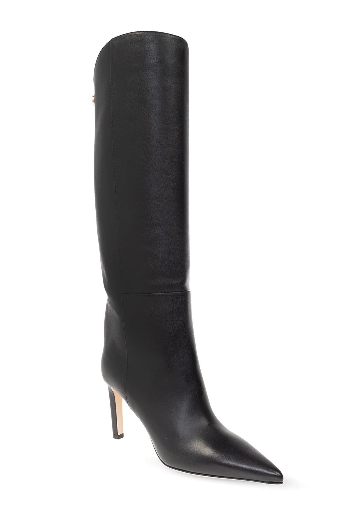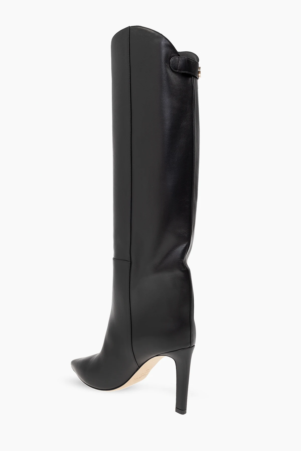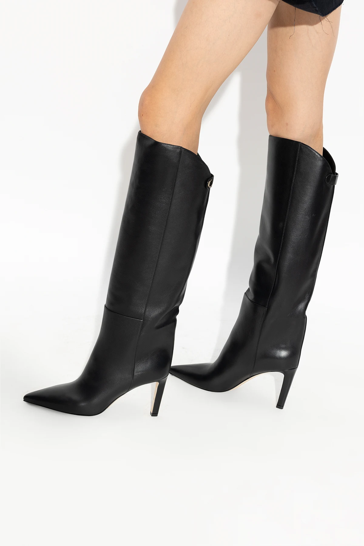 Black ‘Alizze’ boots from Jimmy Choo. Crafted from leather, this slip-on pair features a snap fastening at the back, pointed toe and beige leather sole.