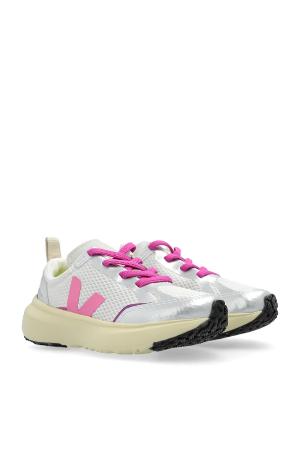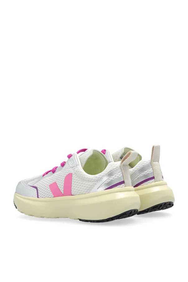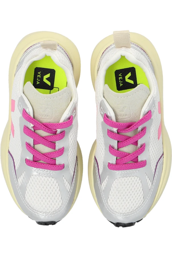 Muster und Farbgebung: Die dominierende Farbe ist Weiß, ergänzt durch bunte Akzente. Das Veja-Logo in Rosa sowie die rosa Schnürsenkel verleihen den Schuhen ein lebendiges und fröhliches Aussehen.
