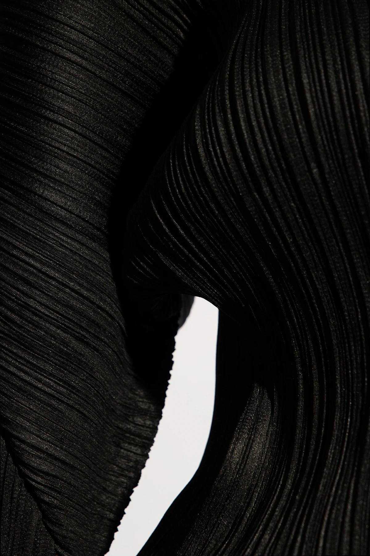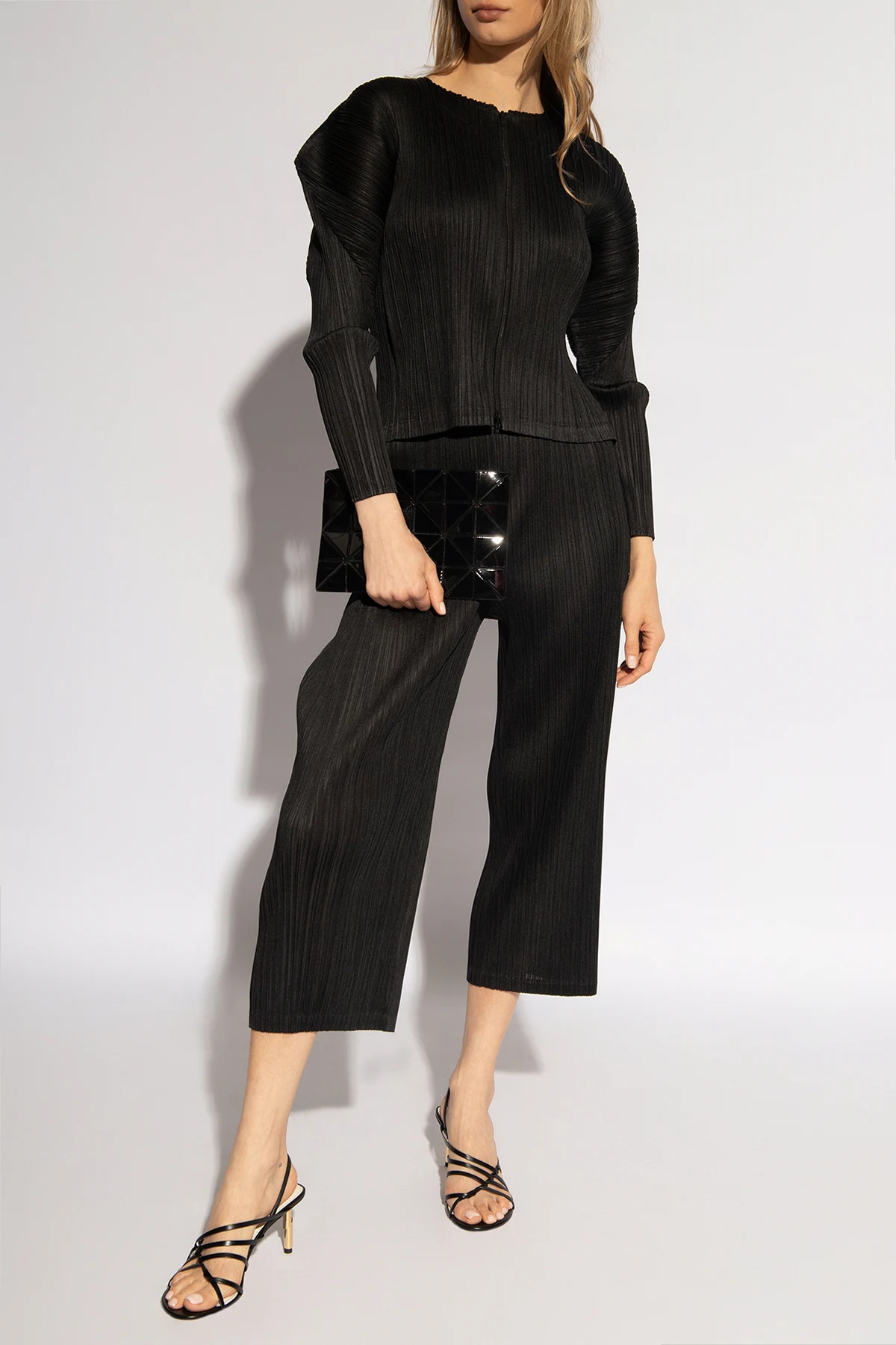 Black cardigan from Issey Miyake Pleats Please. Crafted using the pleating technique, this style fastens via a two-way zip and features a round neck and long sleeves.