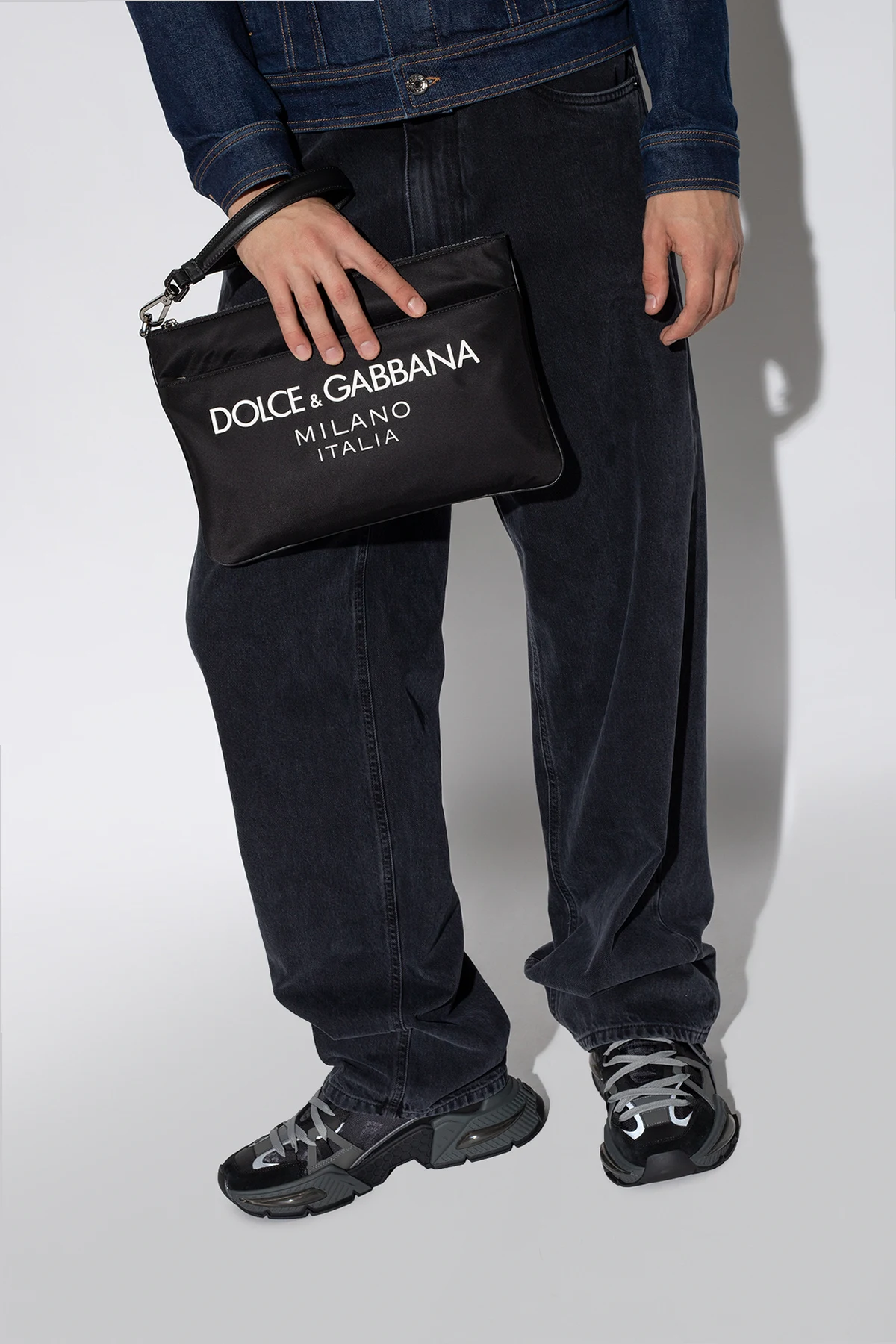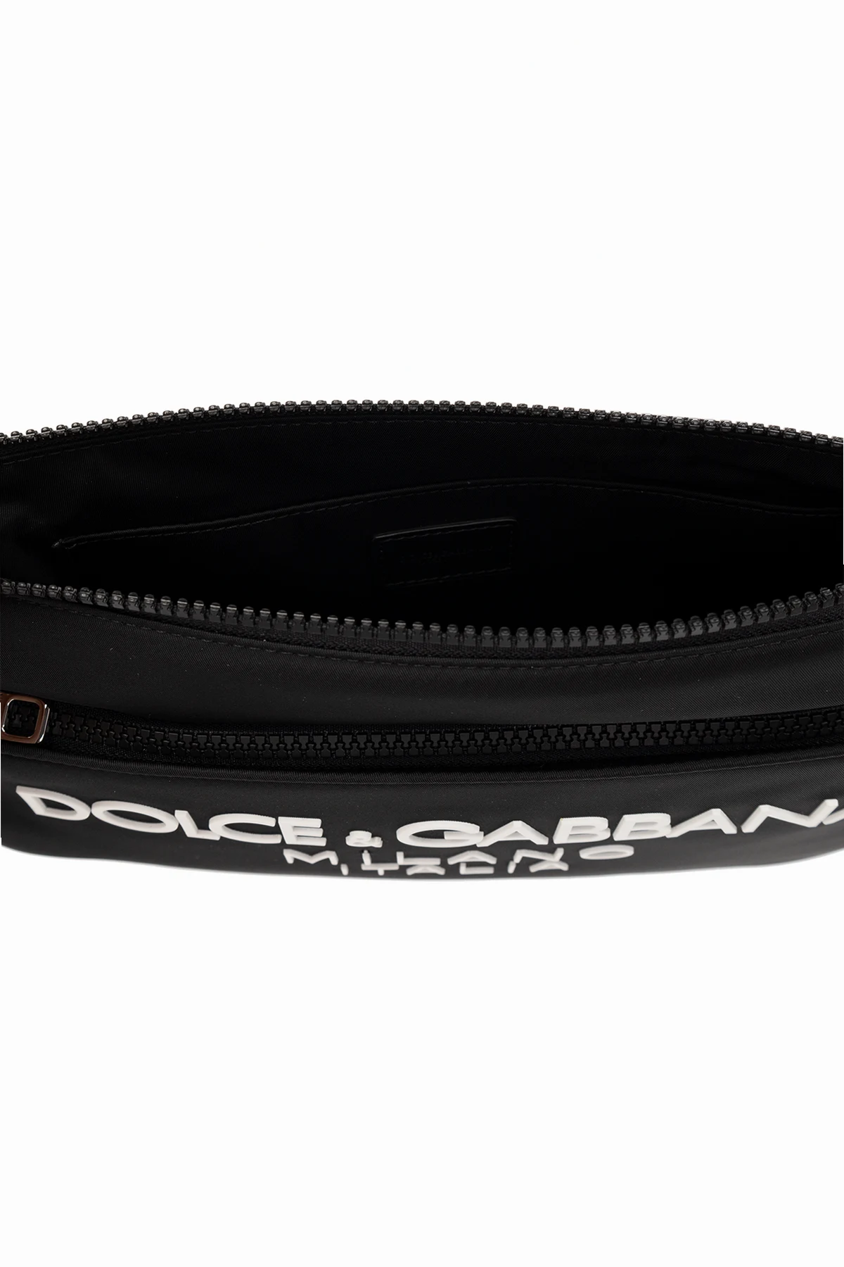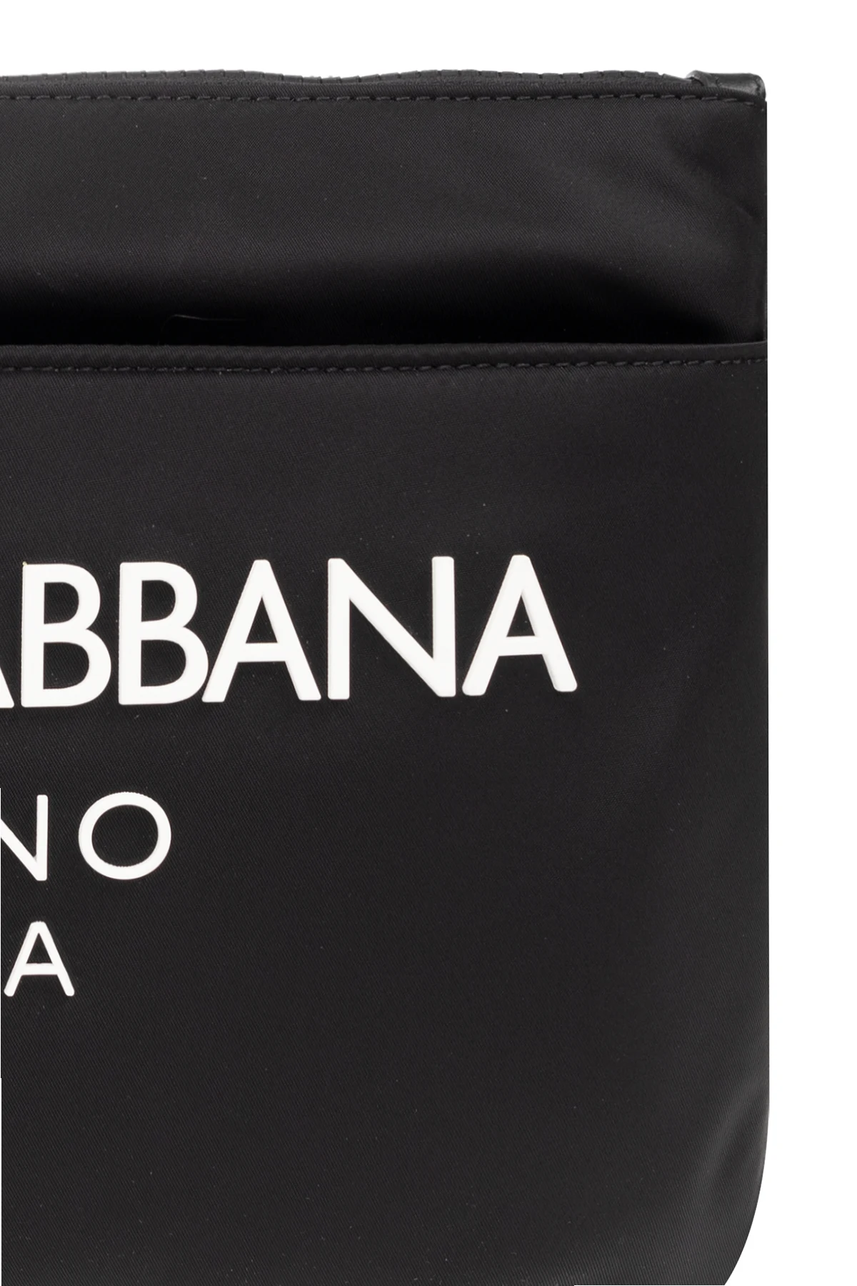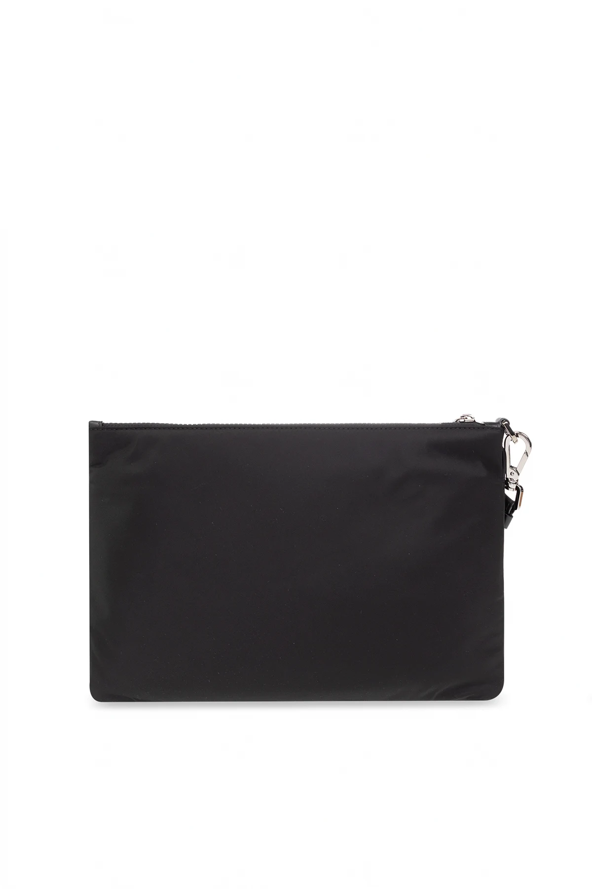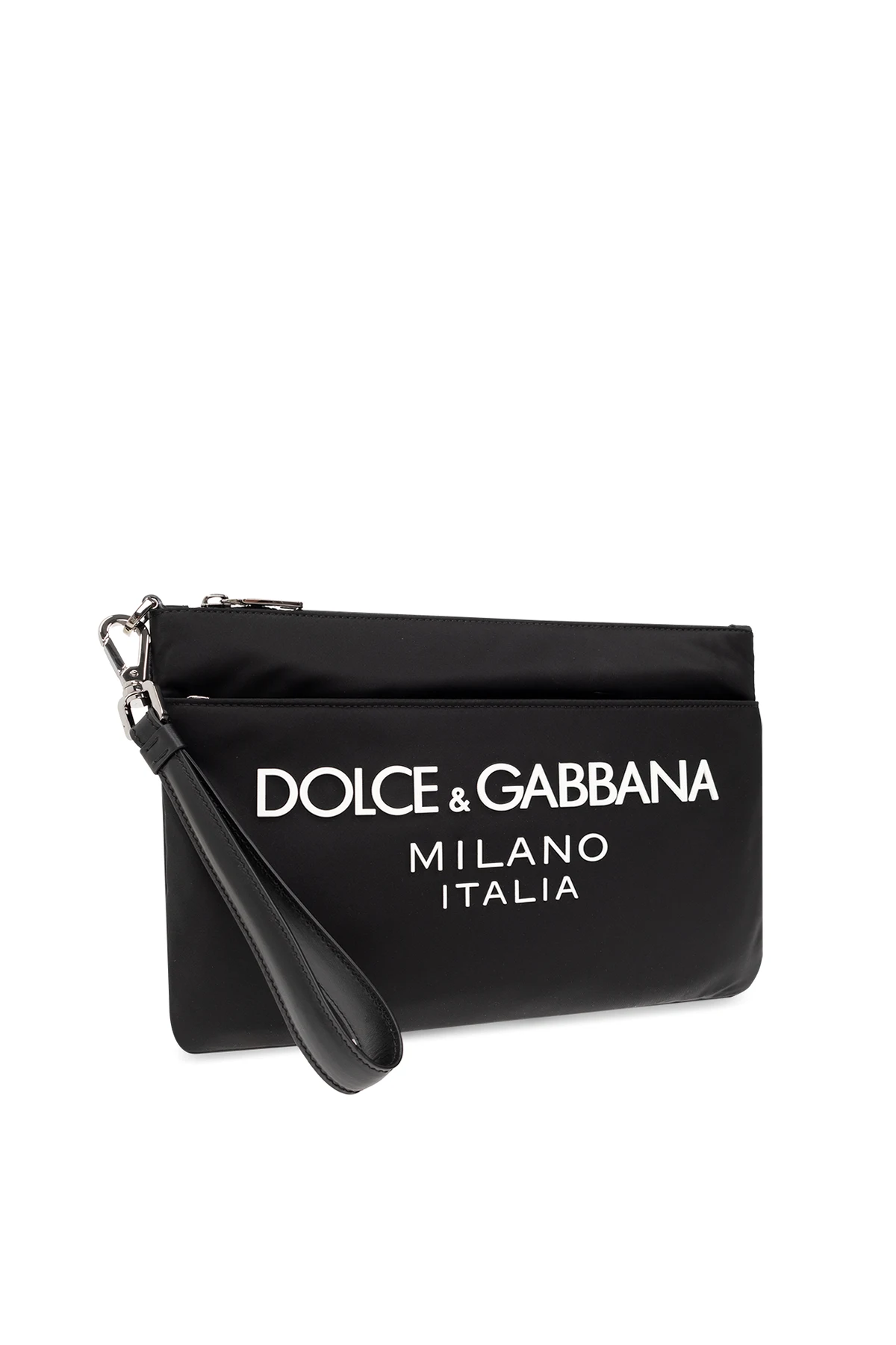Black handbag from Dolce & Gabbana. Crafted from fabric with calf leather trims, this design features a zip fastening, white rubber logo, zipped front pocket, detachable wrist strap, silver-tone metal hardware and one internal compartment with one slip pocket.