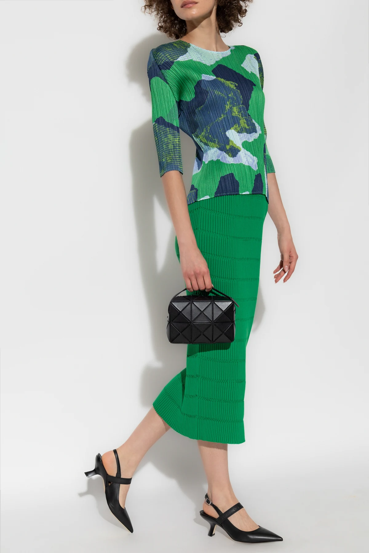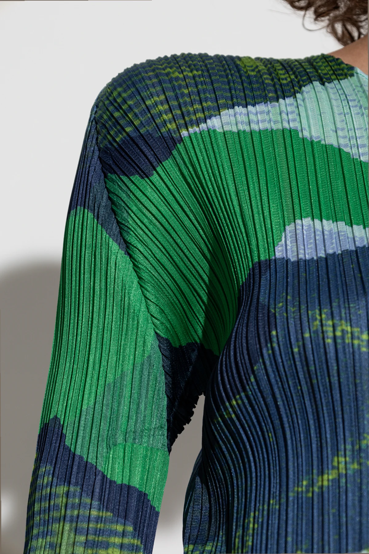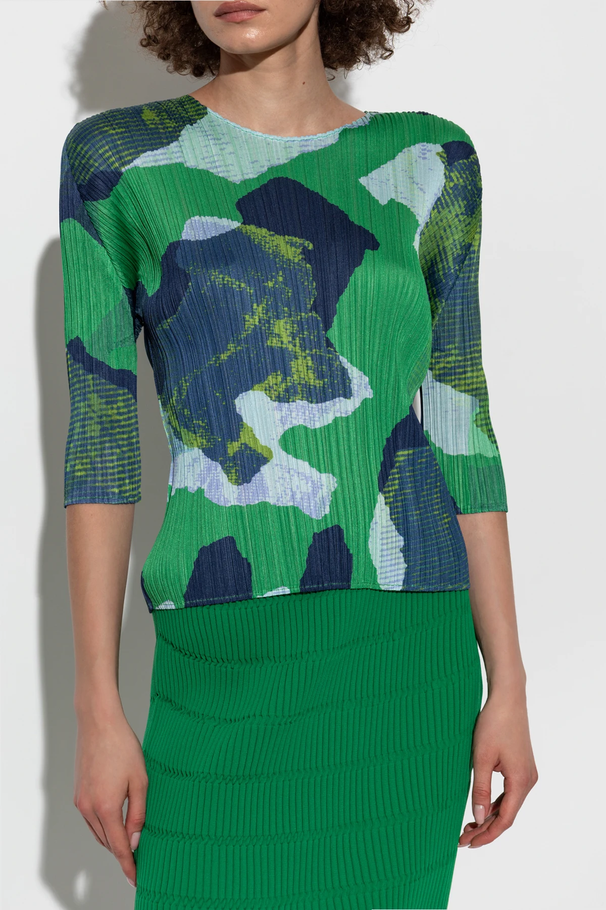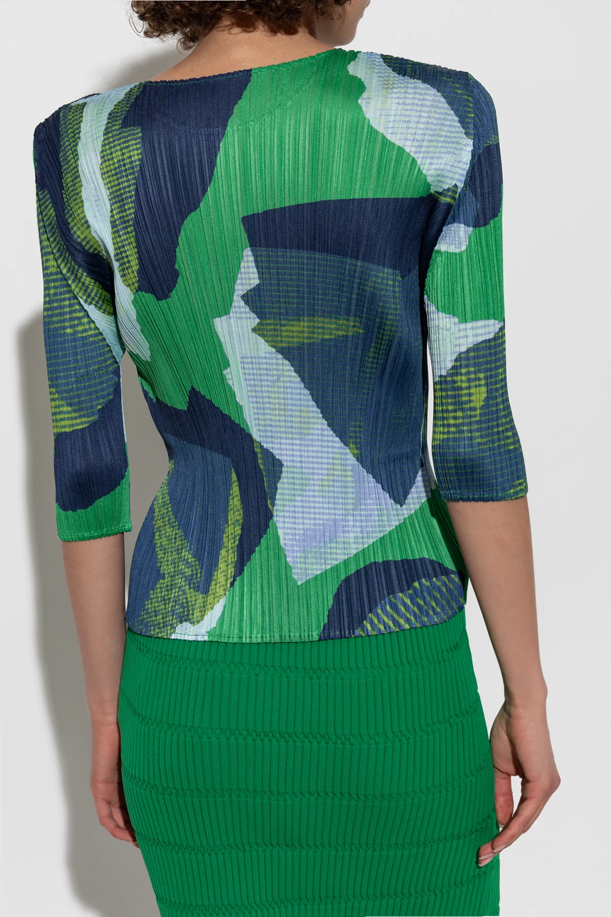 Wir präsentieren das plissierte Top mit Druck aus der exklusiven Kollektion des renommierten Designers Pleats Please Issey Miyake . Dieses außergewöhnliche Top besticht durch seinen einfachen, klassischen Schnitt mit 3/4-Ärmeln, der ihm zeitlose Eleganz verleiht.